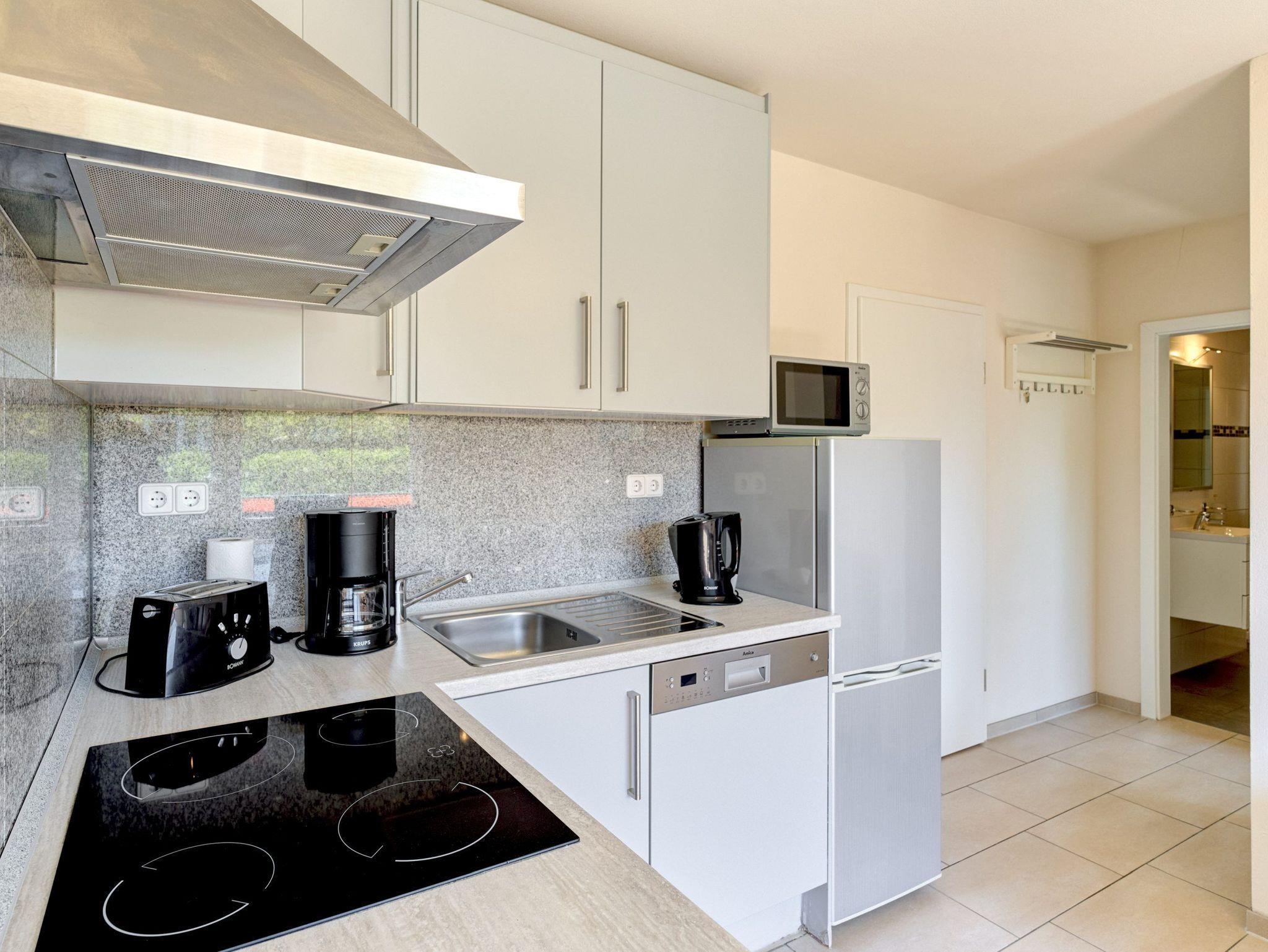 Die offene Einbauküche ist komplett ausgestattet mit einem Herd inkl. Backofen und Cerankochfeld, Geschirrspüler, Kühlschrank mit Gefrierfach, Kaffeemaschine, Toaster, Mikrowelle und Wasserkocher.