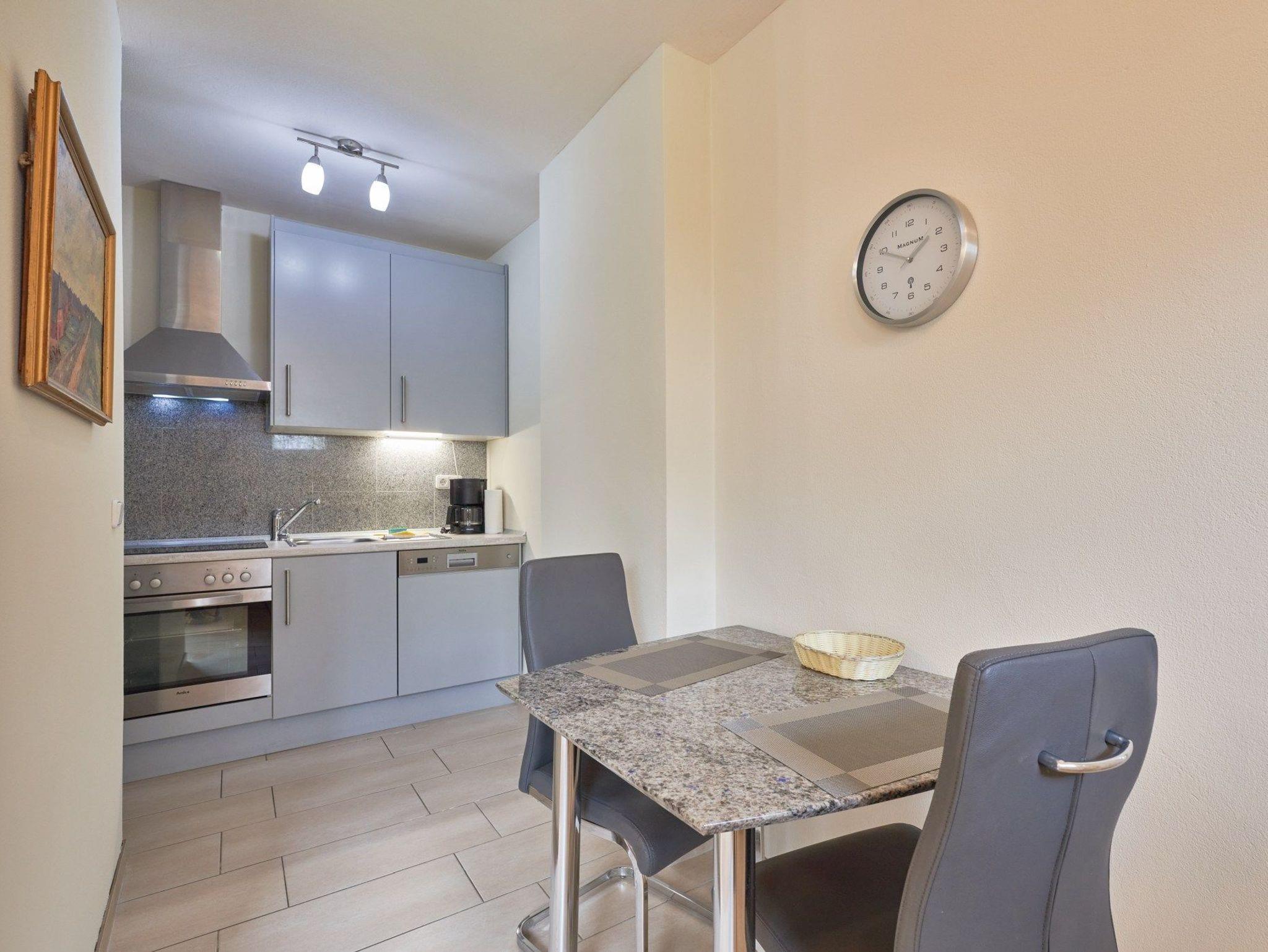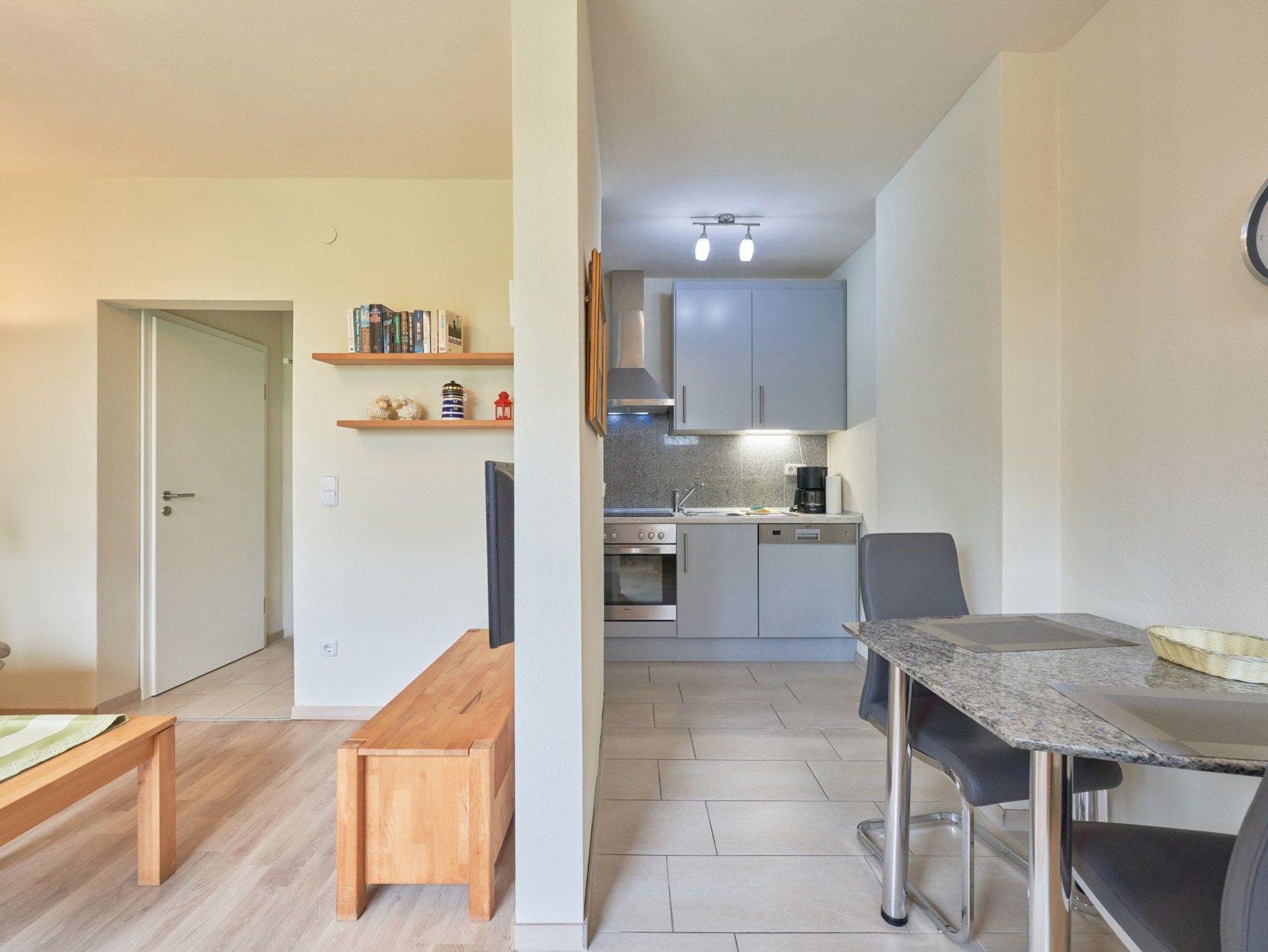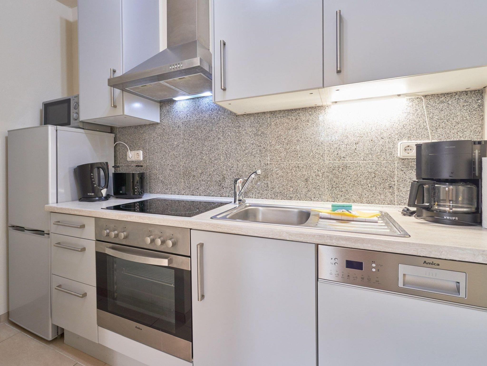 Die offene Einbauküche ist komplett ausgestattet mit einem Herd inkl. Backofen und Cerankochfeld, Geschirrspüler, Kühlschrank mit Gefrierfach, Kaffeemaschine, Toaster, Mikrowelle und Wasserkocher.