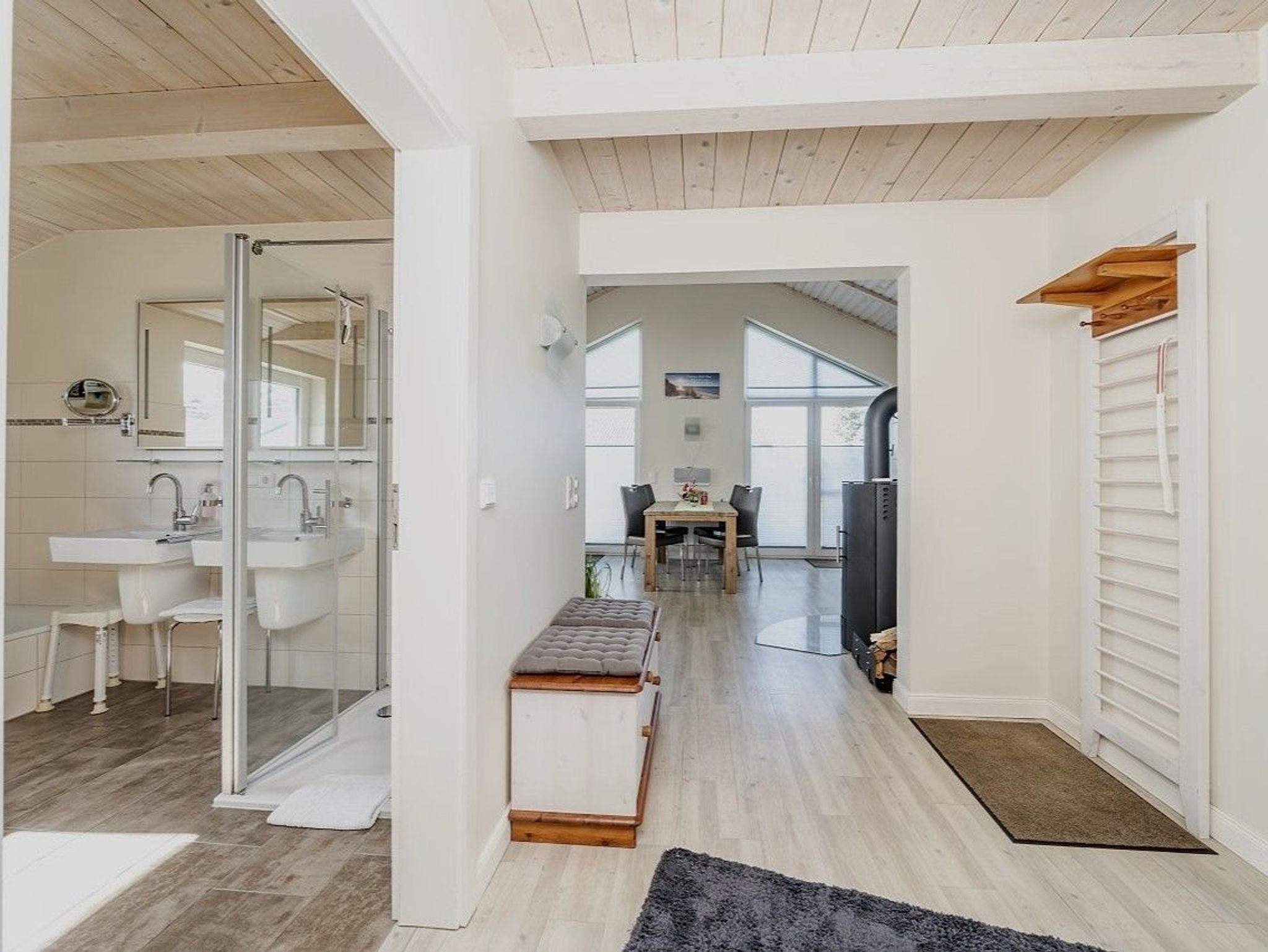 Dieses moderne, 80 m² große Ferienhaus in Dagebüll bietet Platz für bis zu 4 Gäste und 2 Hunde ? perfekt für Familien oder Paare, die Komfort und Abwechslung suchen. Zwei gemütliche Schlafzimmer mit Doppelbetten, ein stilvolles Bad mit Dusche und Badewanne sowie ein heller Wohnbereich mit Kaminofen schaffen eine behagliche Atmosphäre.