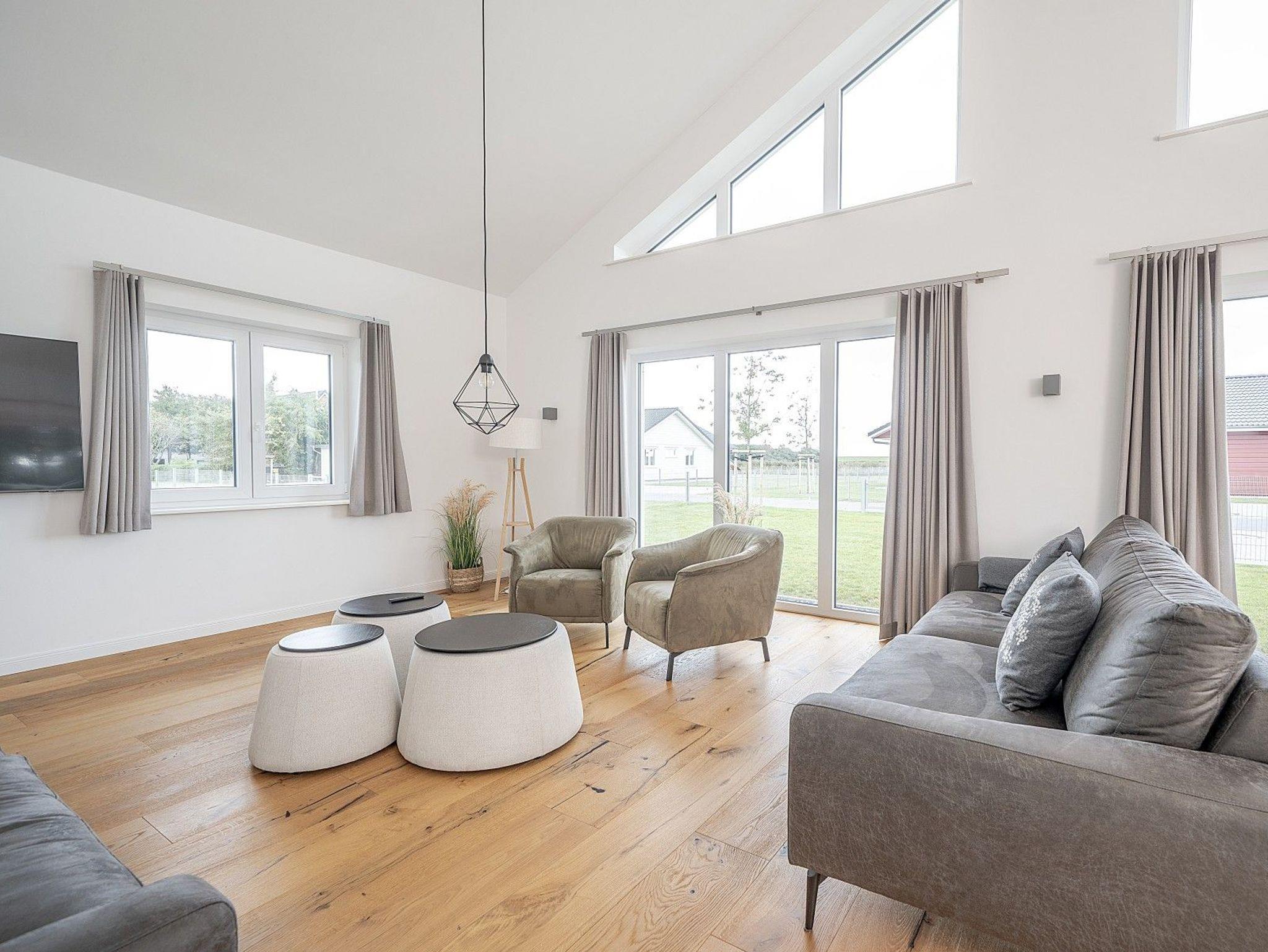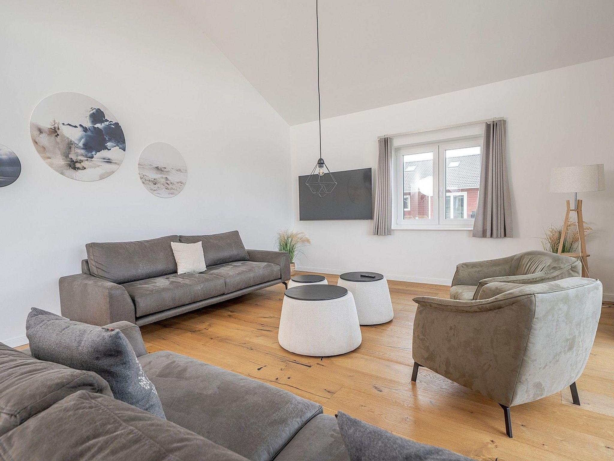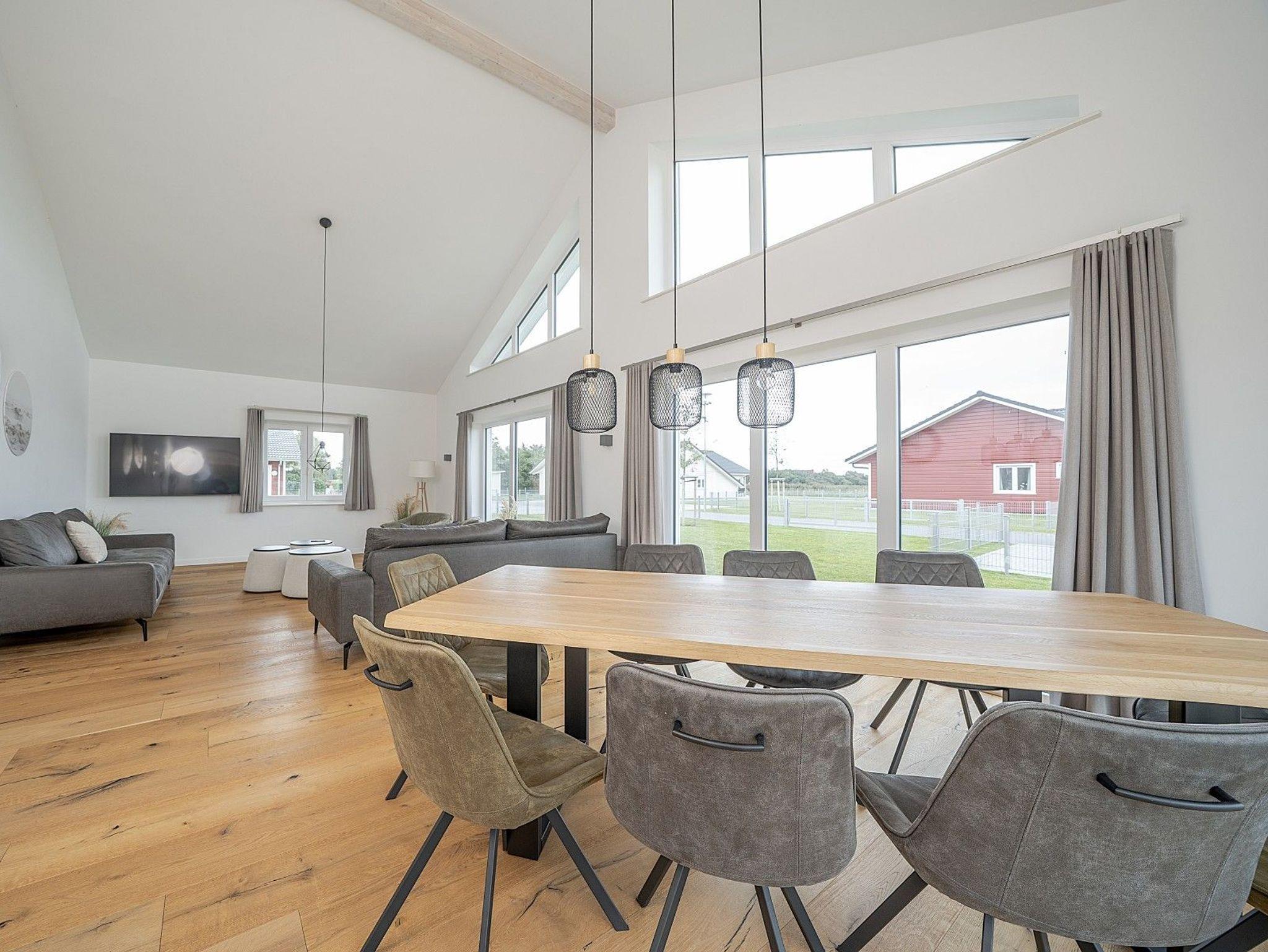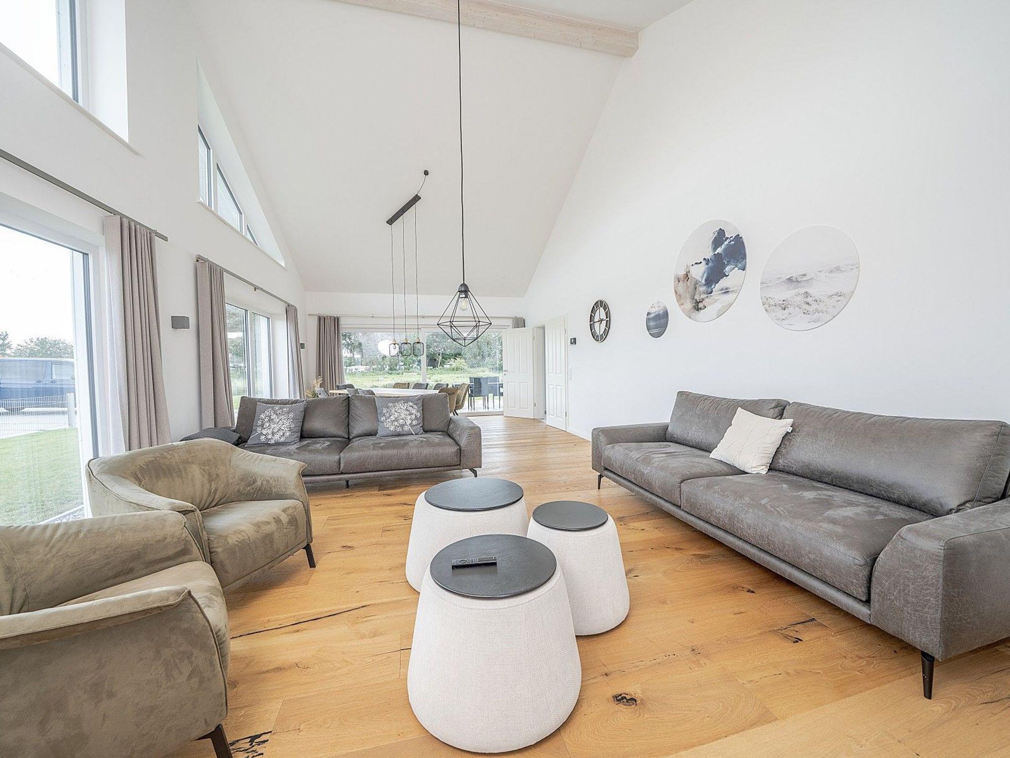 Der helle Wohnbereich mit großen Fensterfronten schafft eine einladende Atmosphäre und bietet Raum für gemeinsame Stunden beim Kochen, Essen und Entspannen. Sechs Schlafzimmer und vier Bäder sorgen für ausreichend Rückzugsmöglichkeiten, während die hauseigene Sauna nach einem Tag an der frischen Nordseeluft wohltuende Entspannung verspricht.