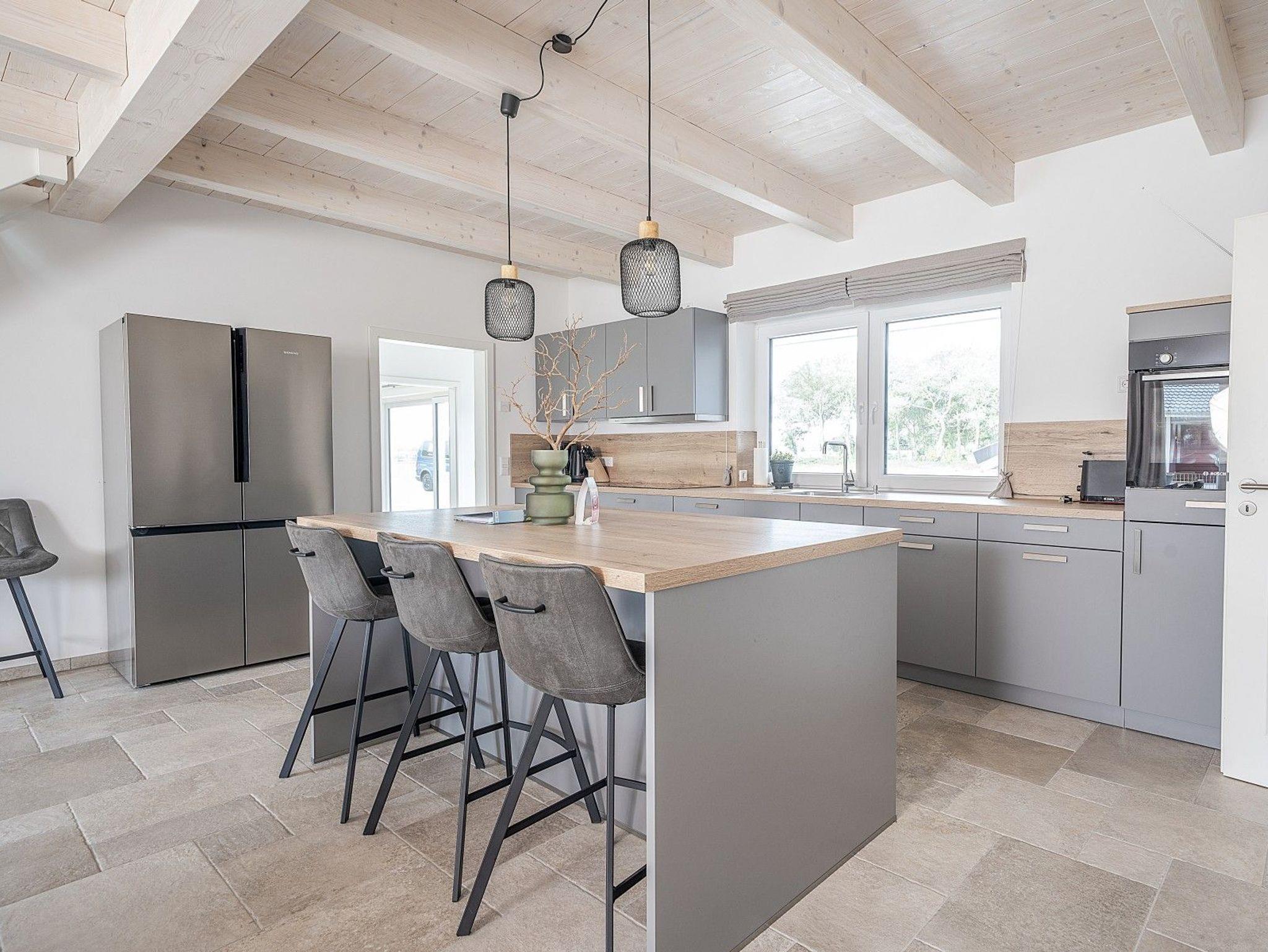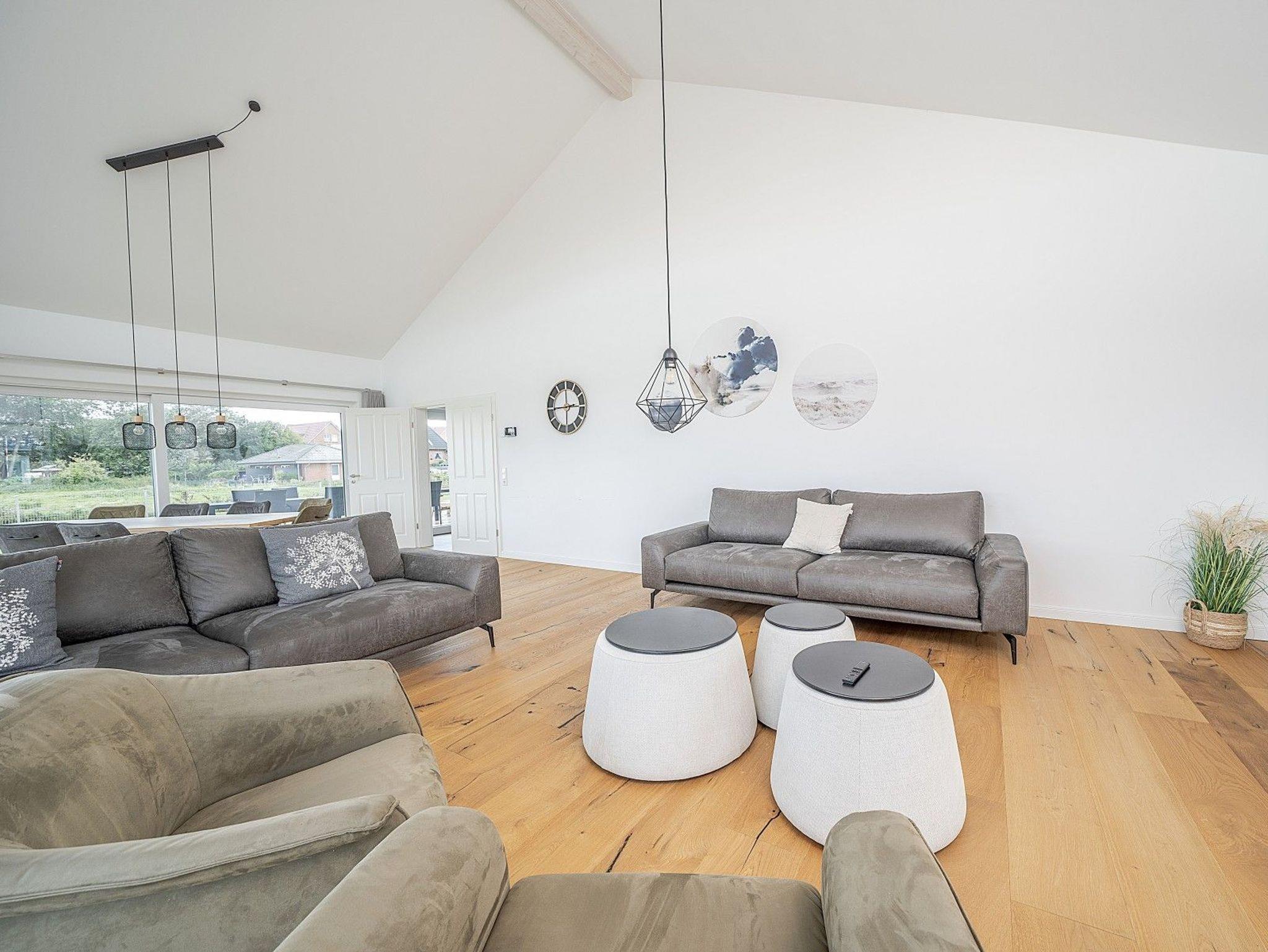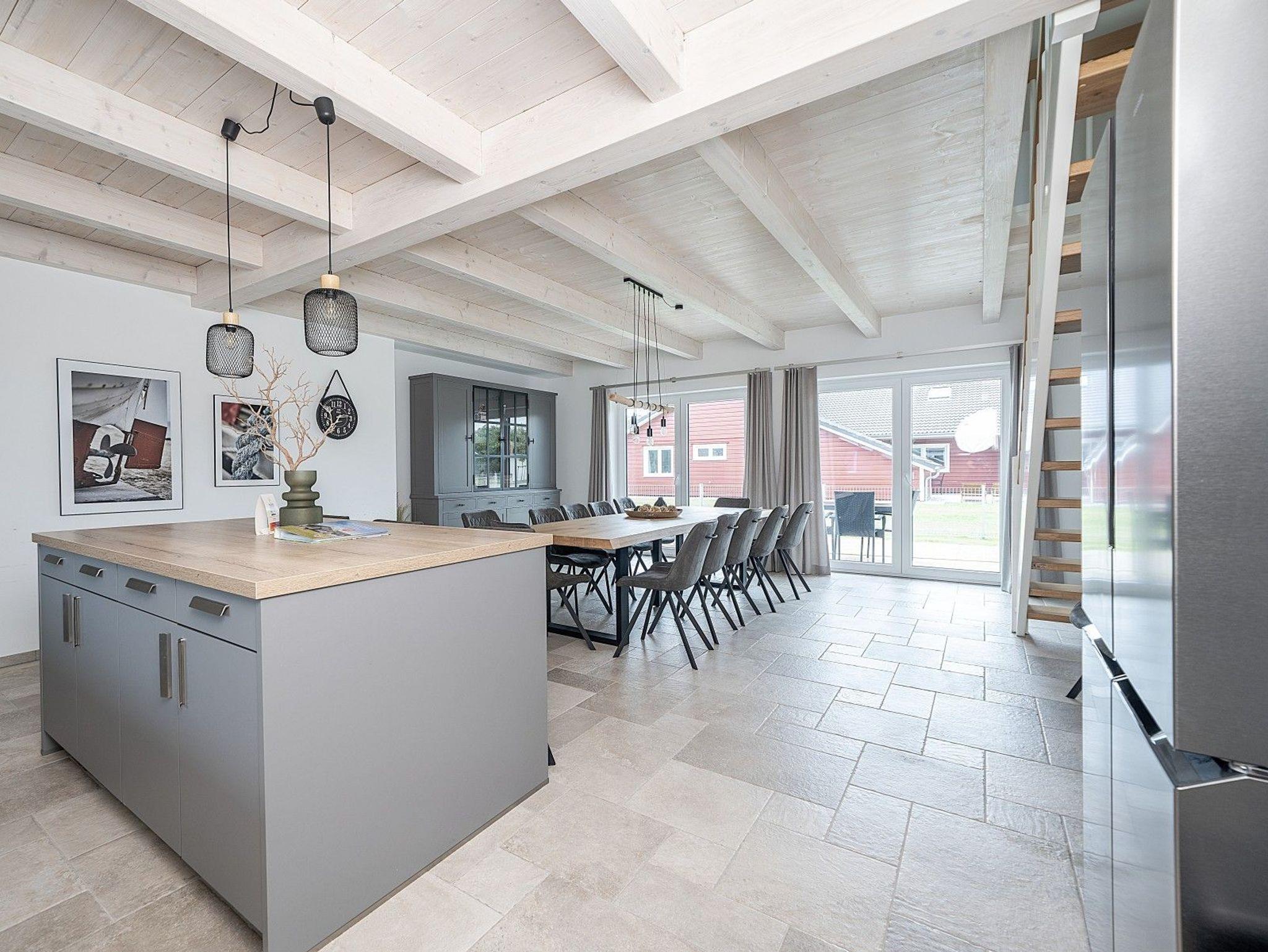 Der helle Wohnbereich mit großen Fensterfronten schafft eine einladende Atmosphäre und bietet Raum für gemeinsame Stunden beim Kochen, Essen und Entspannen. Sechs Schlafzimmer und vier Bäder sorgen für ausreichend Rückzugsmöglichkeiten, während die hauseigene Sauna nach einem Tag an der frischen Nordseeluft wohltuende Entspannung verspricht.