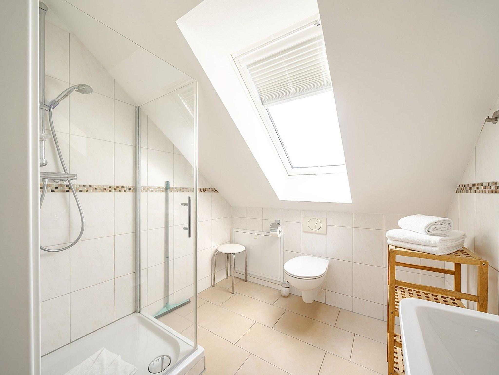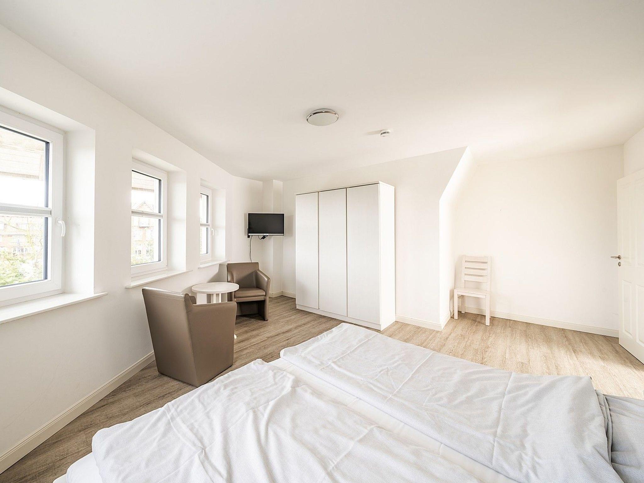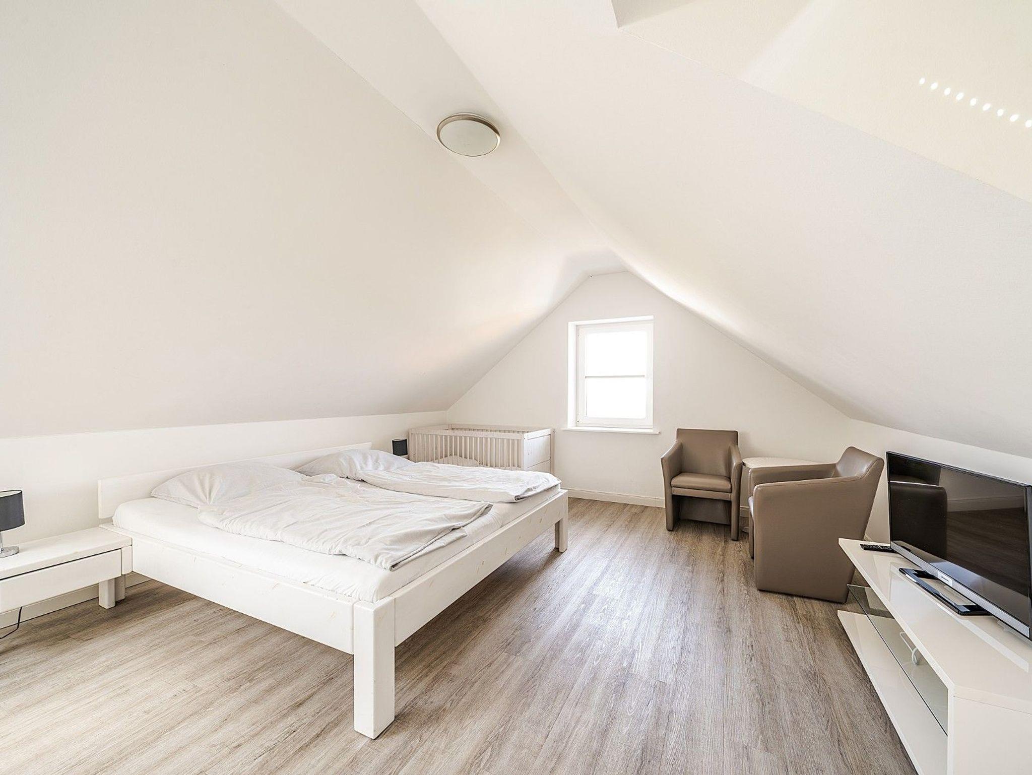 Die 6 Schlafzimmer verteilen sich auf zwei Etagen. Im Dachgeschoss befinden sich drei großzügige Doppelzimmer, jeweils mit eigenem Bad und kleiner Teeküche. Im 1. Obergeschoss liegen drei weitere Schlafzimmer, die sich ein großes Bad mit XXL-Dusche und Badewanne sowie ein separates WC teilen. Die Wohnung verfügt über kostenloses WLAN und mehrere TV-Geräte. Zwei kostenfreie Parkplätze befinden sich in der Nähe, weitere Stellplätze sind auf einem Großparkplatz (ca. 500m) verfügbar.