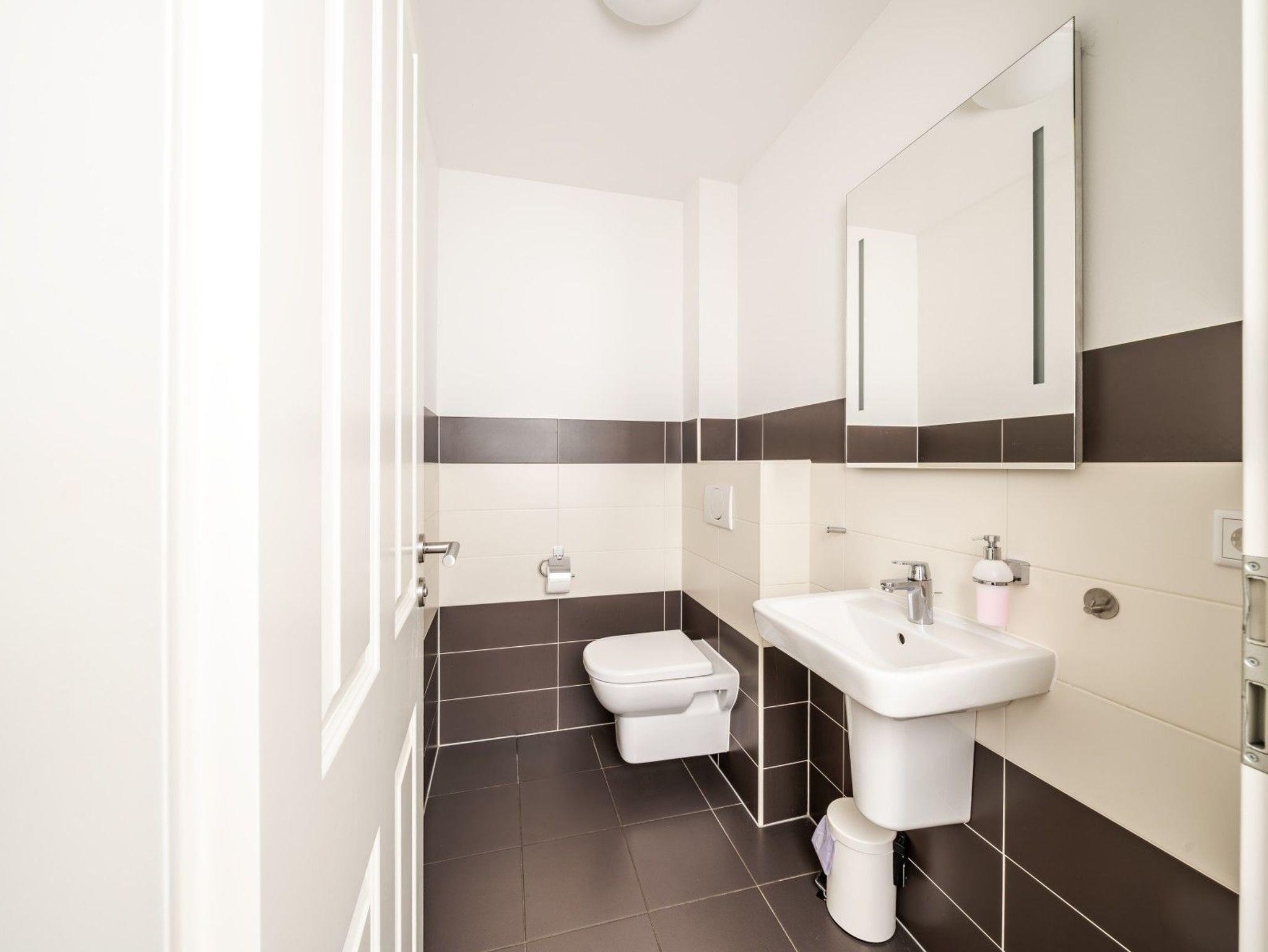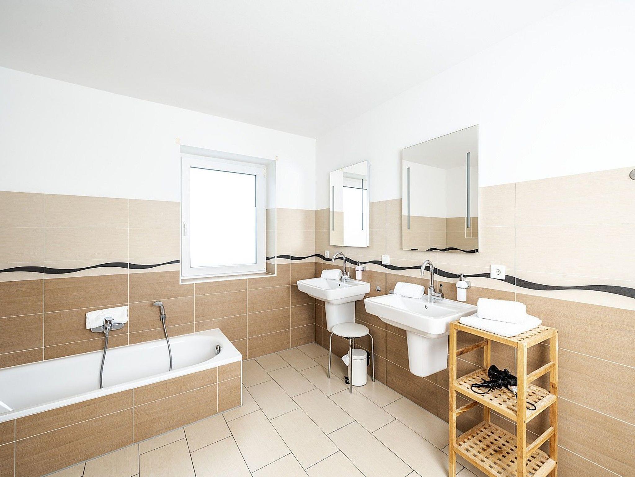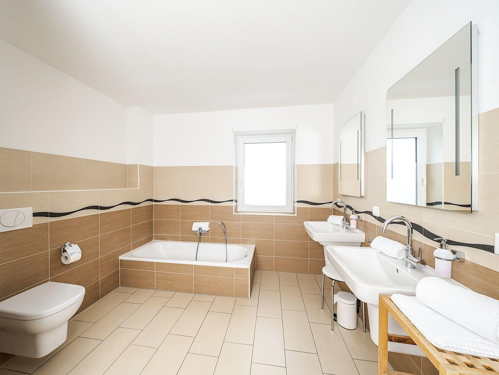Die 6 Schlafzimmer verteilen sich auf zwei Etagen. Im Dachgeschoss befinden sich drei großzügige Doppelzimmer, jeweils mit eigenem Bad und kleiner Teeküche. Im 1. Obergeschoss liegen drei weitere Schlafzimmer, die sich ein großes Bad mit XXL-Dusche und Badewanne sowie ein separates WC teilen. Die Wohnung verfügt über kostenloses WLAN und mehrere TV-Geräte. Zwei kostenfreie Parkplätze befinden sich in der Nähe, weitere Stellplätze sind auf einem Großparkplatz (ca. 500m) verfügbar.