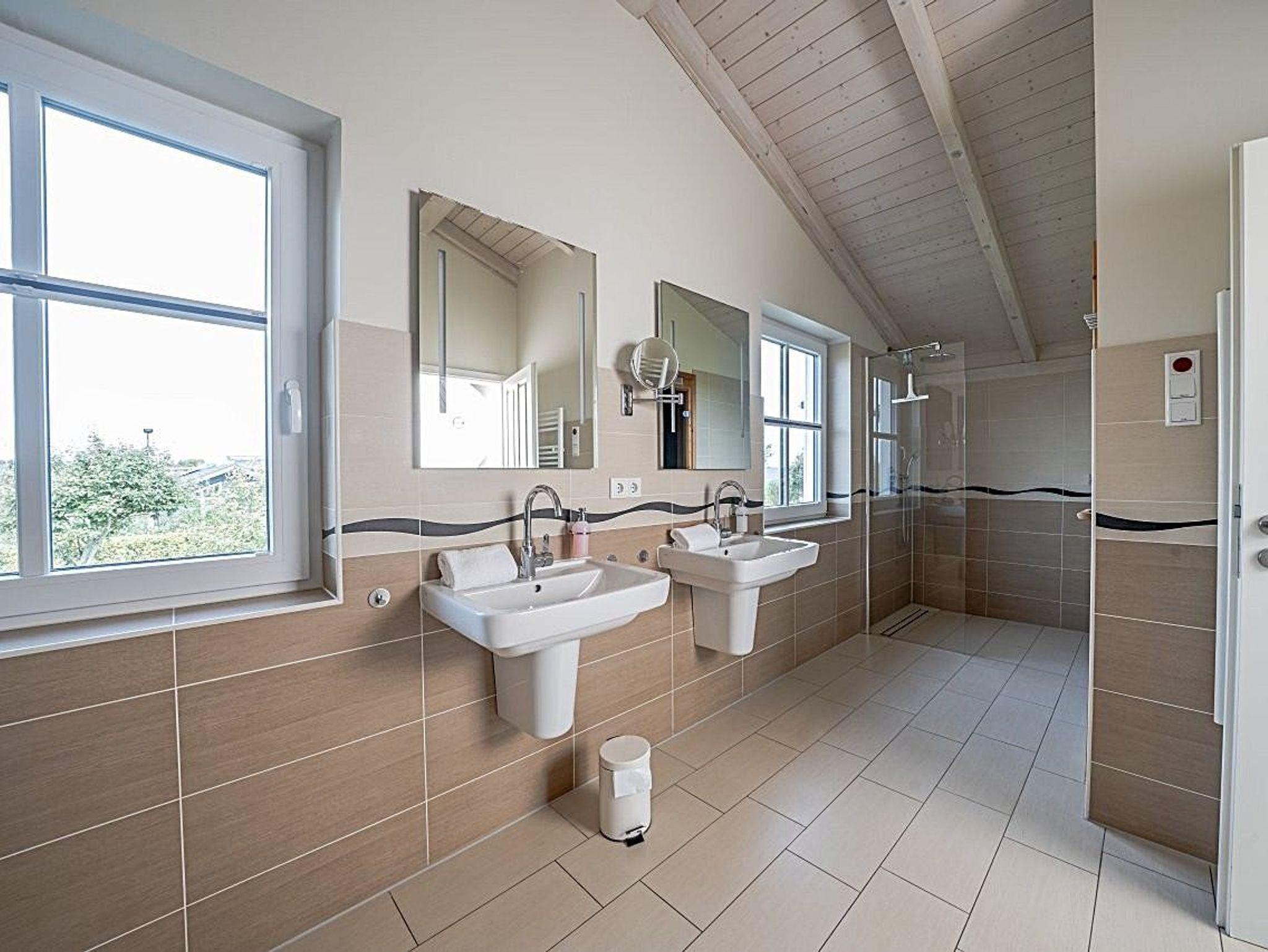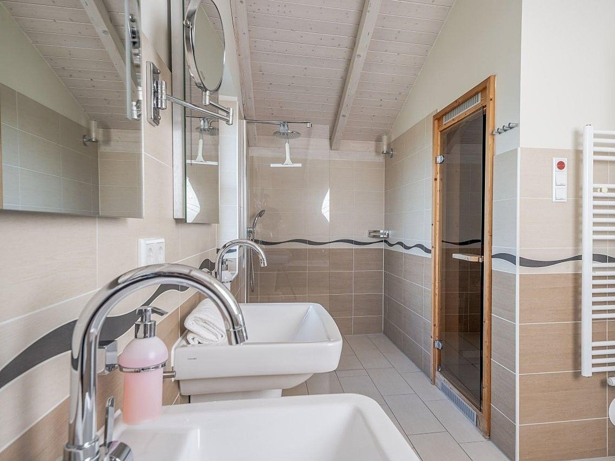 Im Obergeschoss erwartet Sie ein Wellnessbad mit großzügiger Sauna und einer XXL-Badewanne für zwei Personen. Drei Schlafzimmer bieten angenehme Rückzugsorte, während der helle Wohnbereich mit Kaminofen und voll ausgestatteter Küche zum Verweilen einlädt.