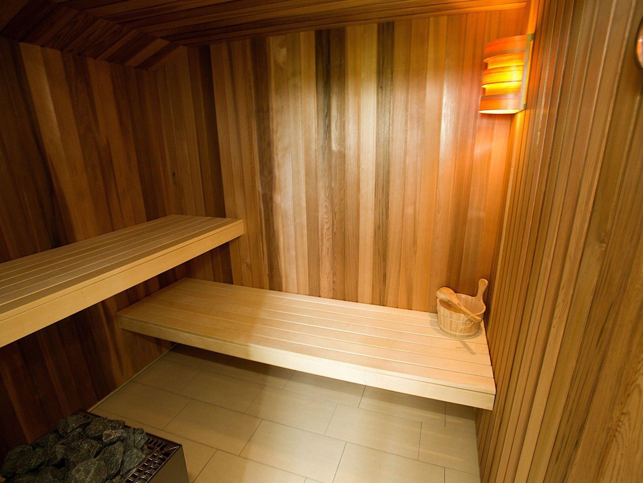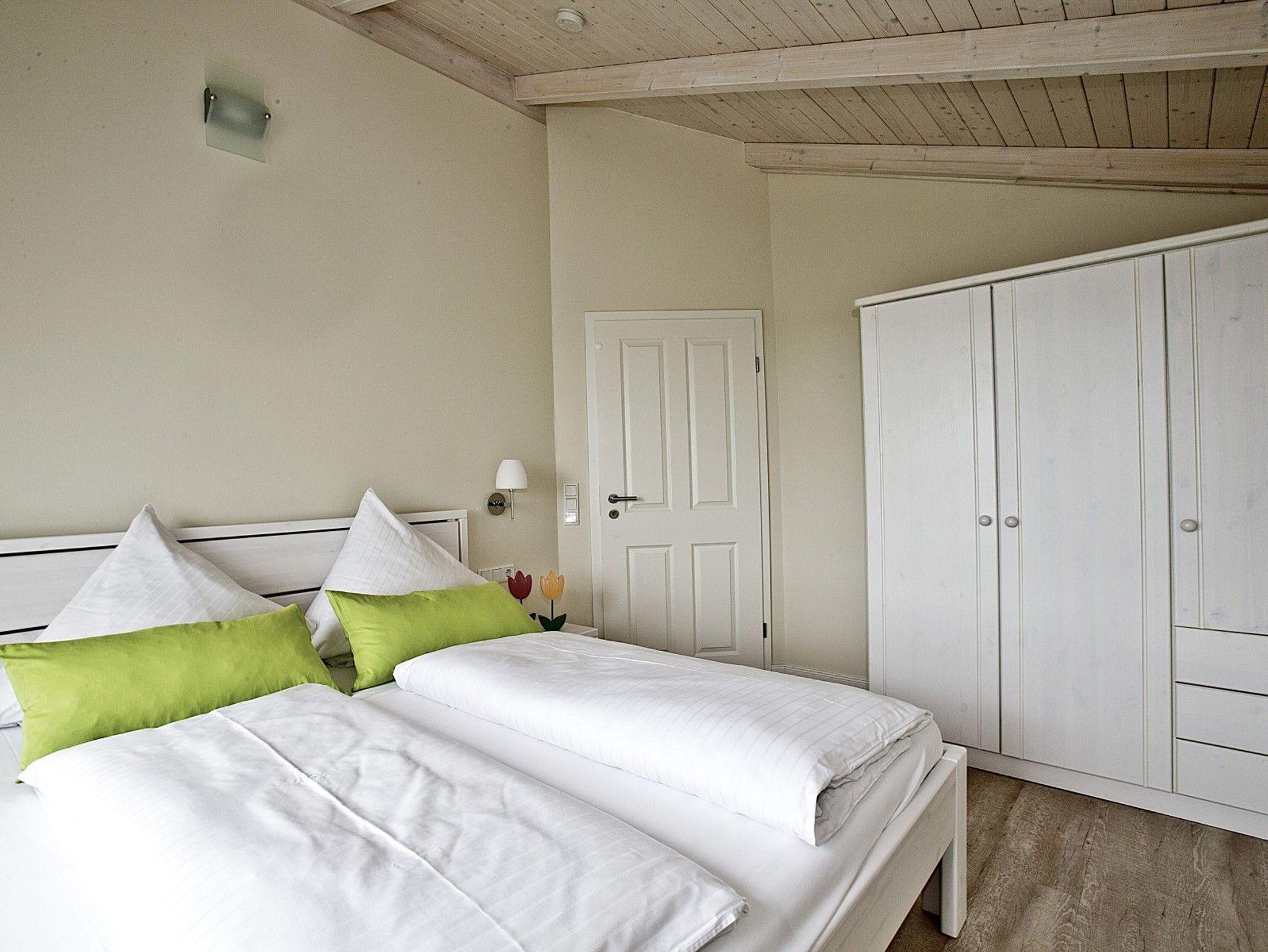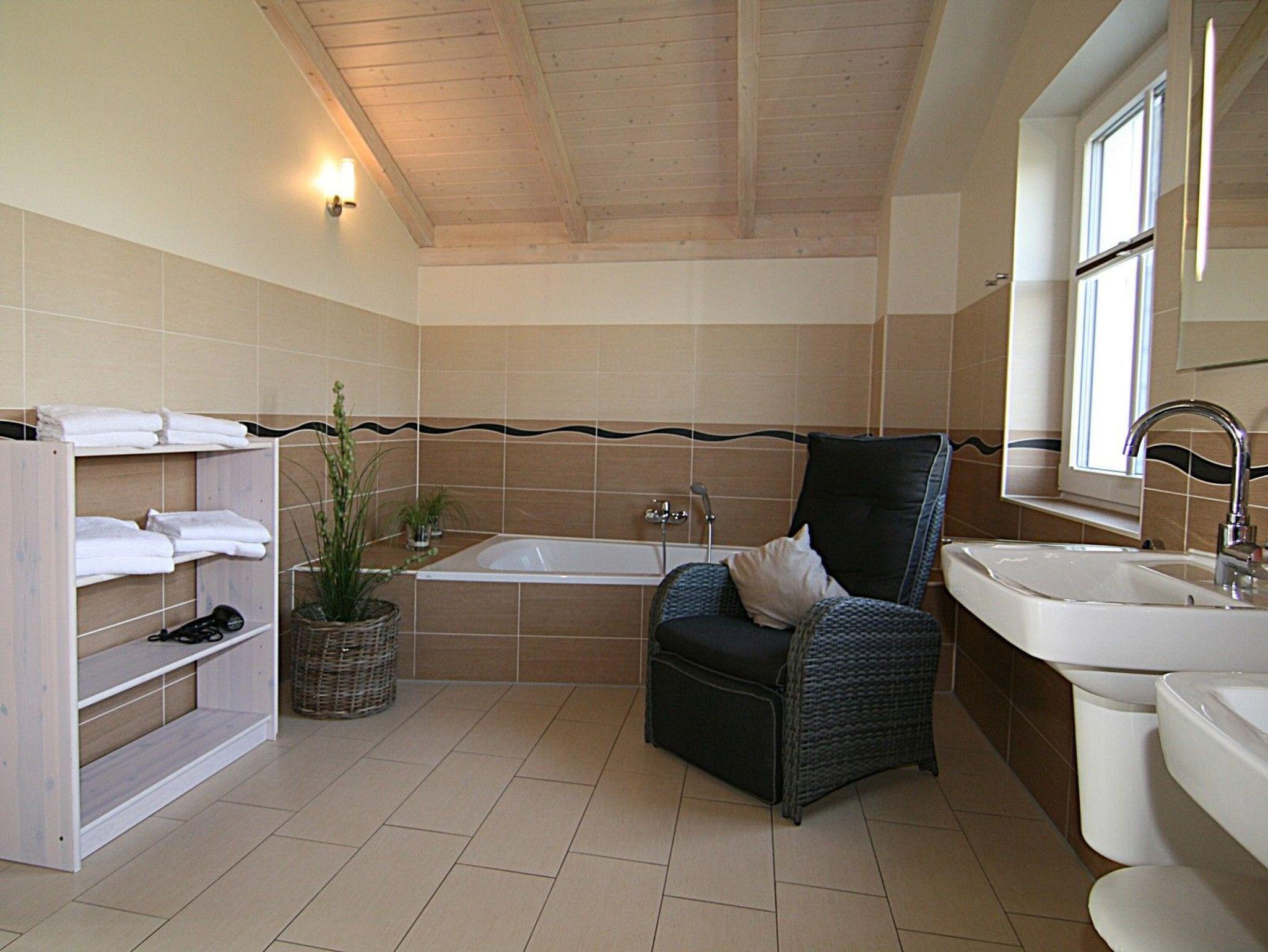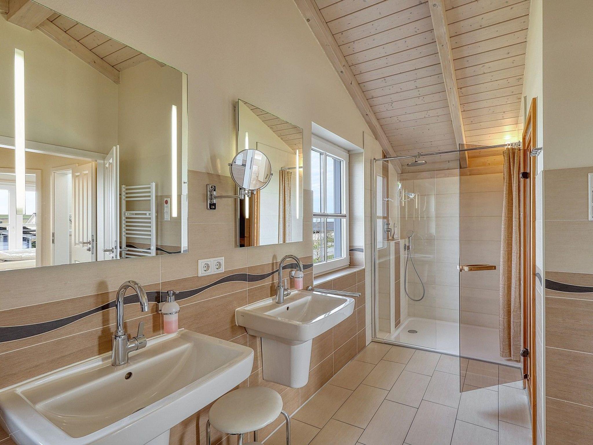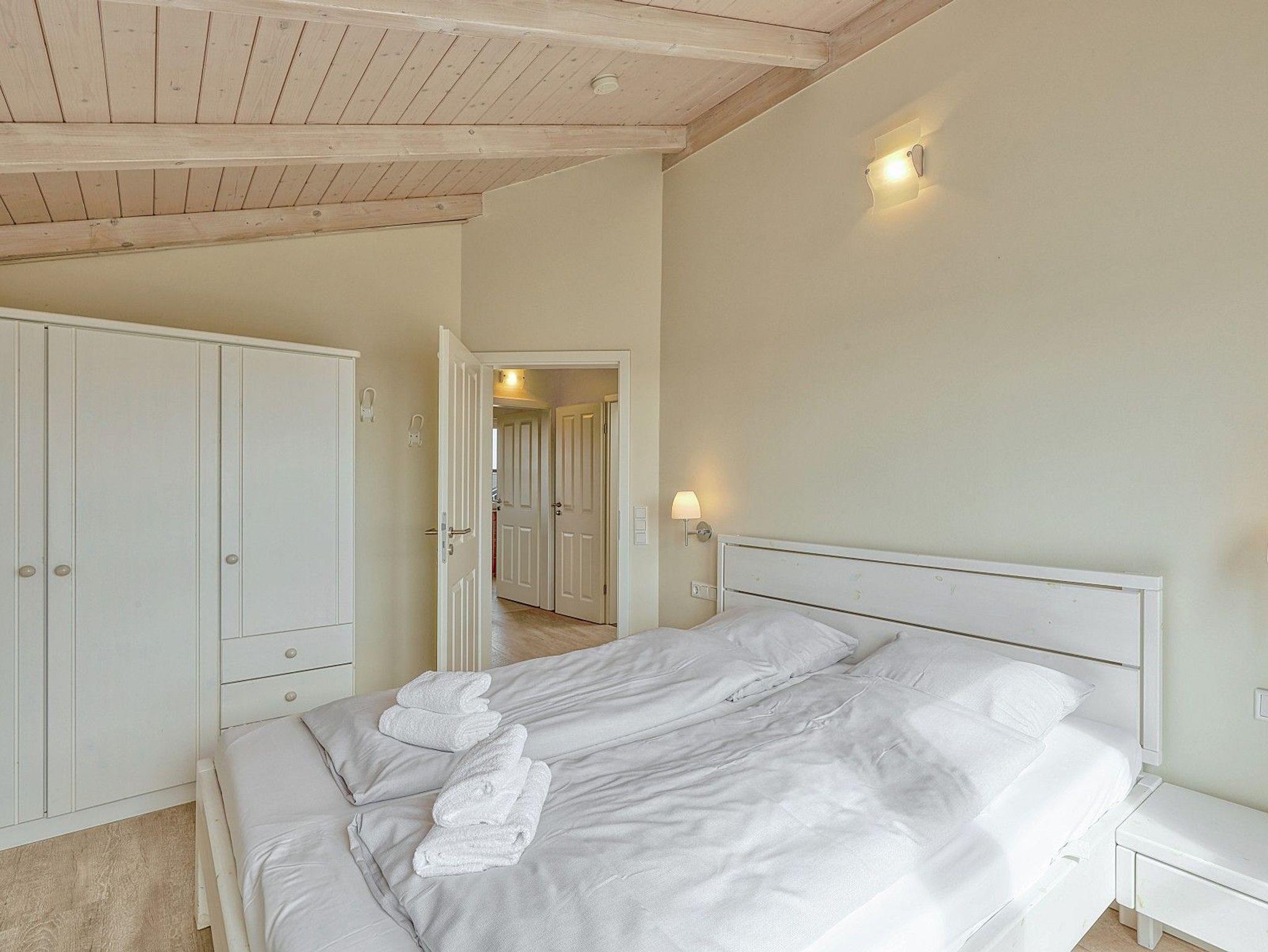 Das Obergeschoss bietet ein stilvolles Wellnessbad mit XXL-Badewanne, großer Sauna und verstellbarer Liege. Zwei weitere Schlafzimmer, eines davon mit besonders festen Matratzen, sorgen für erholsame Nächte.