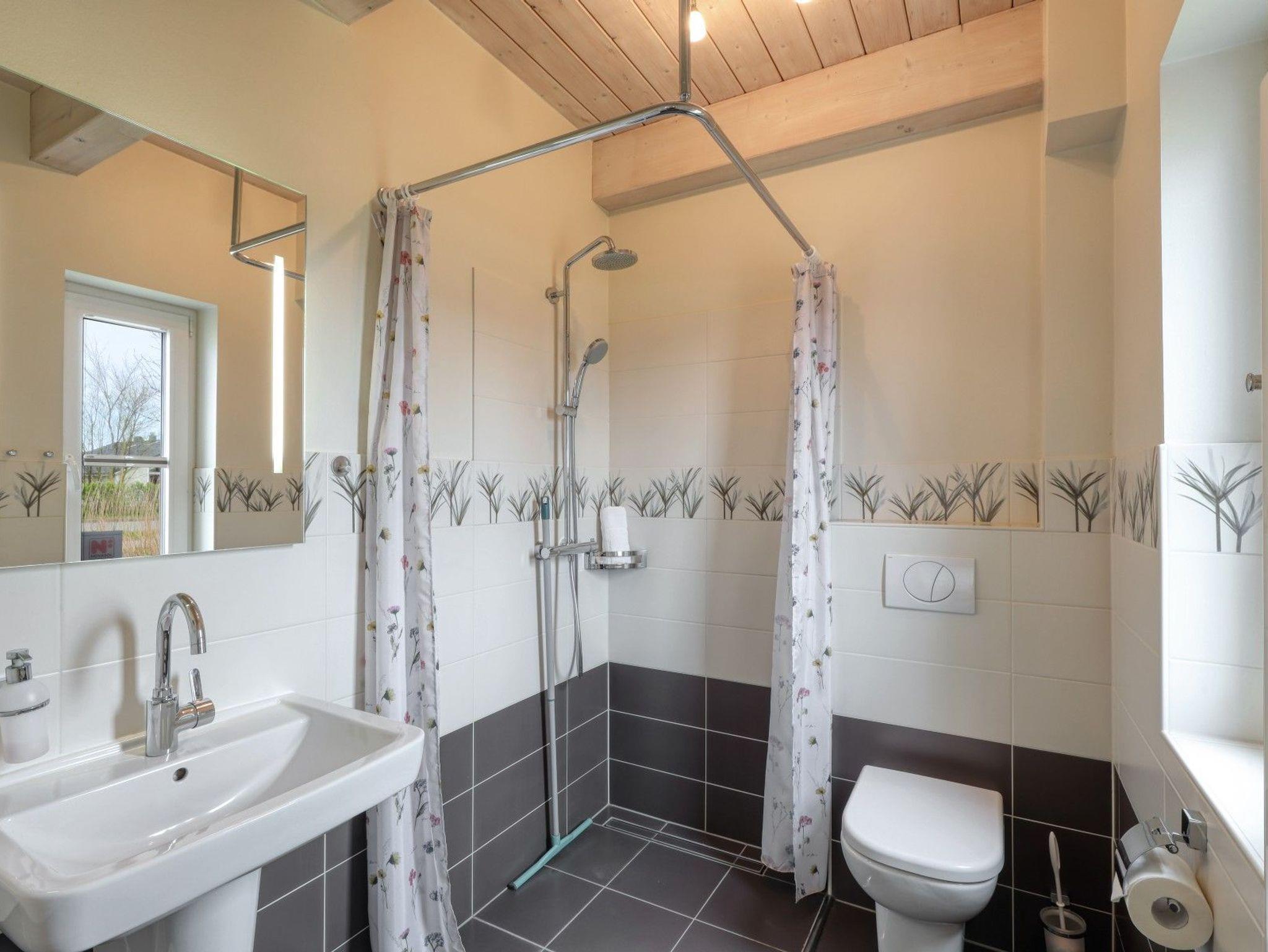 Im Erdgeschoss erwartet Sie eine moderne Wohnküche mit gemütlicher Sofalandschaft und Kaminofen ? der ideale Ort für gemeinsame Stunden. Ein Schlafzimmer mit zwei flexibel stellbaren Einzelbetten befindet sich ebenfalls auf dieser Ebene und eignet sich besonders für Gäste mit eingeschränkter Mobilität.