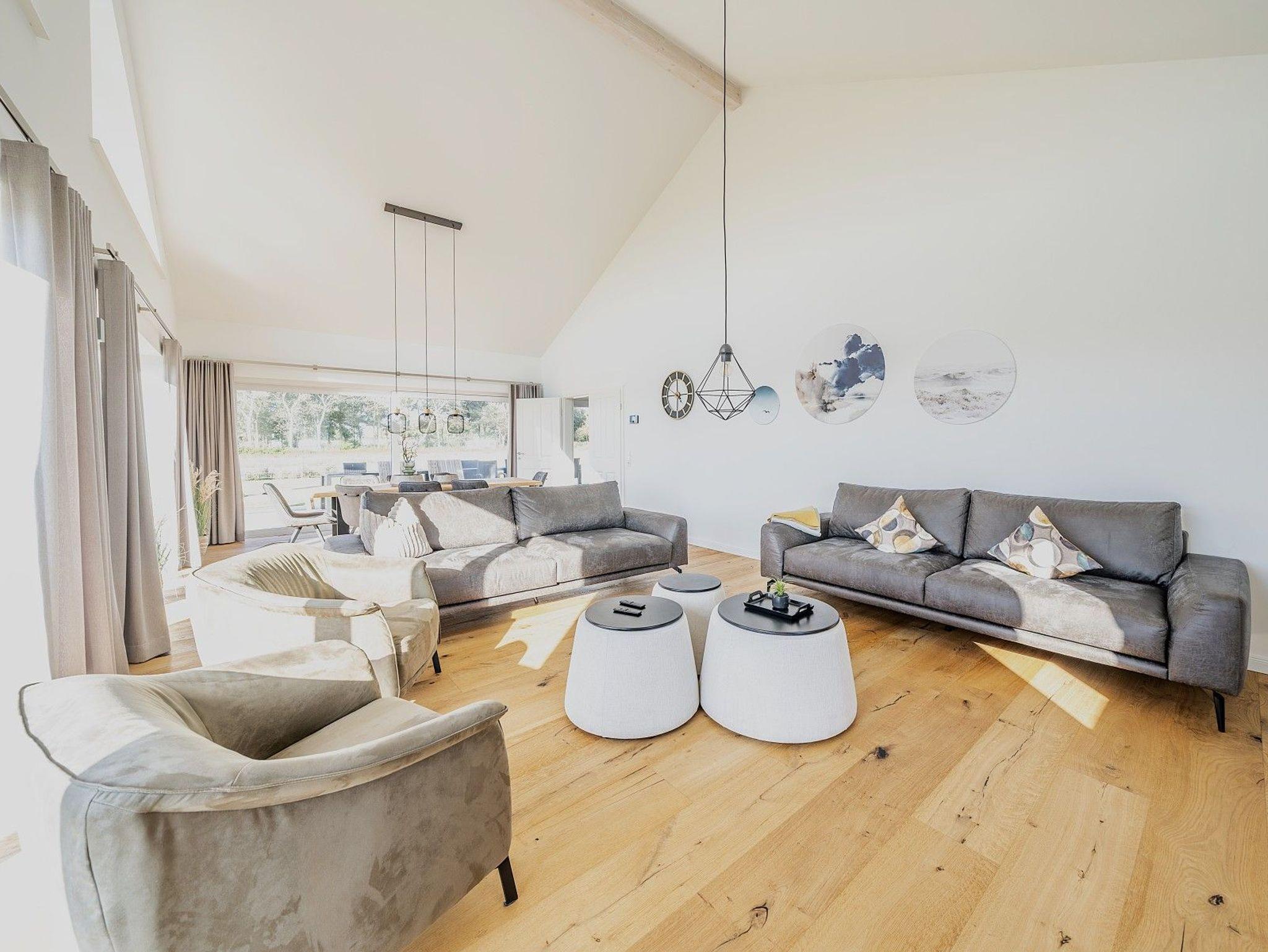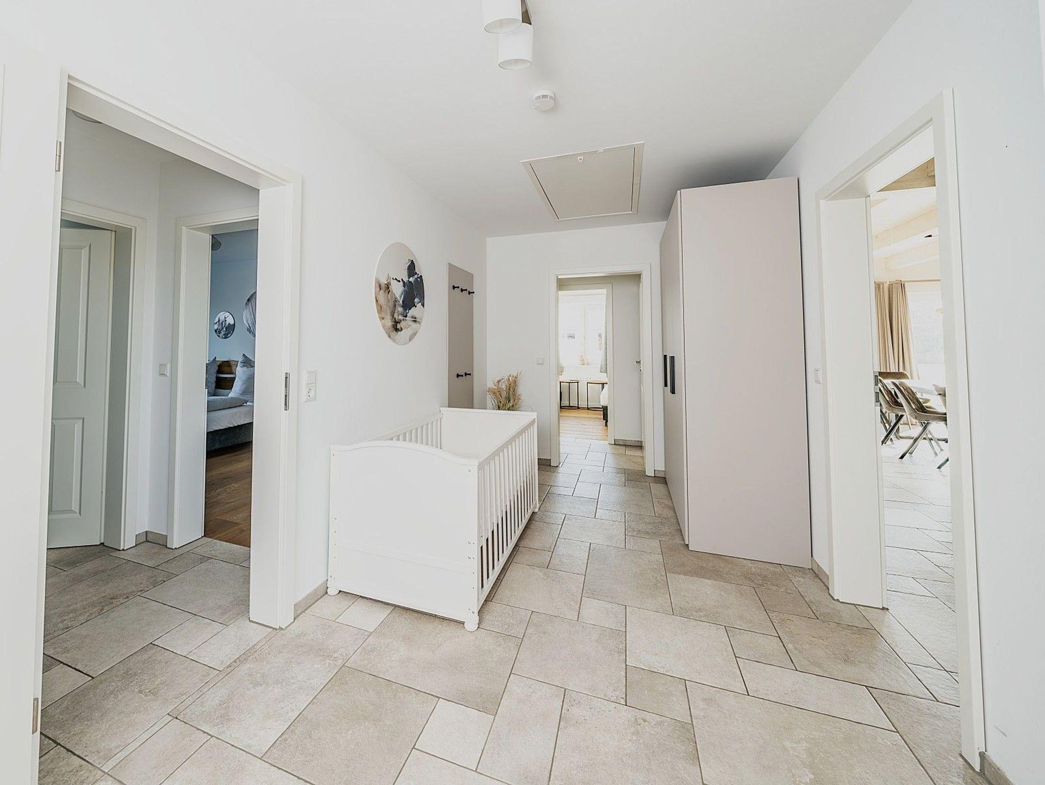 Der großzügige Wohnbereich mit bodentiefen Fenstern schafft eine helle, einladende Atmosphäre und bildet den Mittelpunkt des Hauses. Eine moderne Küche, ein großer Esstisch und gemütliche Sitzbereiche laden zu geselligen Stunden ein. Sechs Schlafzimmer und vier Bäder bieten ausreichend Platz und Privatsphäre. Nach einem Tag an der frischen Nordseeluft sorgt die hauseigene Sauna für Entspannung und Wärme.