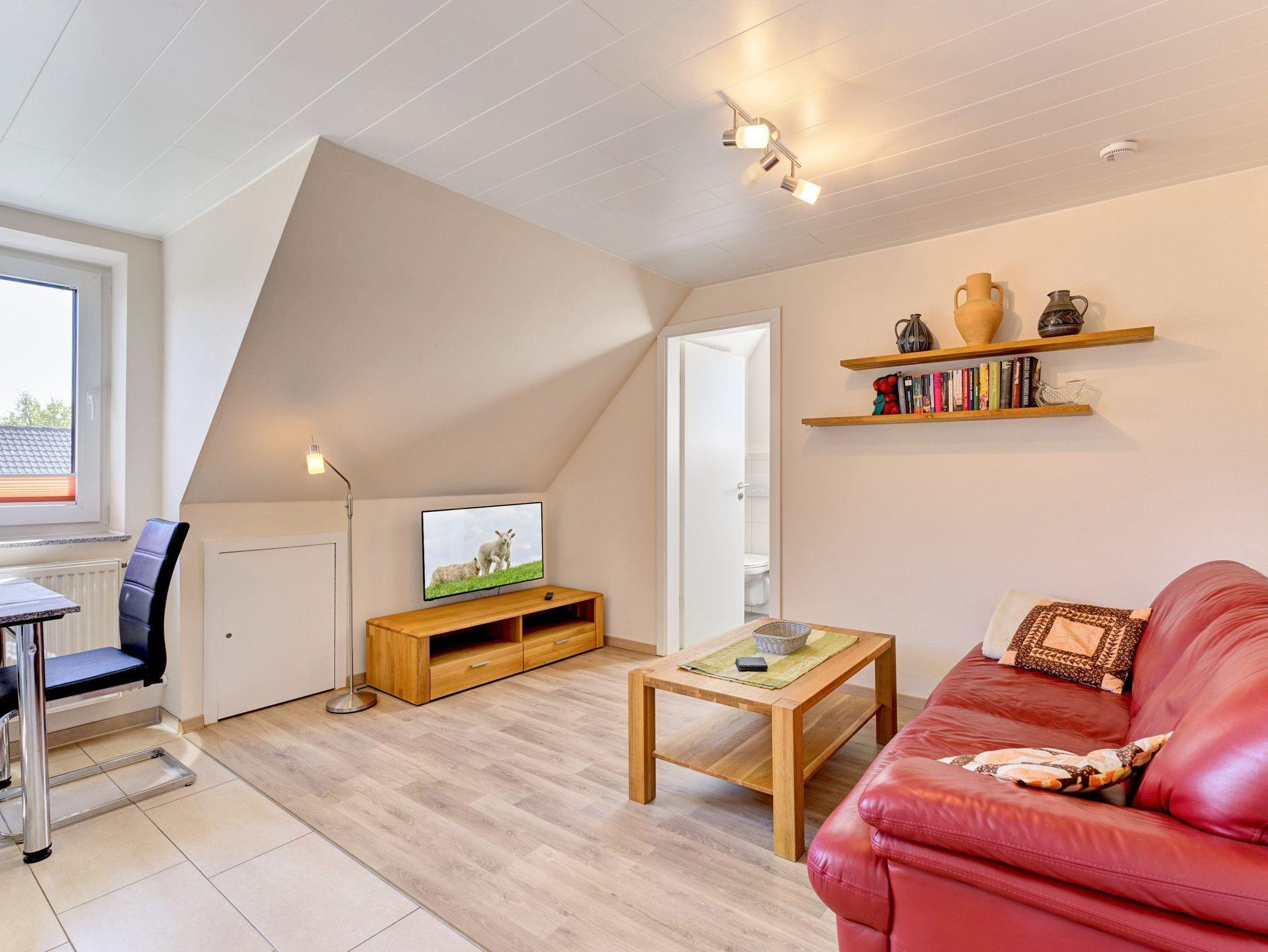 Die 2-Zimmer-Ferienwohnung verfügt über ein Wohnzimmer mit Ledersofa.