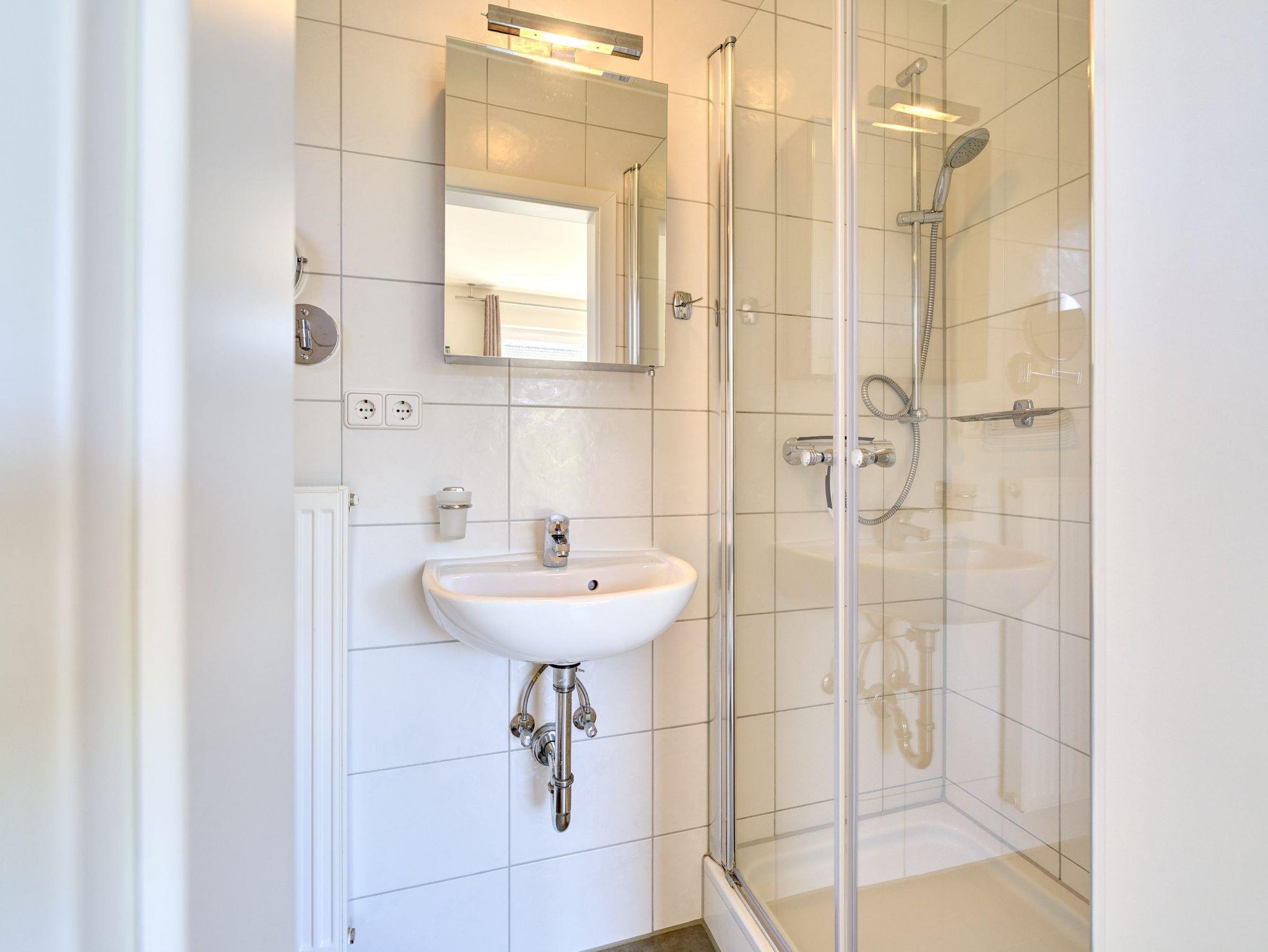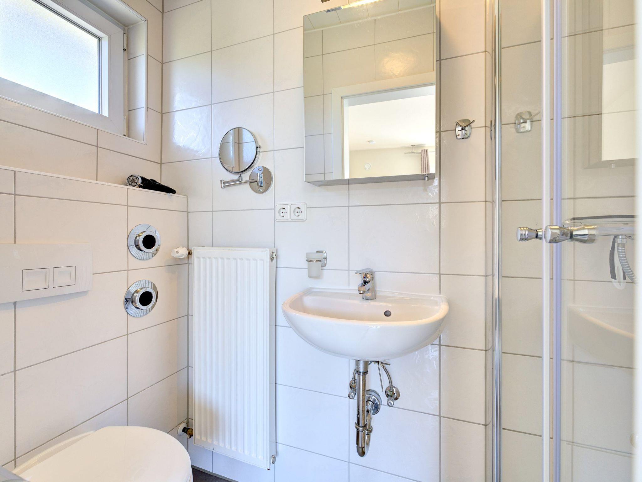 Das Badezimmer ist mit einer Dusche, Waschbecken, WC und einem Fön ausgestattet.