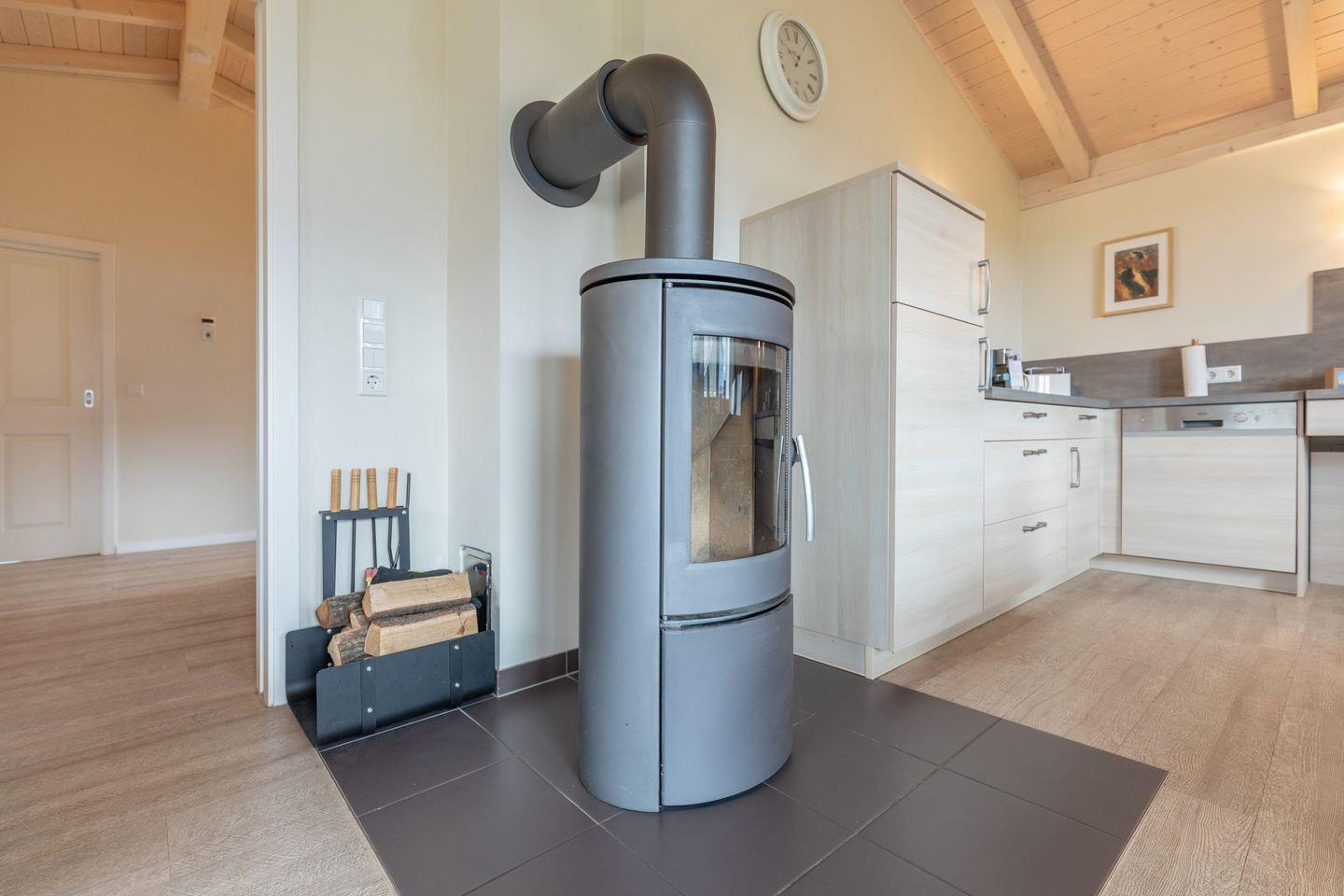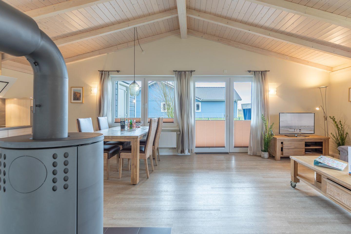 Das gemütliche Wohnzimmer ist mit SAT-TV und einem Blu-Ray-DVD-Player ausgestattet. Der Kaminofen sorgt auch in der kälteren Jahreszeit für behagliche Stunden.
