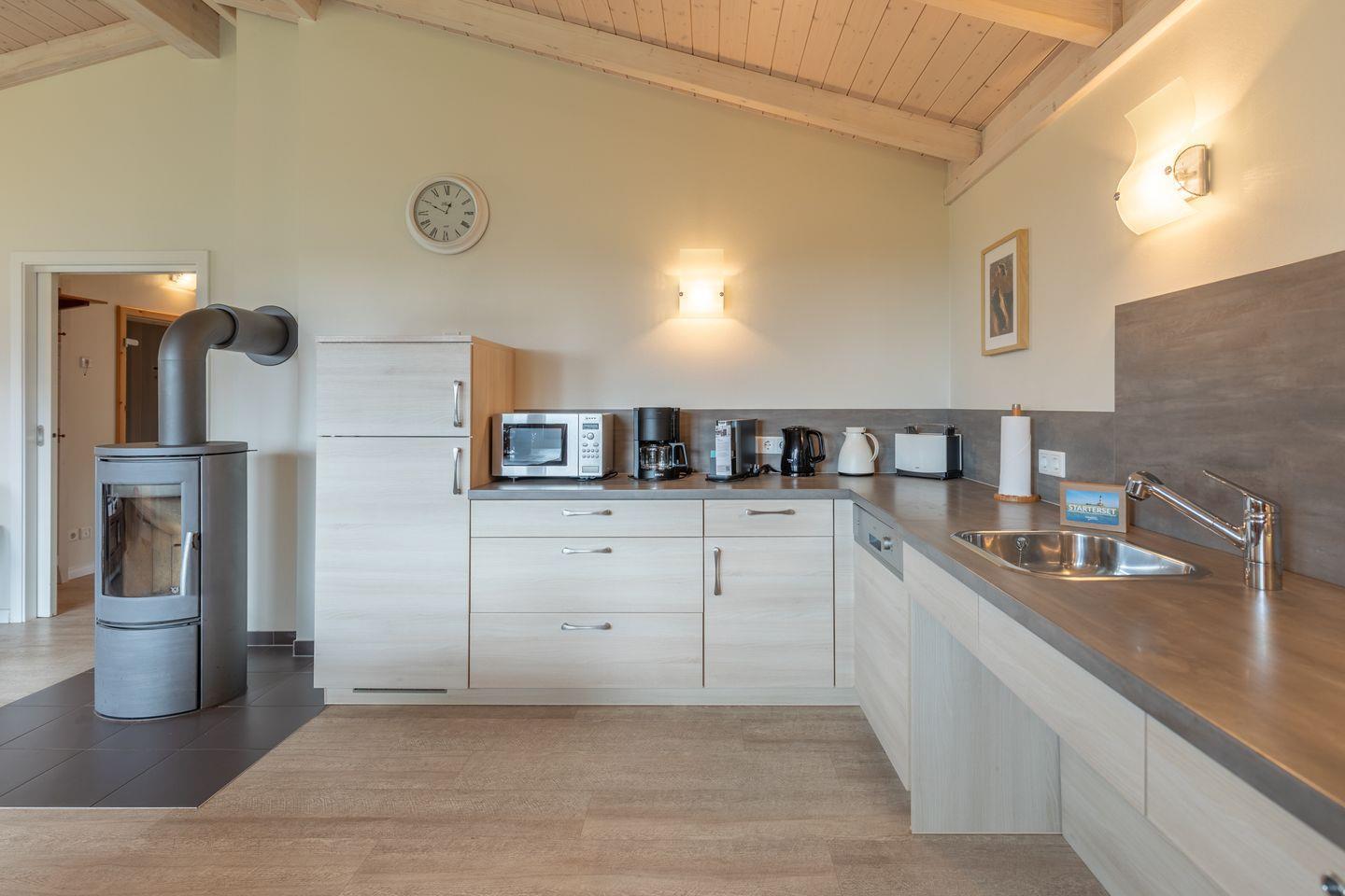 Dieses Ferienhaus eignet sich auch besonders für gehbeeinträchtigte Gäste und/oder Rollstuhlfahrer. Alle Türen sind Schiebetüren oder auch elektrisch zu bedienen. Die offene Küche bietet Ihnen eine exklusive und umfangreiche Ausstattung, die das Herz eines jeden Hobbykochs höher schlagen lässt: Ceranfeld mit 4 Kochplatten, Backofen, Kühlschrank mit ***Gefrierfach, Mikrowelle, Geschirrspüler, Filterkaffeemaschine, Qbo Essential uvm. Die Küche ist unterfahrbar, höhenverstellbar und komplett auf Rollstuhlfahrer ausgelegt. Sie verfügt u. a. über eine Dunstabzugshaube mit Fernbedienung und einen Backofen mit versenkbarer Tür.