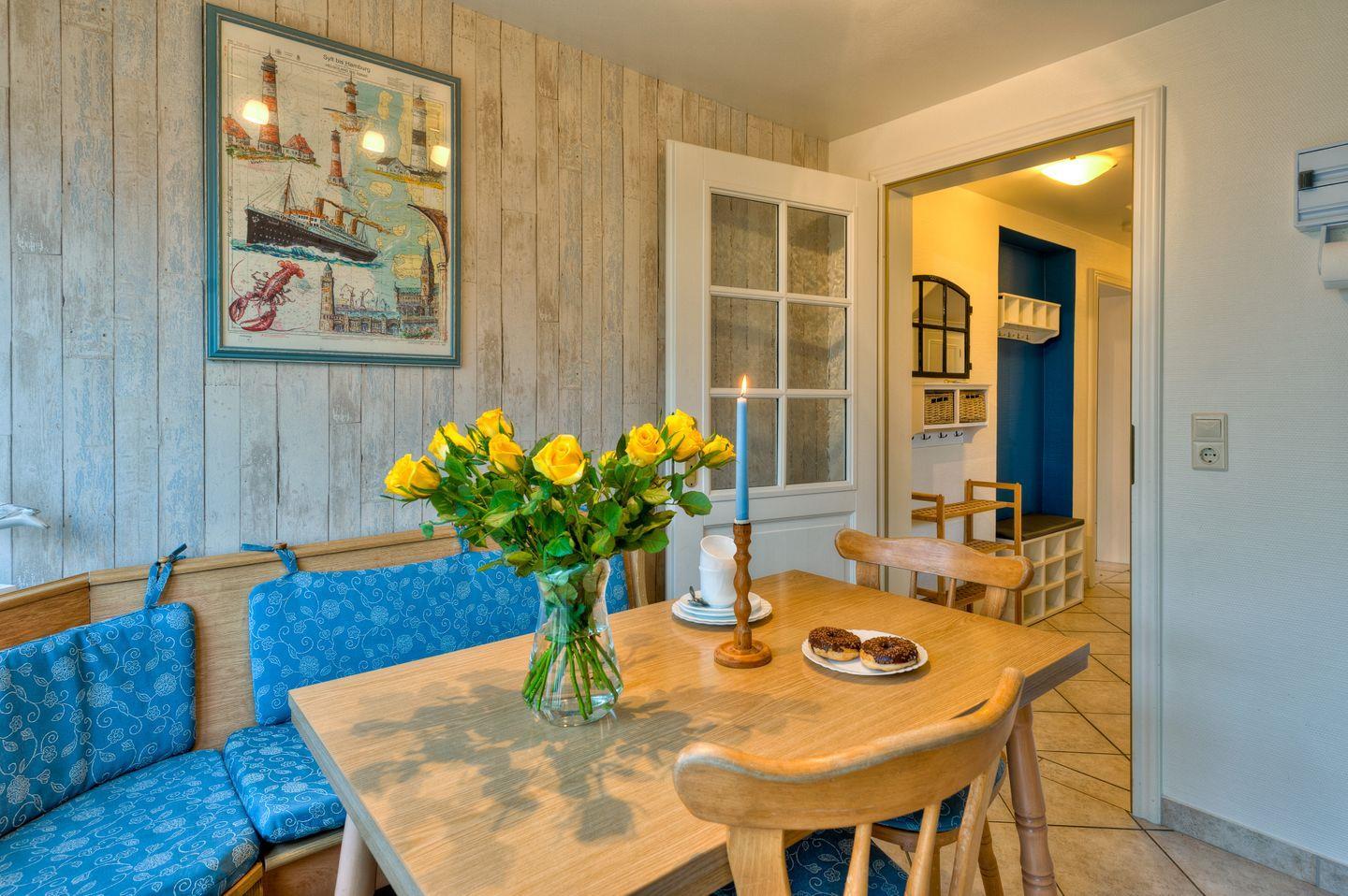 Ein Highlight der Wohnung ist die sonnige, großzügige Terrasse, die direkten Zugang zum Garten bietet. Hier können Sie morgens bei einer Tasse Kaffee die frische Nordseeluft genießen oder am Abend den Grill anzünden und unvergessliche Grillabende mit Familie oder Freunden erleben. Der Garten ist ein schöner Rückzugsort, der zudem mit Gartenmöbeln und Sonnenschirm ausgestattet ist.