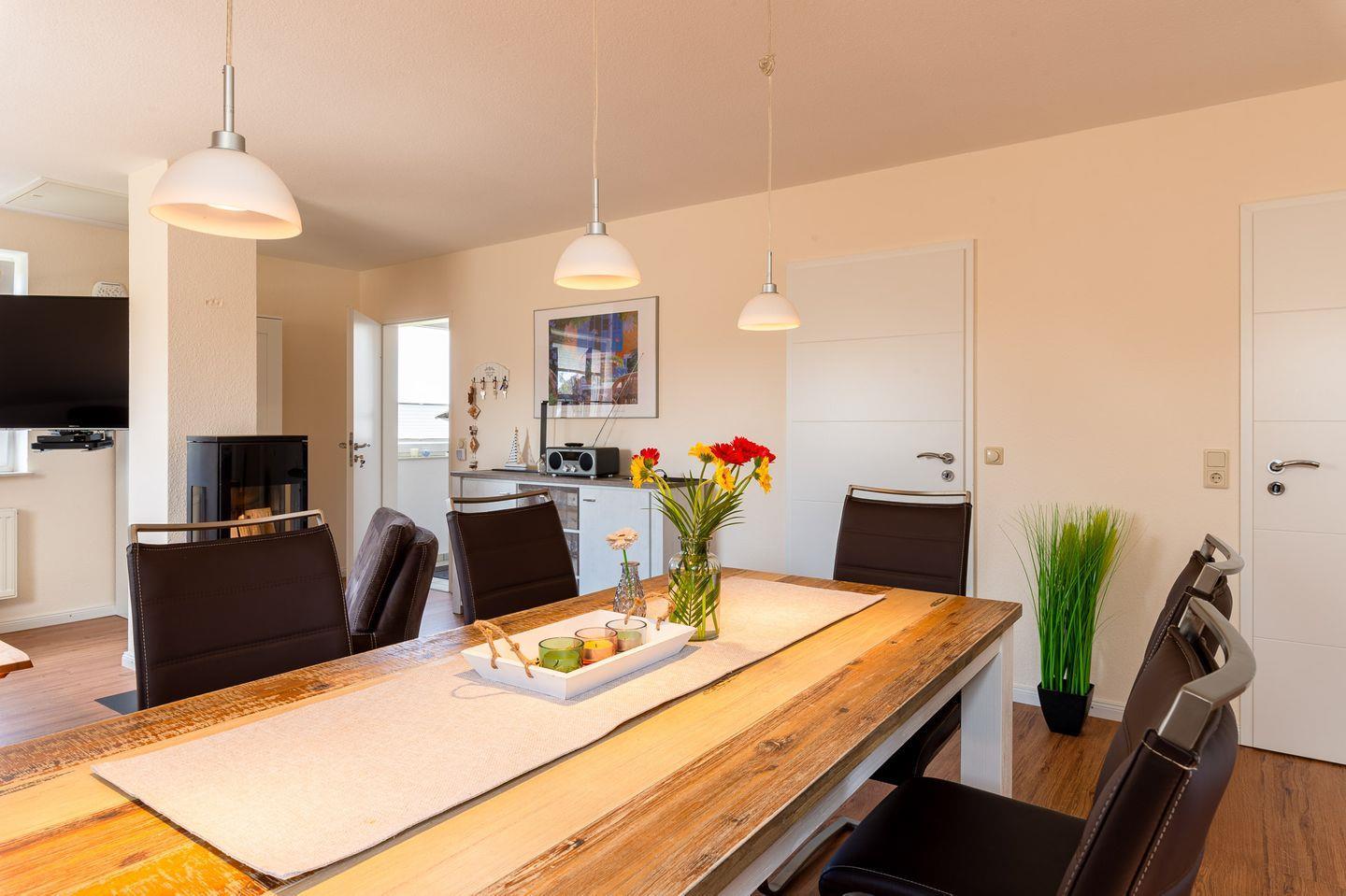 Treten Sie ein und fühlen Sie sich sofort wohl in unserem großzügigen Wohnbereich, der zum Entspannen und Verweilen einlädt. Genießen Sie gemütliche Abende vor dem Kaminofen und erleben Sie Unterhaltung der Extraklasse mit Sky TV.