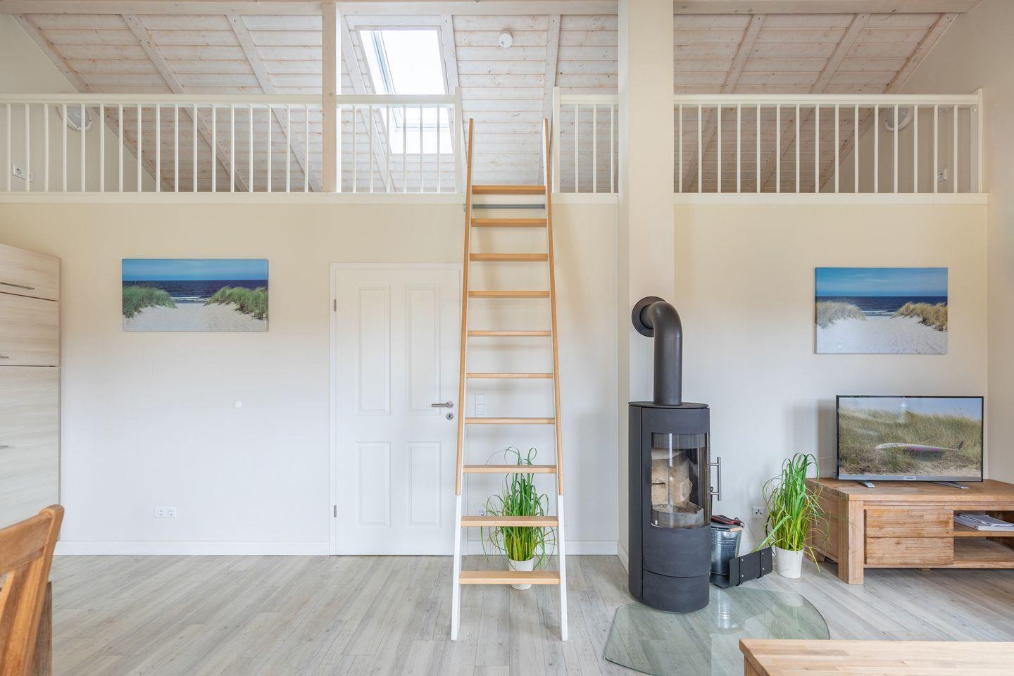 Das 50 m² große Ferienhaus überzeugt mit modernem Komfort und stilvollem skandinavischem Charme. Im Schlafzimmer erwartet Sie ein komfortables Doppelbett (180 × 200 cm), das für erholsame Nächte sorgt. Die Fenster sind mit Fliegengitter versehen. Das gemütliche Wohnzimmer ist mit einer bequemen Sofaecke und SAT-TV ausgestattet. An kühleren Tagen schafft der Kaminofen eine behagliche Atmosphäre.