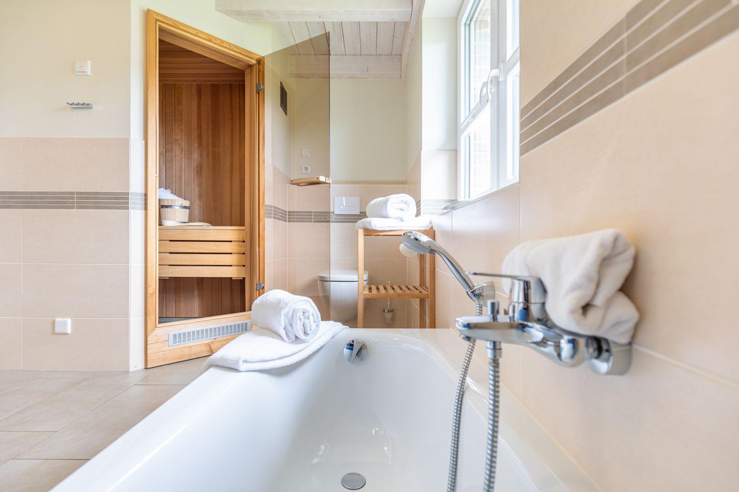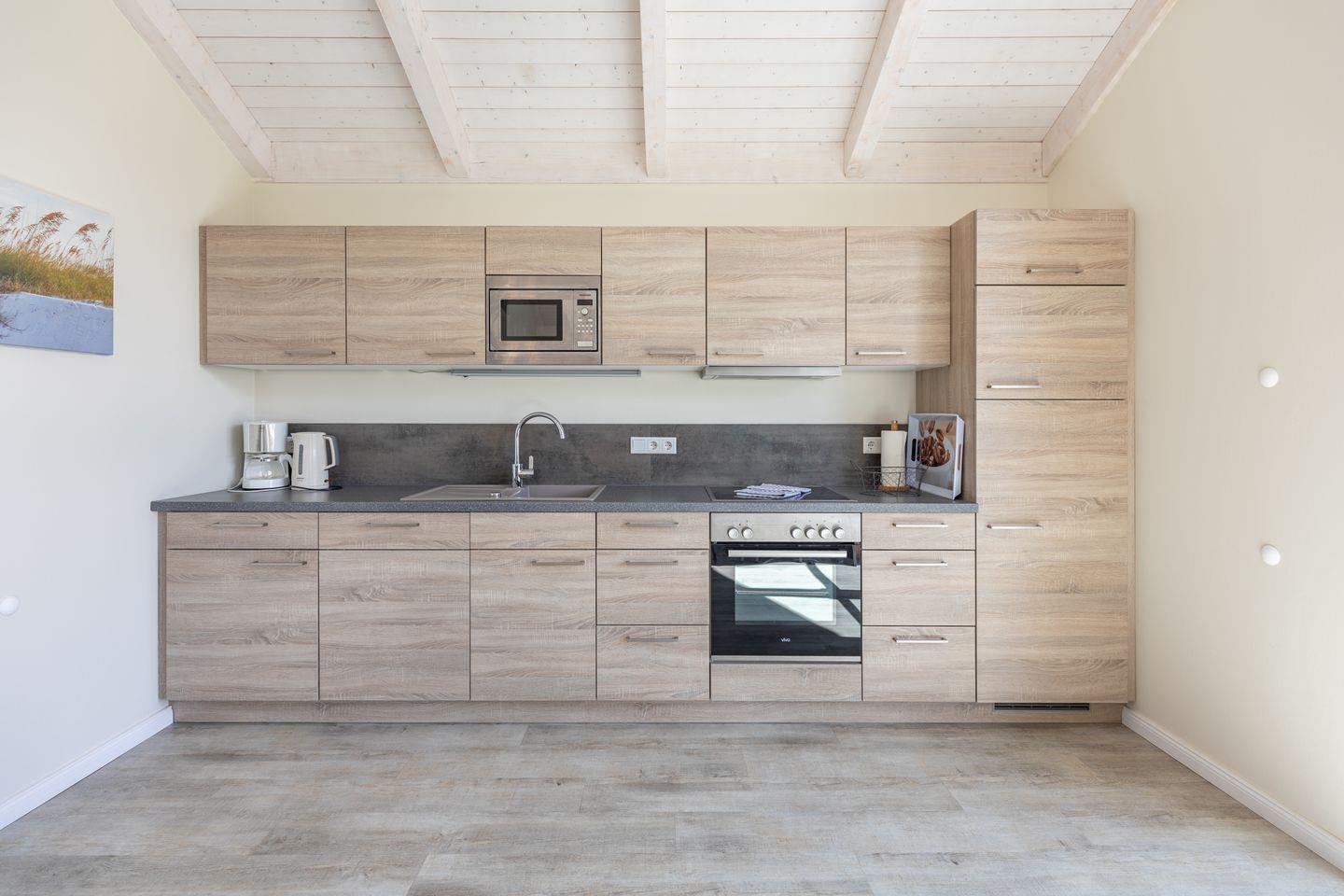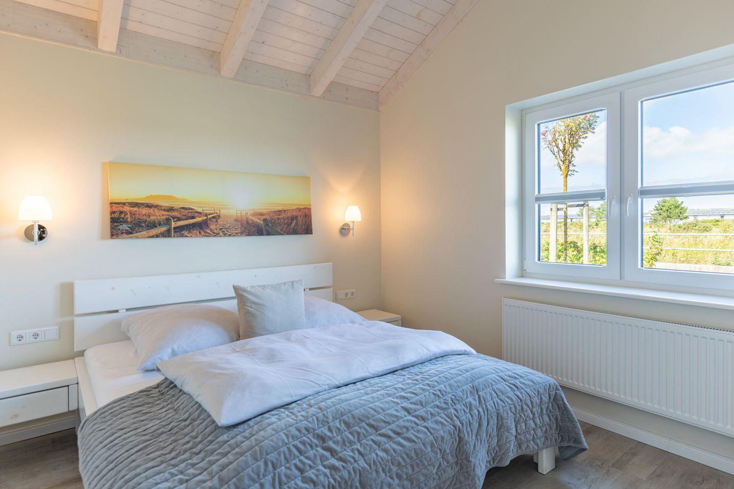 Das 85 qm große Ferienhaus ist modern und exklusiv im skandinavischen Charme eingerichtet. Die zwei Schlafzimmer mit jeweils einem Komfort-Doppelbett (180 x 200 cm) bieten Platz für bis zu vier Personen. Das gemütliche Wohnzimmer ist mit SAT-TV und einem Blu-Ray-DVD-Player ausgestattet. Der Kaminofen sorgt auch in der kälteren Jahreszeit für behagliche Stunden. Die offene Küche bietet Ihnen eine exklusive und umfangreiche Ausstattung, die das Herz eines jeden Hobbykochs höher schlagen lässt: Ceranfeld mit 4 Kochplatten, Backofen, Kühlschrank mit ***Gefrierfach, Mikrowelle, Geschirrspüler, Filterkaffeemaschine,Qbo Essential uvm. Das Badezimmer lässt keine Wünsche offen: zwei Waschbecken, eine große Badewanne, eine ebenerdige Dusche und eine schöne Sauna geben Ihrem Urlaub den richtigen Rahmen. Das Ferienhaus verfügt über ein zusätzliches WC. Auf der überdachten, windgeschützten Terrasse können Sie auf bequemen Gartenstühlen Sonne genießen.