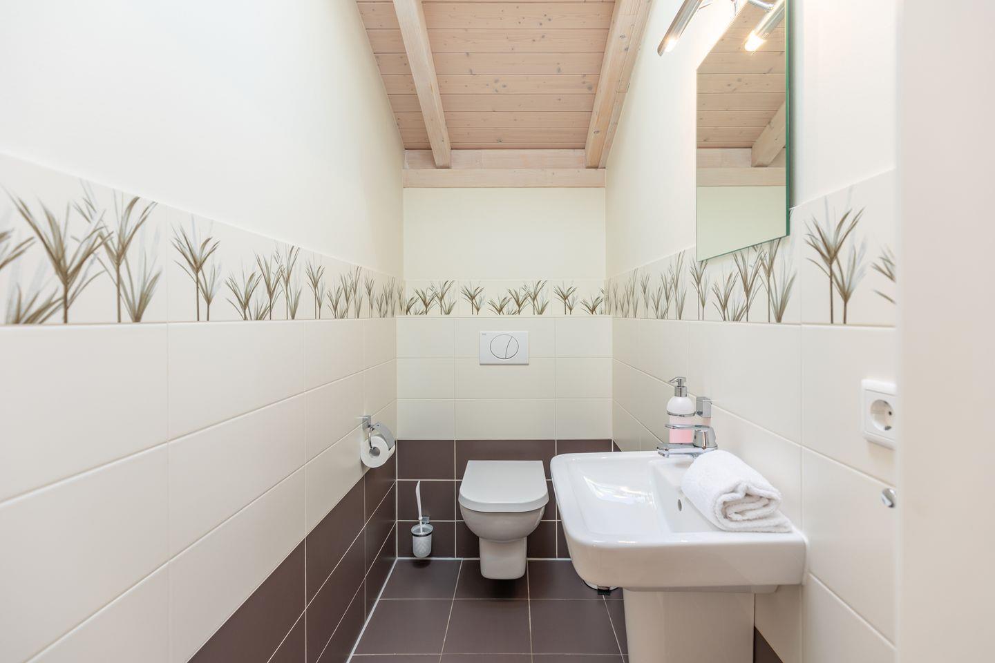 Das Badezimmer im Obergeschoss lässt keine Wünsche offen: Zwei Waschbecken, eine große Badewanne, eine ebenerdige Dusche und eine schöne Sauna geben Ihrem Urlaub den richtigen Rahmen. Im Obergeschoss befindet sich auch ein separates WC. Das Ferienhaus verfügt über ein zusätzliches Duschbad und Gäste-WC im Erdgeschoss. In der Unterkunft stehen Ihnen eine Waschmaschine und ein Trockner zur Verfügung.