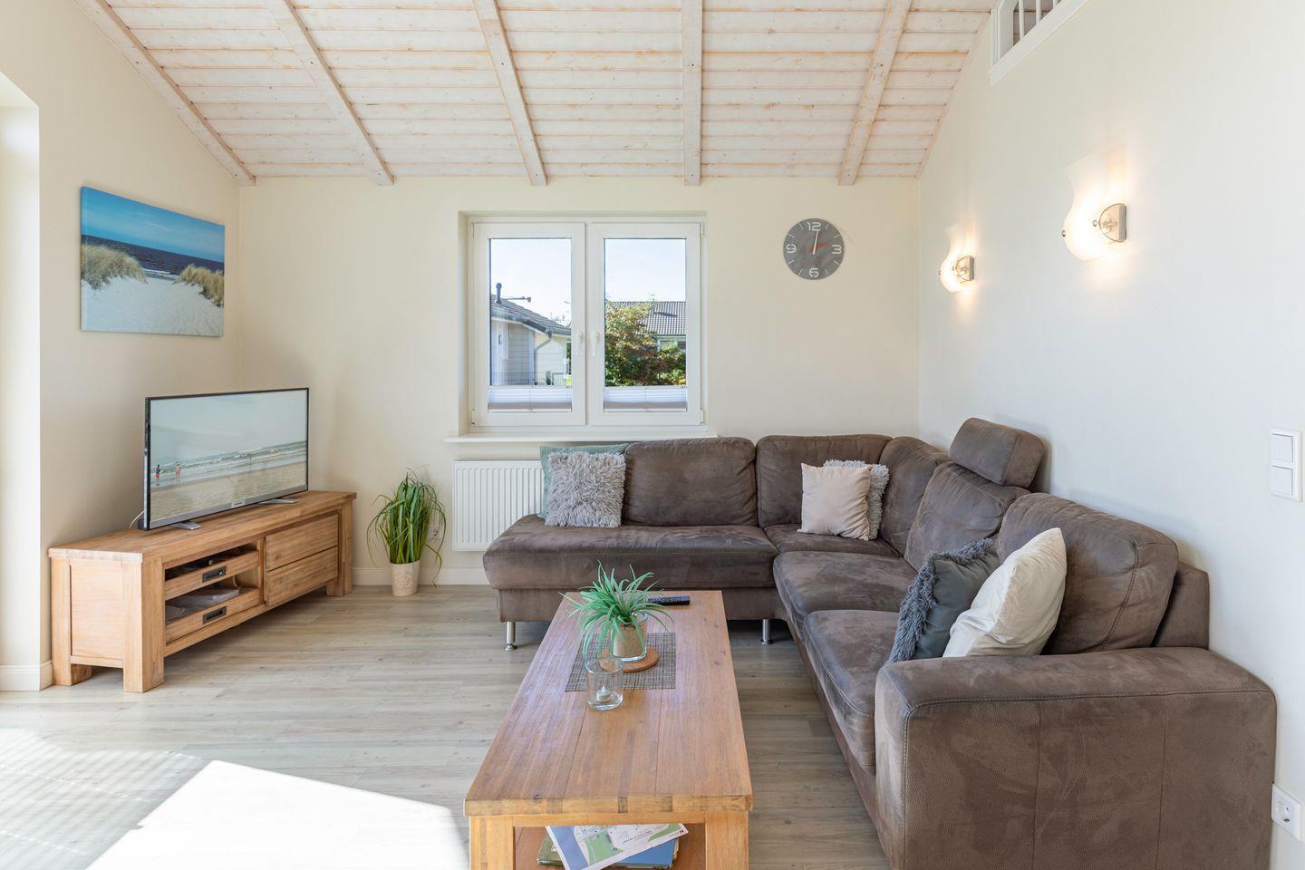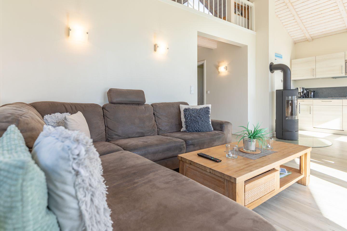 Das gemütliche Wohnzimmer ist mit SAT-TV ausgestattet. Der Kaminofen sorgt auch in der kälteren Jahreszeit für behagliche Stunden. Die offene Küche bietet Ihnen eine exklusive und umfangreiche Ausstattung, die das Herz eines jeden Hobbykochs höher schlagen lässt: Ceranfeld mit 4 Kochplatten, Backofen, Kühlschrank mit ***Gefrierfach, Mikrowelle, Geschirrspüler, Filterkaffeemaschine uvm. Das Badezimmer lässt keine Wünsche offen: zwei Waschbecken, eine große Badewanne, eine ebenerdige Dusche und eine schöne Sauna geben Ihrem Urlaub den richtigen Rahmen. Das Ferienhaus verfügt über ein zusätzliches WC. Auf der überdachten Terrasse können Sie auf bequemen Gartenstühlen und -liegen die Sonne genießen.