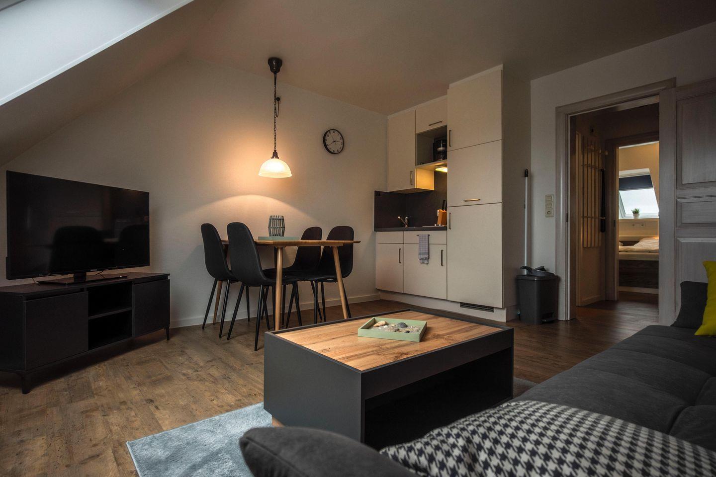 Das Apartment verfügt über ein separates Schlafzimmer sowie eine Schlafmöglichkeit für insgesamt bis zu vier Personen. Die offene Küche grenzt direkt an den Wohnbereich und ist vollständig ausgestattet mit Kaffeemaschine, Wasserkocher, Toaster, Mikrowelle, 2-Platten-Herd, Kühlschrank mit integriertem Gefrierfach, Küchenutensilien sowie Geschirr und Besteck. Damit können Sie sich problemlos selbst versorgen. Neben einem Esstisch bietet eine gemütliche Sofaecke Raum für erholsame Stunden im Kreis Ihrer Mitreisenden. Für Unterhaltung oder Information steht Ihnen ein Fernseher mit Anschluss an das hauseigene WLAN zur Verfügung.