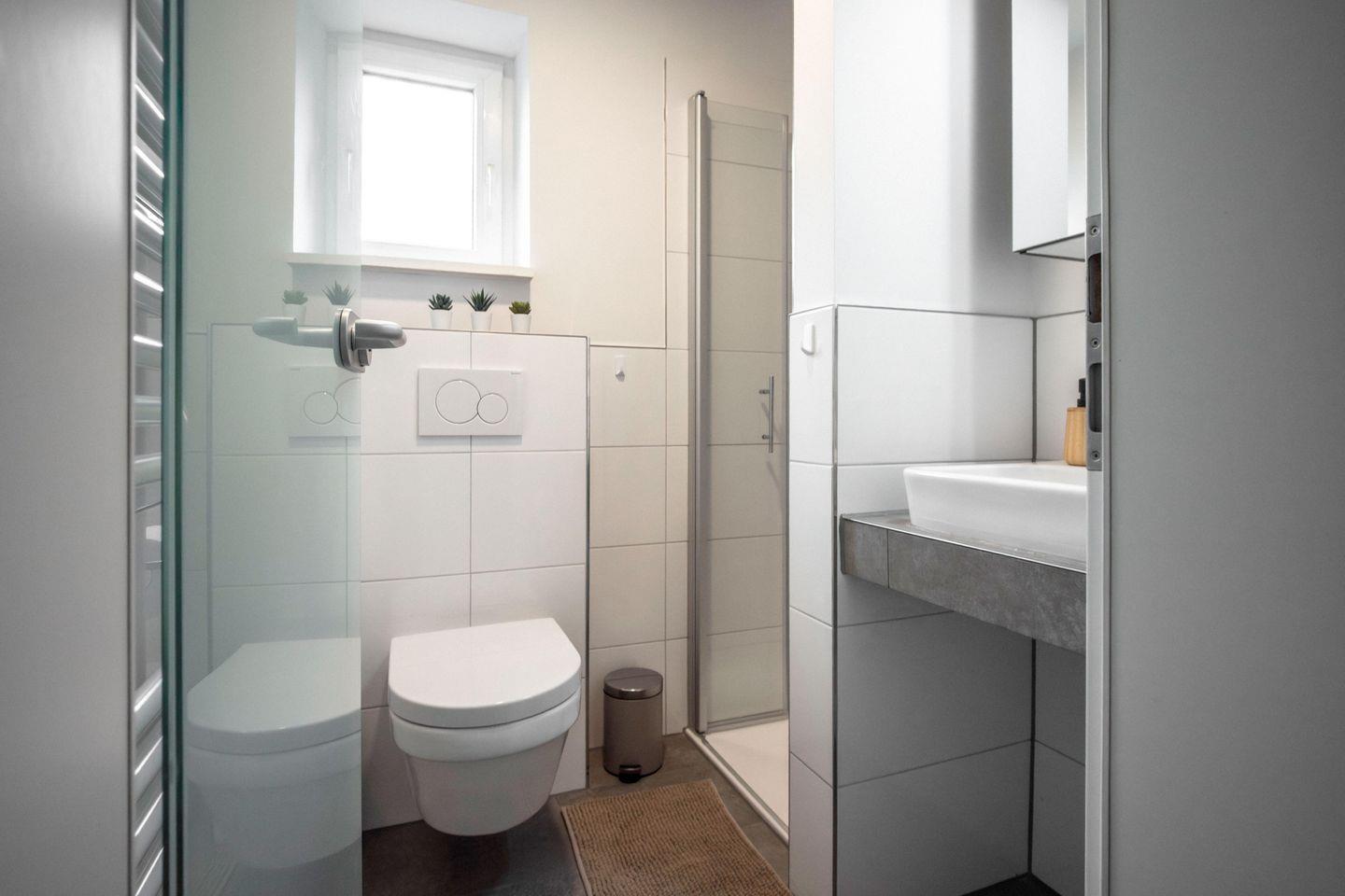 Das Tageslichtbad mit bodengleicher Dusche, Waschbecken, Spiegel und WC garantiert modernen Komfort. Ergänzt wird die Ausstattung durch eine gemeinschaftlich nutzbare Waschmaschine im Haus, damit auch längere Aufenthalte problemlos möglich sind. Die Zentralheizung sorgt ganzjährig für wohlige Temperaturen.