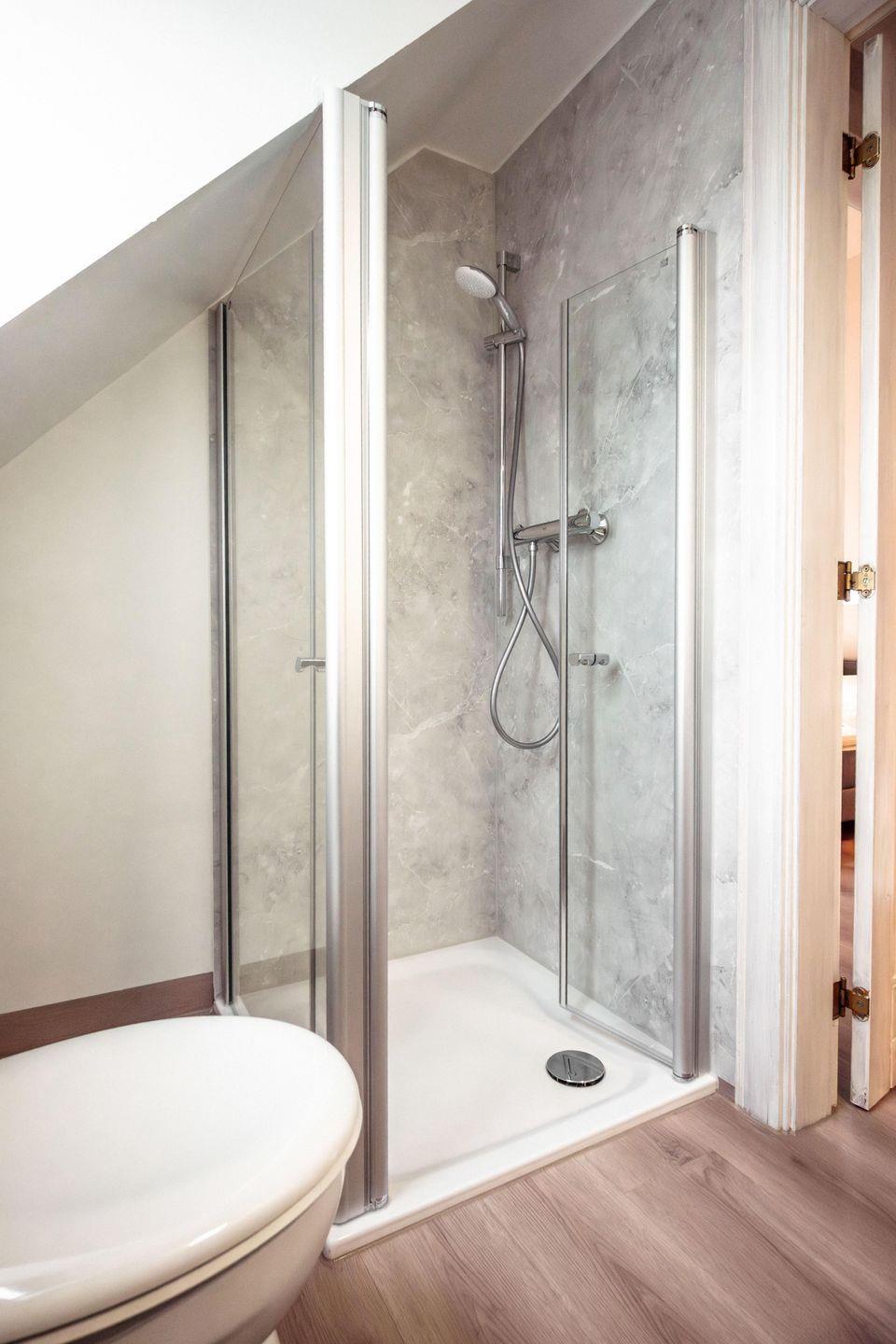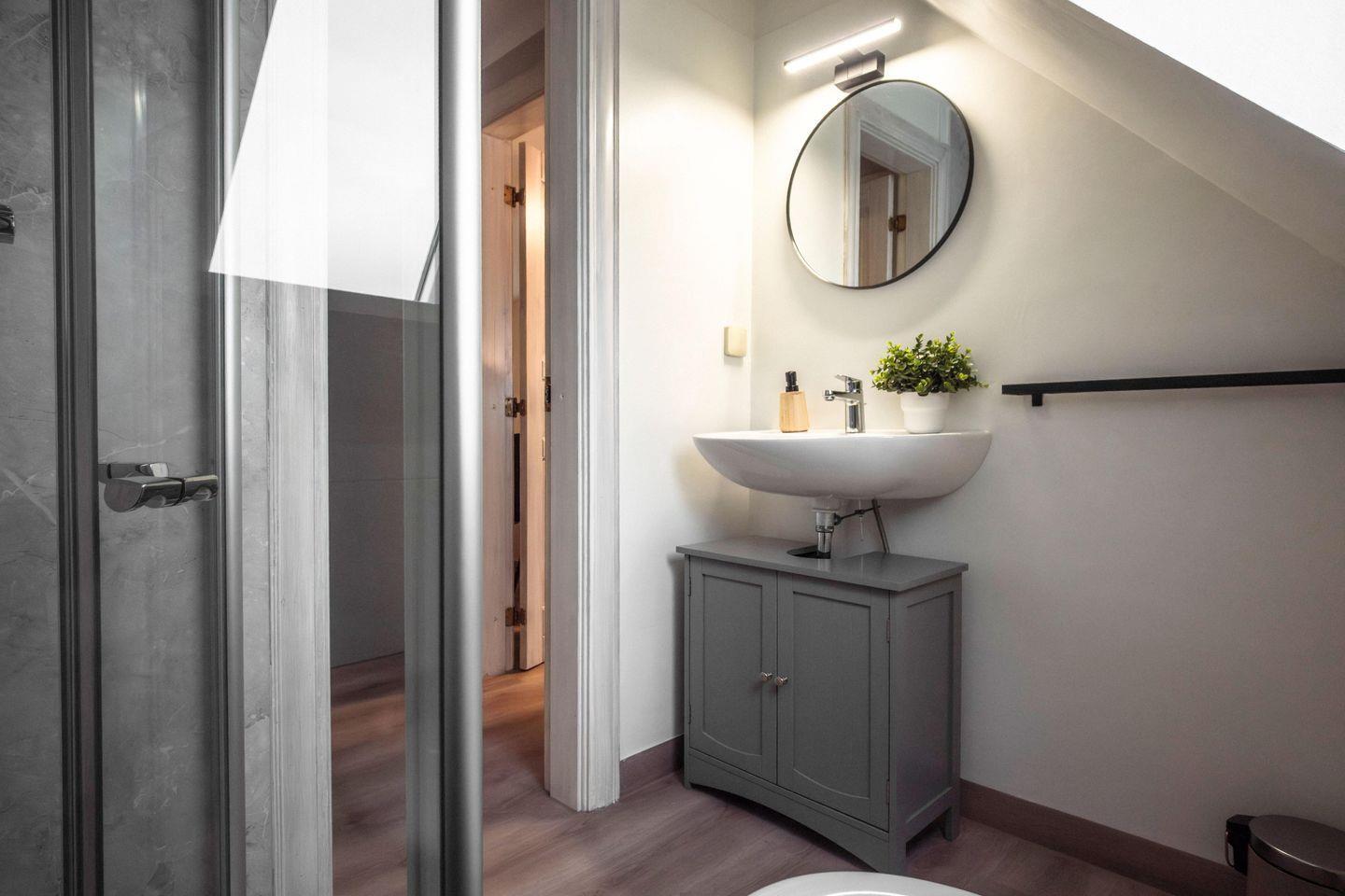 Im Badezimmer erwartet Sie eine moderne Dusche, ein WC, ein Waschbecken sowie ein Spiegel. Für ausreichend Frischluft und Tageslicht sorgt ein Fenster. In der Erstausstattung sind wichtige Haushaltsutensilien bereits vorhanden. Die gemeinschaftliche Waschmaschine steht Ihnen zur Verfügung, sodass auch längere Aufenthalte angenehm gestaltet werden können.