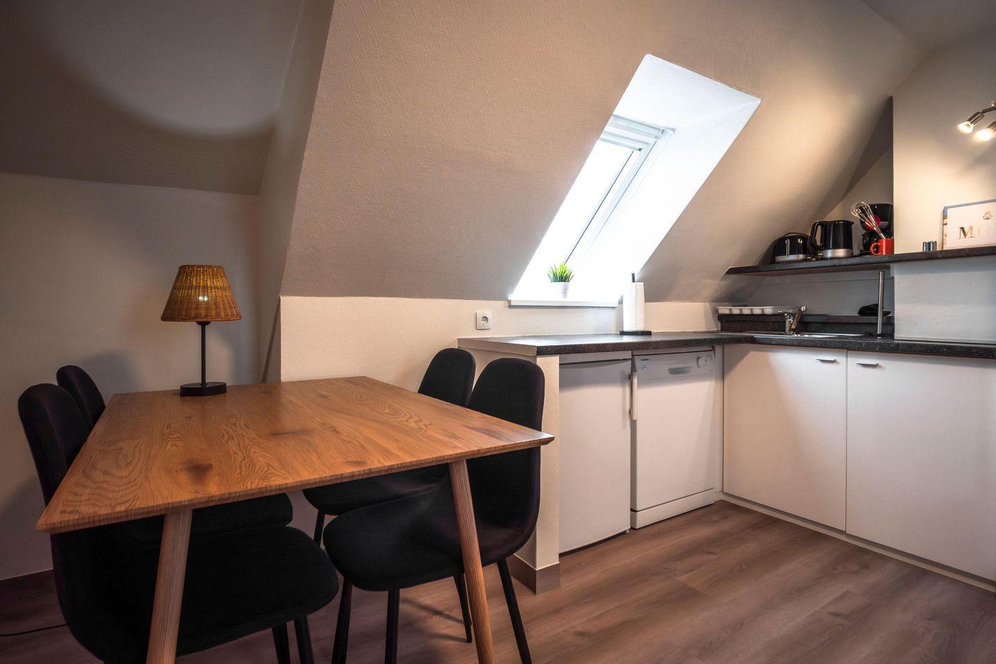 Die offene Küche ist ansprechend und funktional gestaltet und verfügt über eine umfangreiche Ausstattung. Dazu zählen eine Kaffeemaschine, ein Wasserkocher, eine Mikrowelle, ein 2-Platten-Herd, ein Kühlschrank mit Gefrierfach, Toaster sowie sämtliche Küchenutensilien, Geschirr und Besteck. Die Küche ist offen zum Wohnzimmer gehalten und ermöglicht die gemeinsame Zubereitung von Mahlzeiten in geselliger Runde.