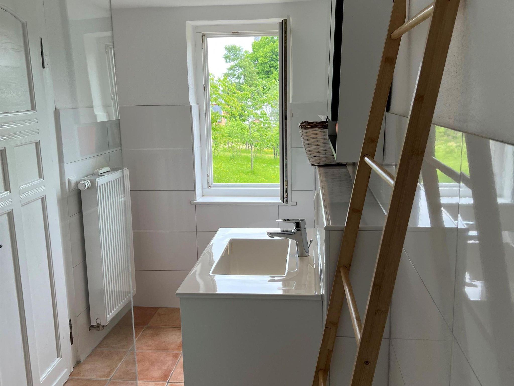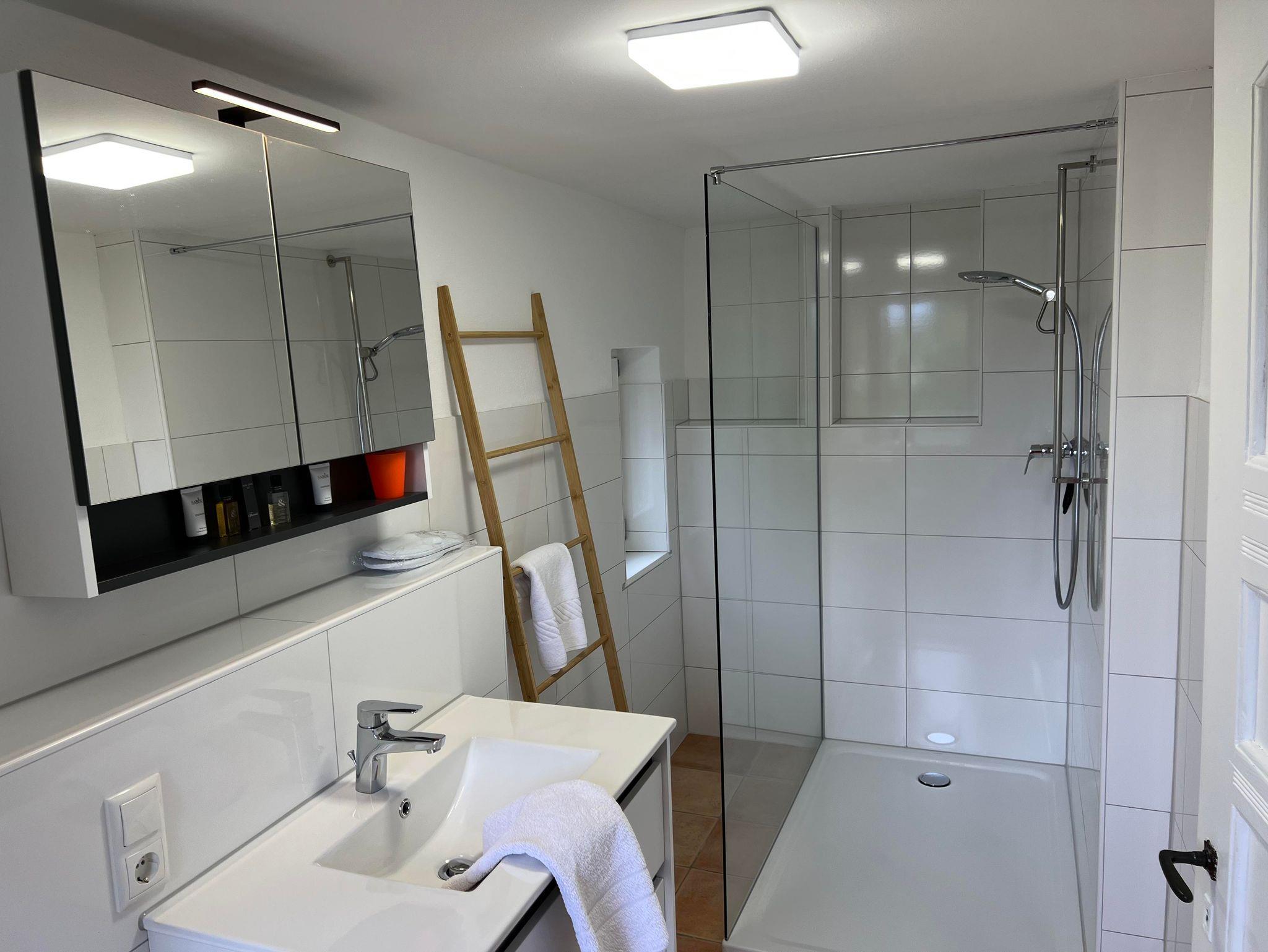 Bad: 2023 vollständig renoviert, ebenerdige Dusche 140x90, Waschtisch, WC, sehr helles schönes Bad auch dank zwei Fenster