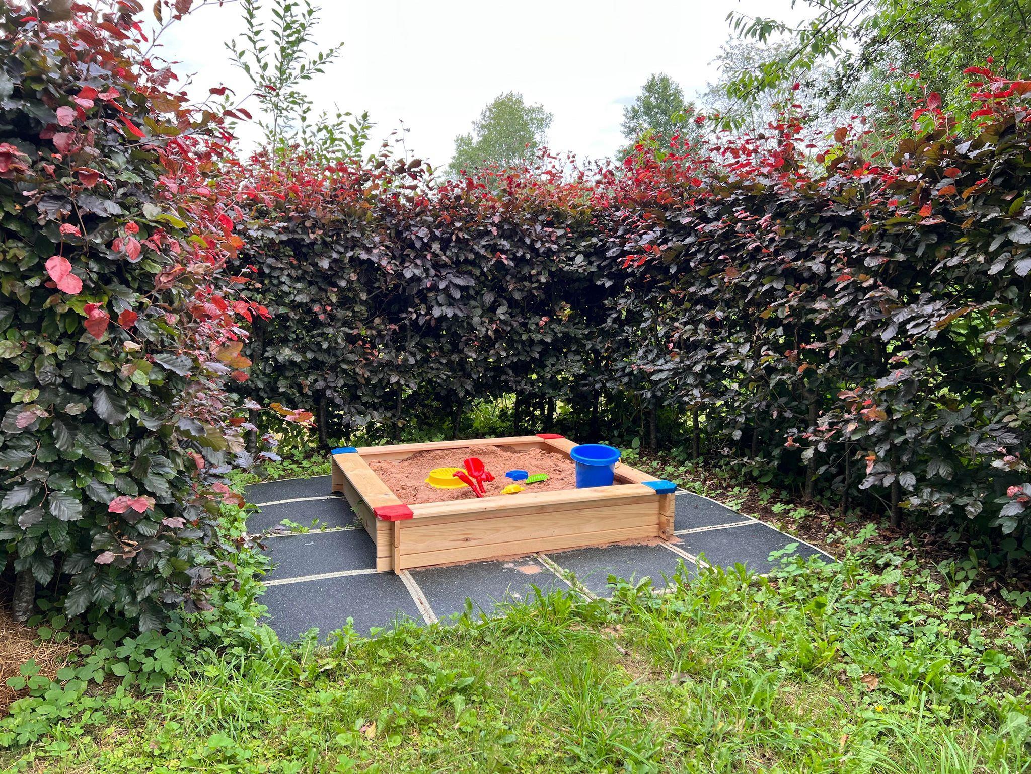 Treppen mit drei Stufen führen zu Ihrem Privat-Garten (Orientierung West/ Süd), Blick auf Obstgarten, Gartenbank und Tisch (6 Personen), Liegestühle, Sonnenschirm, Sandkasten, Grill