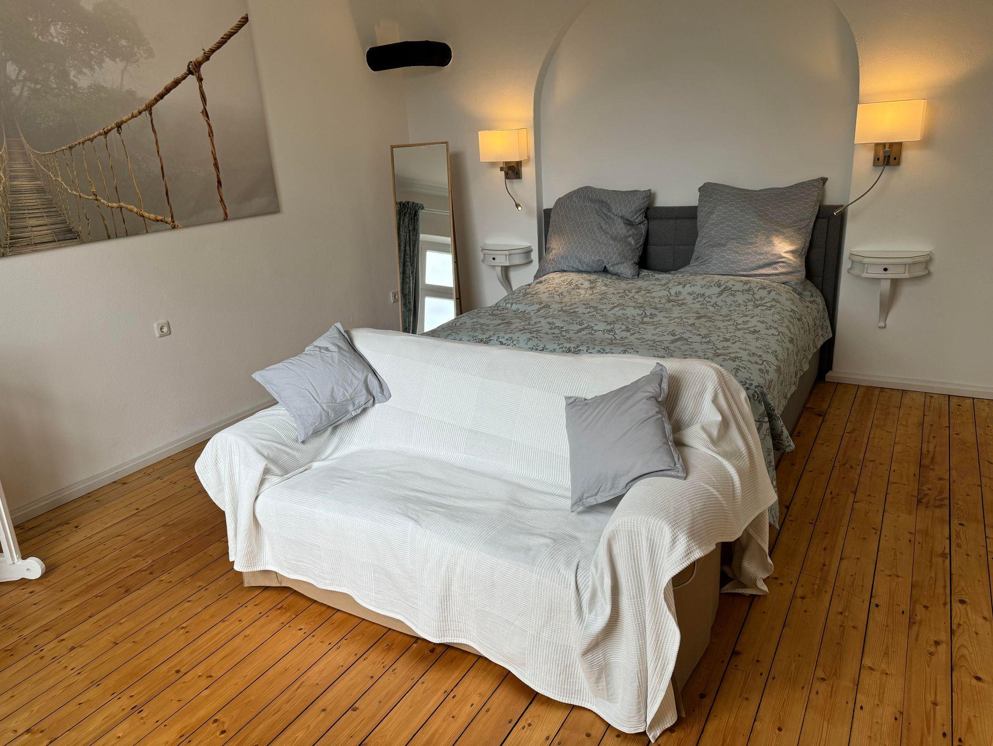Schlafzimmer a: 1 Boxspringbett 180x200, 1 Sofa, 1 großer Schrank.
