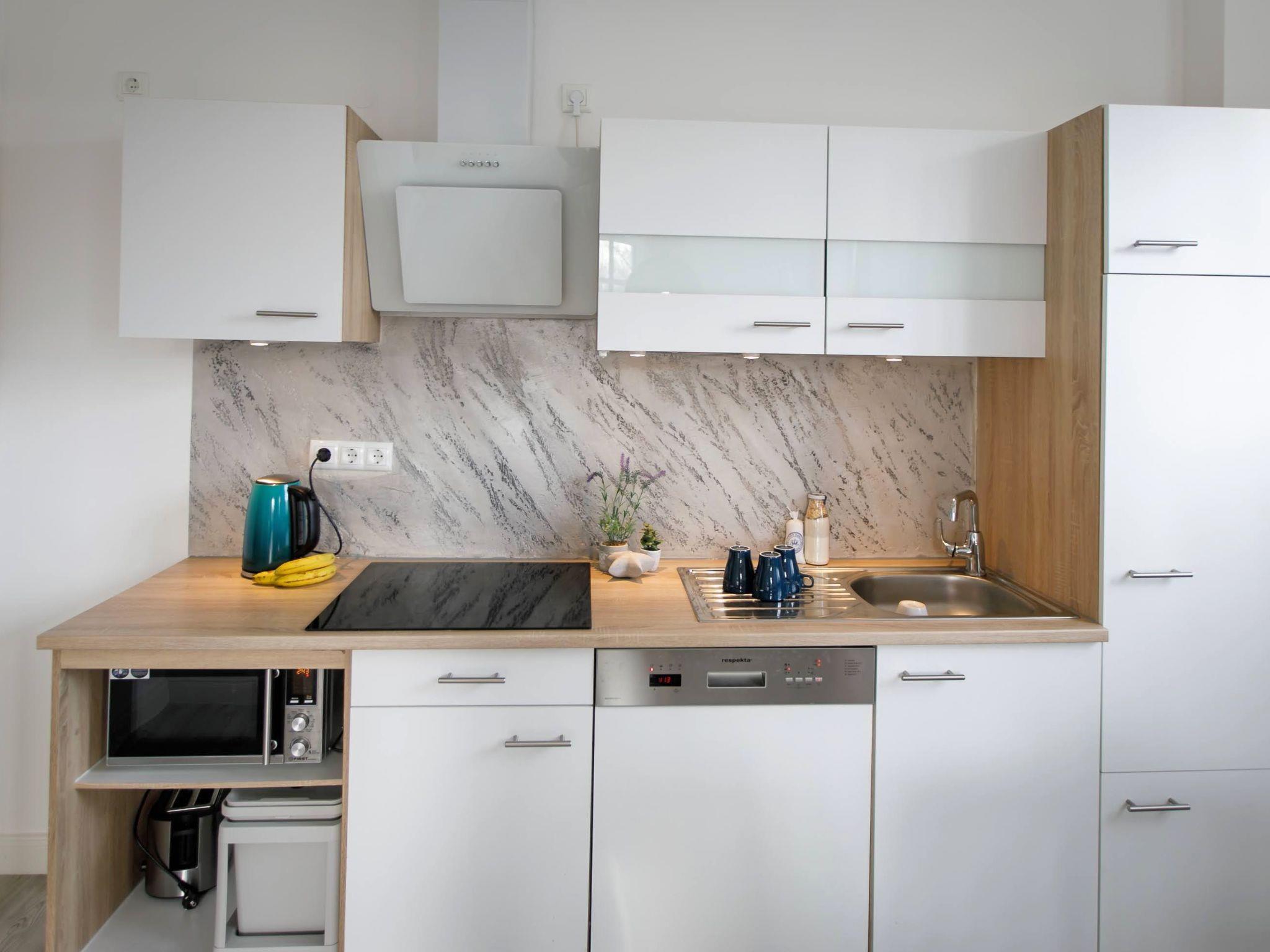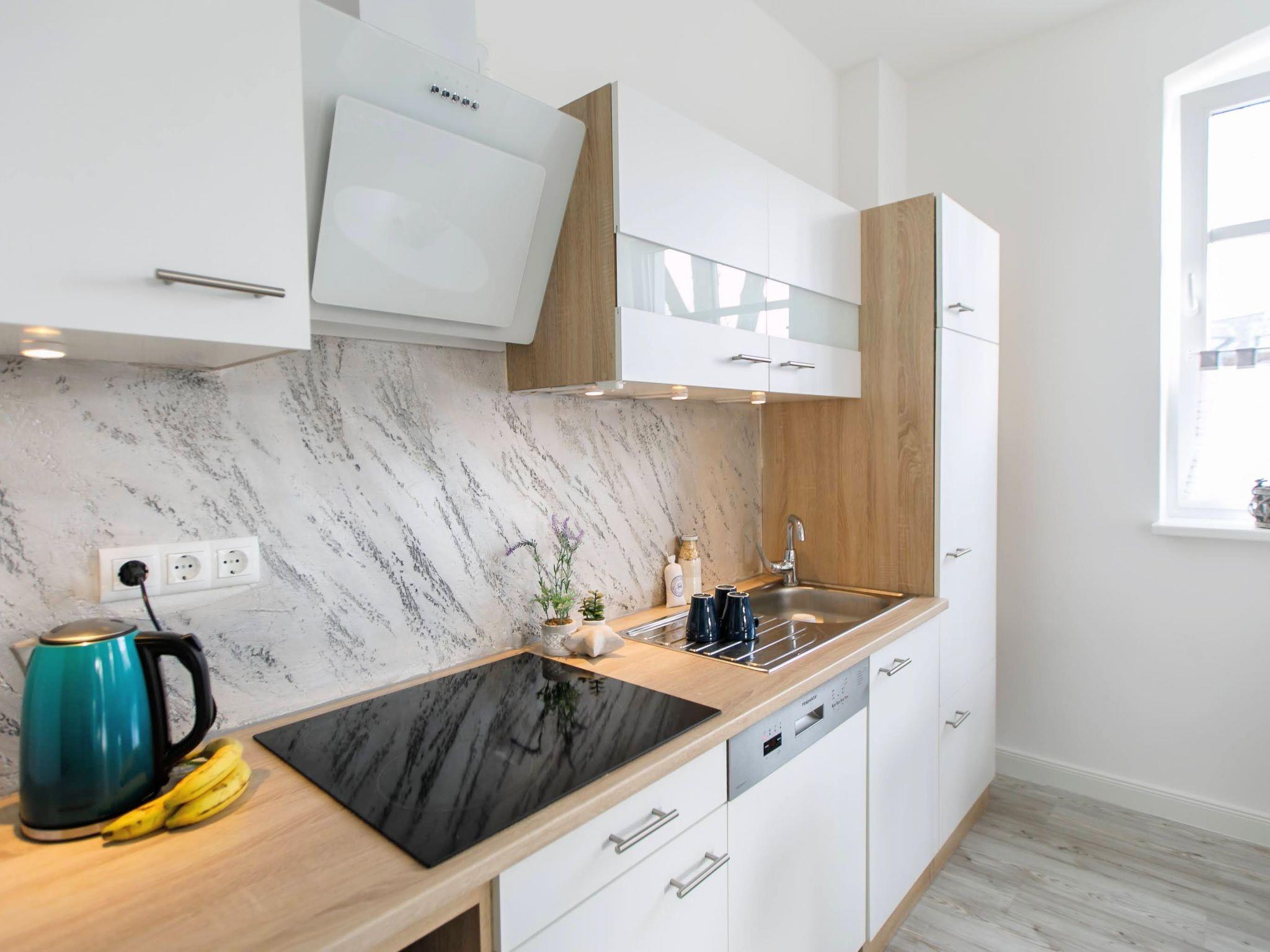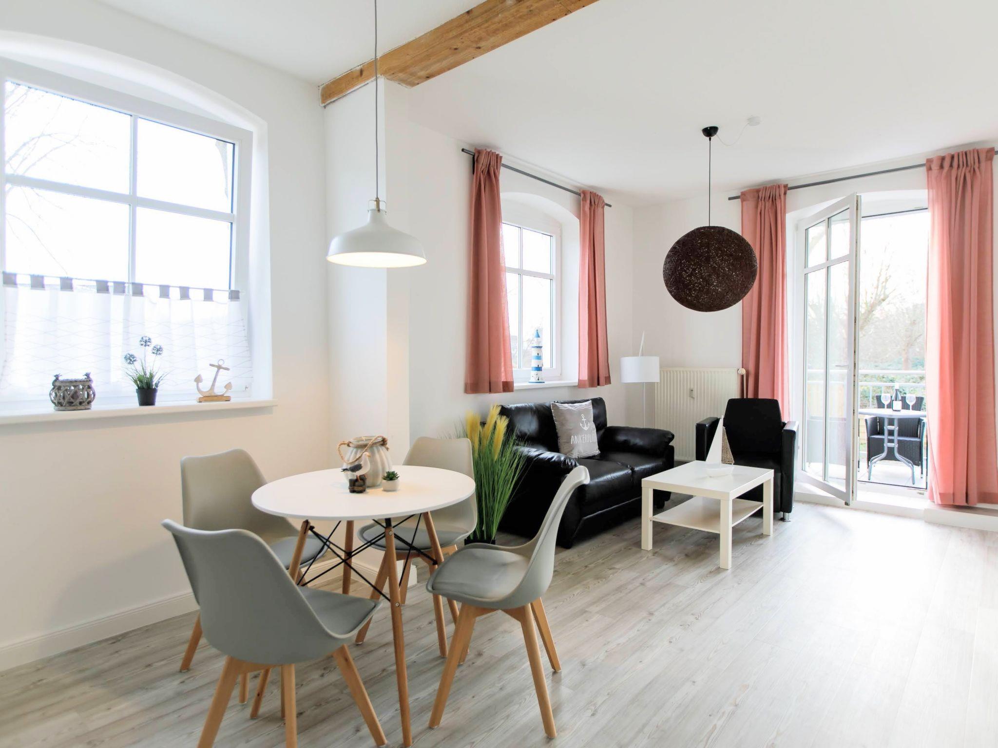 HausOstseewelle is located 150 metres from the beach. The holiday flat 6 is on the ground floor with balcony. The flat has a bedroom (double bed 180x200), a children's room with two single beds (90x200) and a living-dining room. The kitchen is integrated into the living room and is equipped with a coffee machine, toaster, egg cooker, kitchen utensils, microwave, crockery, pots and pans, dishwasher and a four-burner ceramic hob. The kitchen does not have an oven. The equipment includes a radio and an LCD DVBT TV. The house has one parking space per holiday flat.