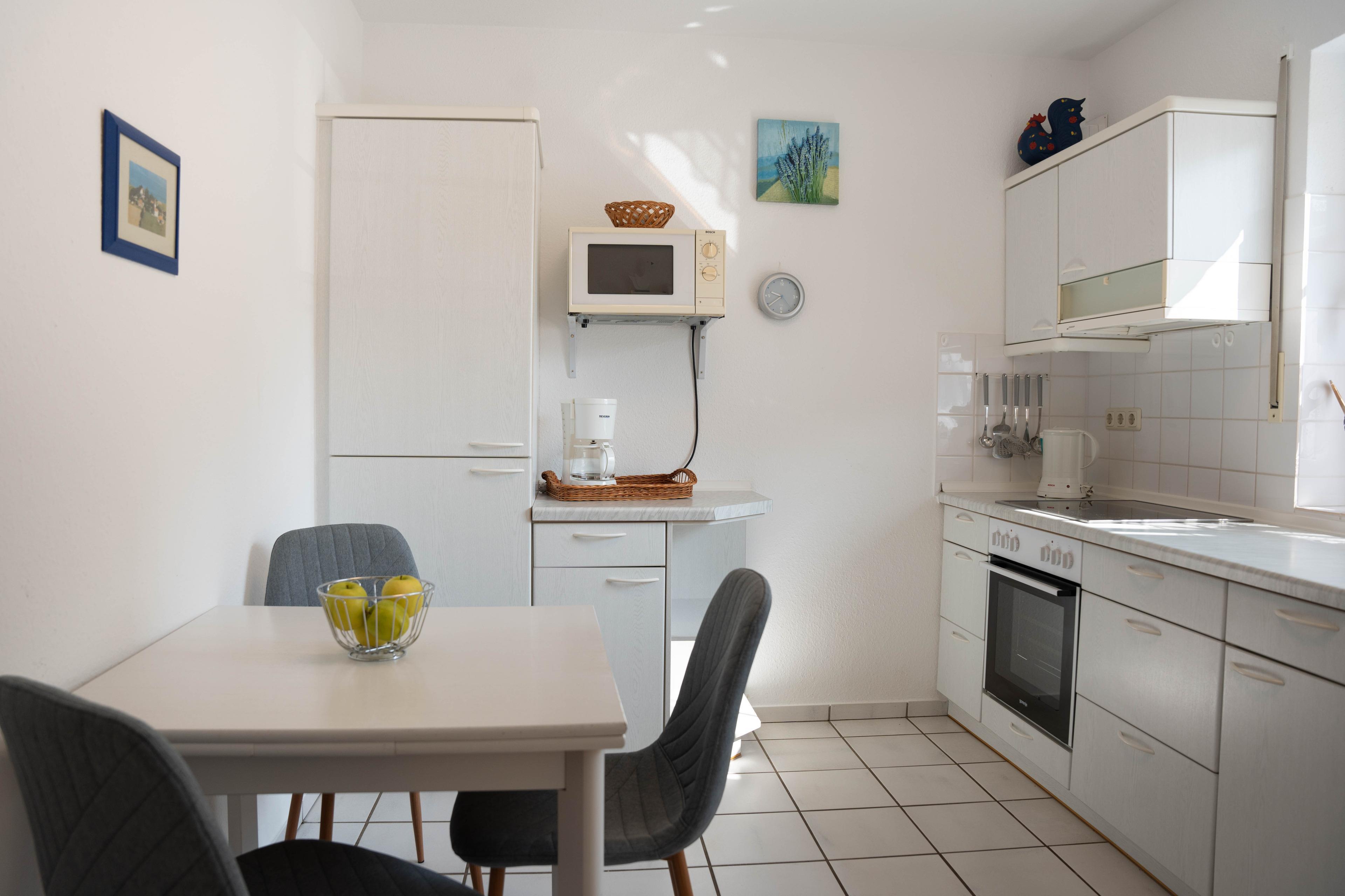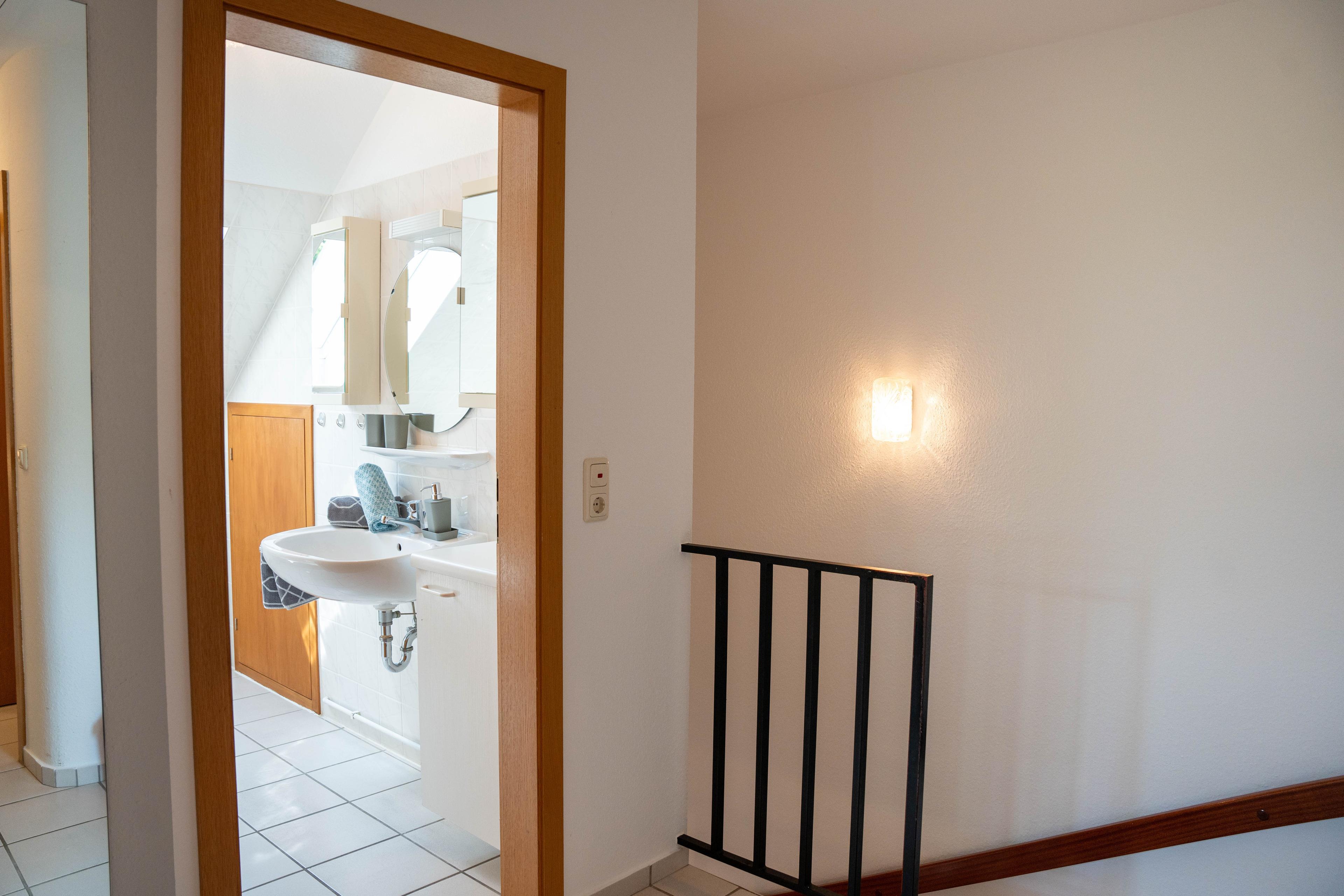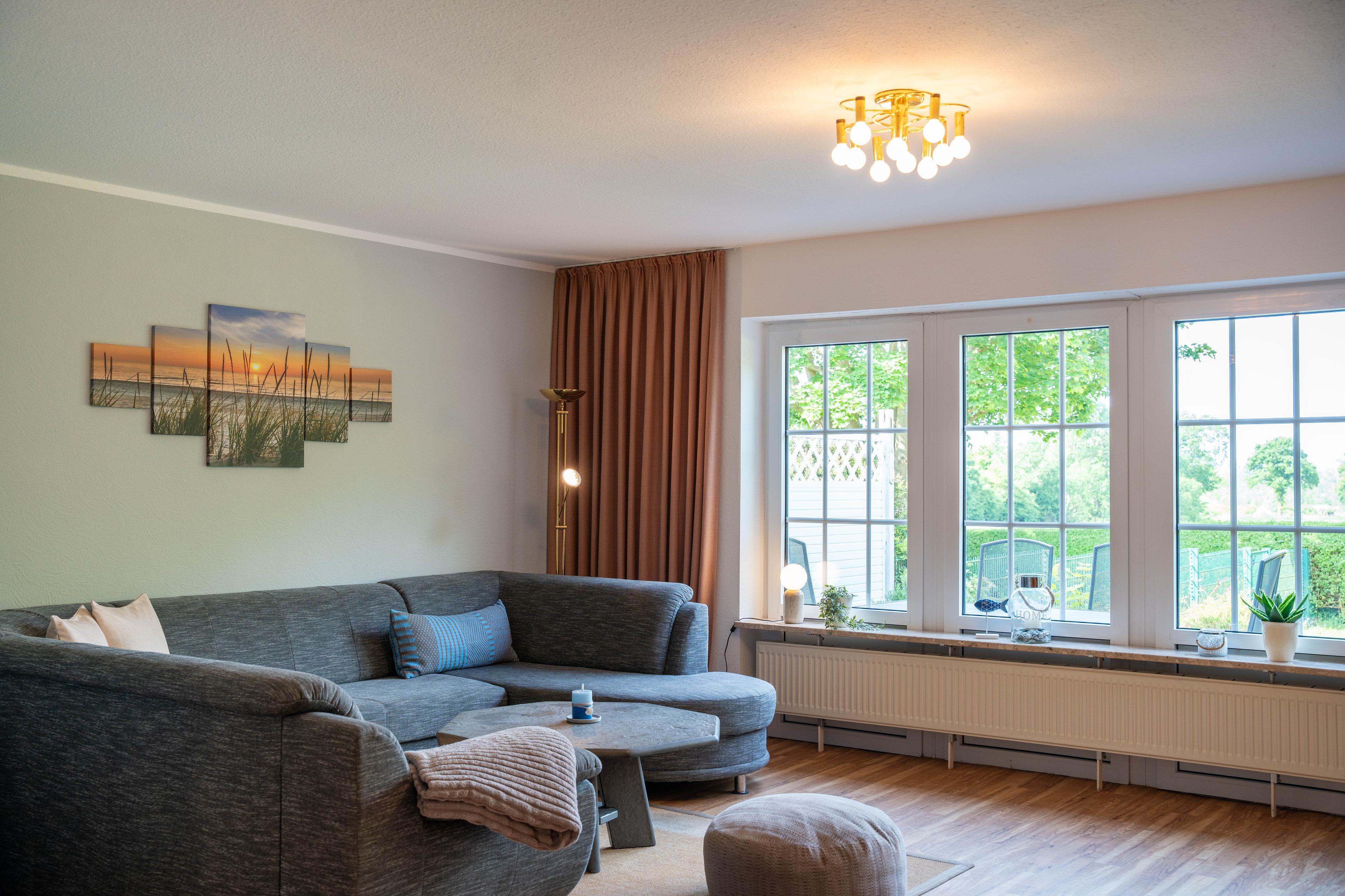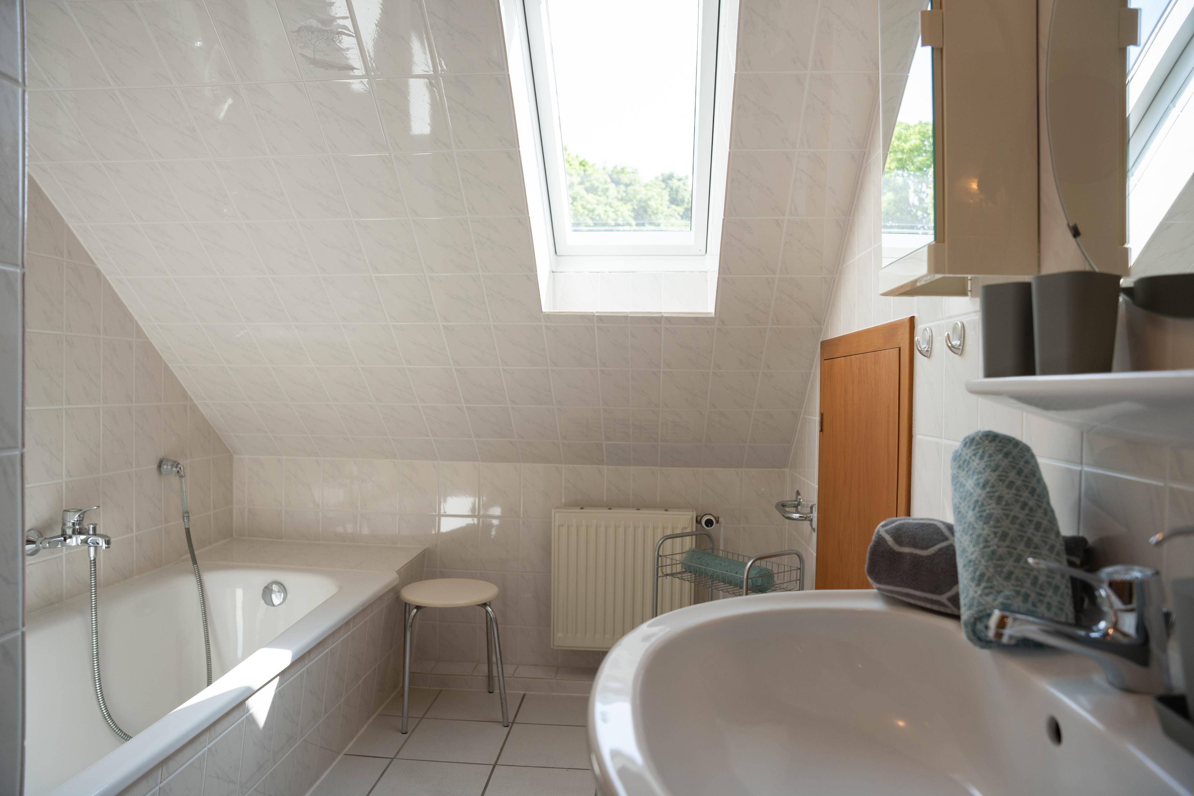 Aufgeteilt ist Ihr Ferienobjekt in Eingangsbereich mit separatem WC, einer gut ausgestatteten Küche mit kleinem Esstisch und 3 Stühlen, einem sehr großzügigen Wohnzimmer mit bequemer Couchgarnitur, einem Esstisch mit Sitzgelegenheit im Erdgeschoss. Vom Wohnzimmer aus, gelangen Sie auf die am Haus befindliche möblierte Terrasse und in den eingezäunten Gartenbereich. Im Obergeschoss der Doppelhaushälfte befinden sich 2 Schlafzimmer, eines mit Doppelbett (180x200cm) und kleiner Sitzgelegenheit und einem Schlafzimmer mit 2 Einzelbetten (90x200cm), sowie einem separatem WC mit Spiegel und Waschbecken und einem separatem Duschbad mit Badewanne, Dusche und Waschbecken. Alle Fenster sind mit Aussenjalousien verdunkelbar.
