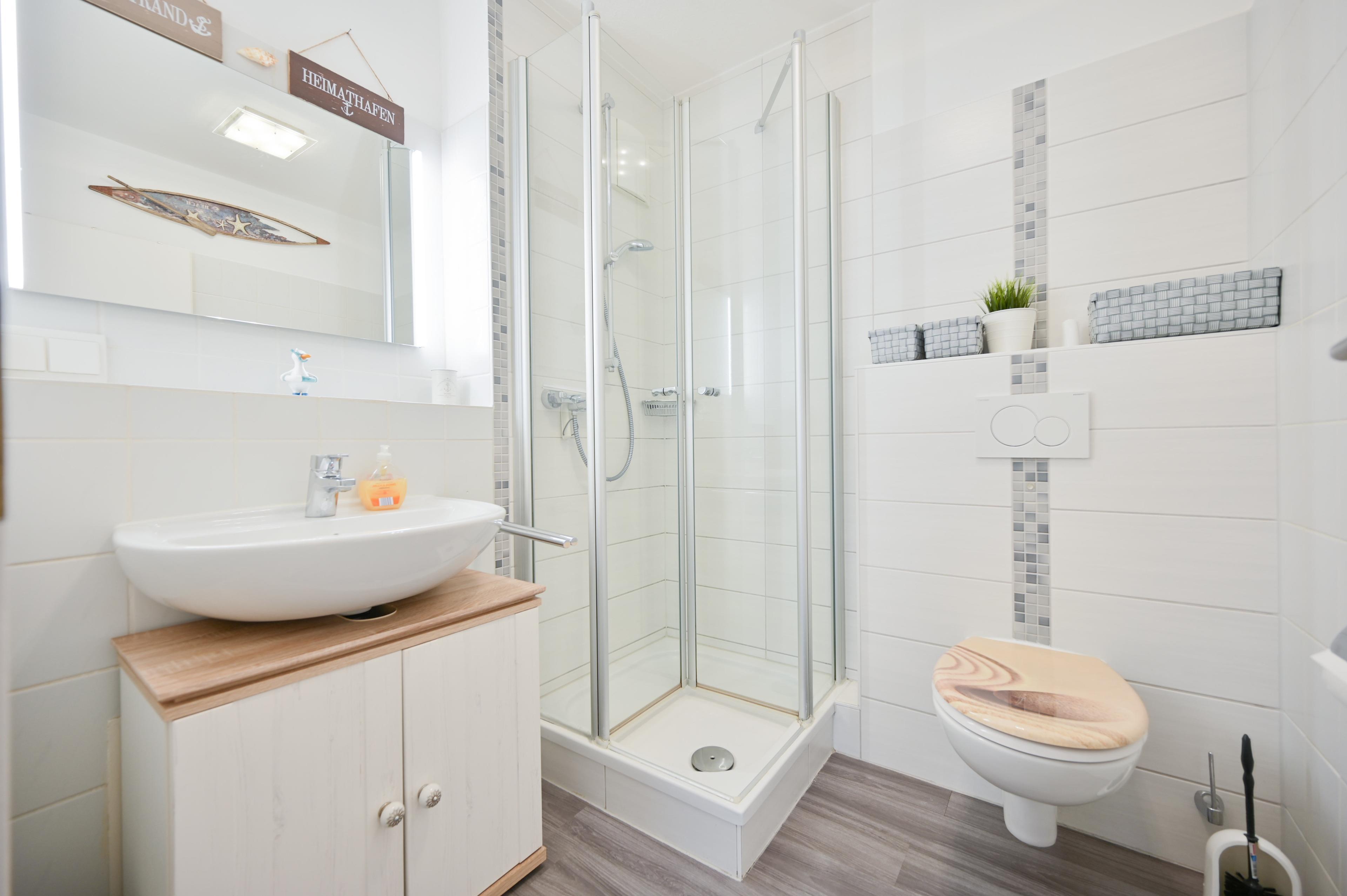 Das modernisierte Bad verfügt über ein WC, eine Dusche mit niedrigem Einstieg, helles Licht, einen großen beleuchteten Spiegel sowie einen Kosmetikspiegel, genügend Stauraum für eure Badutensilien und einen Fön.