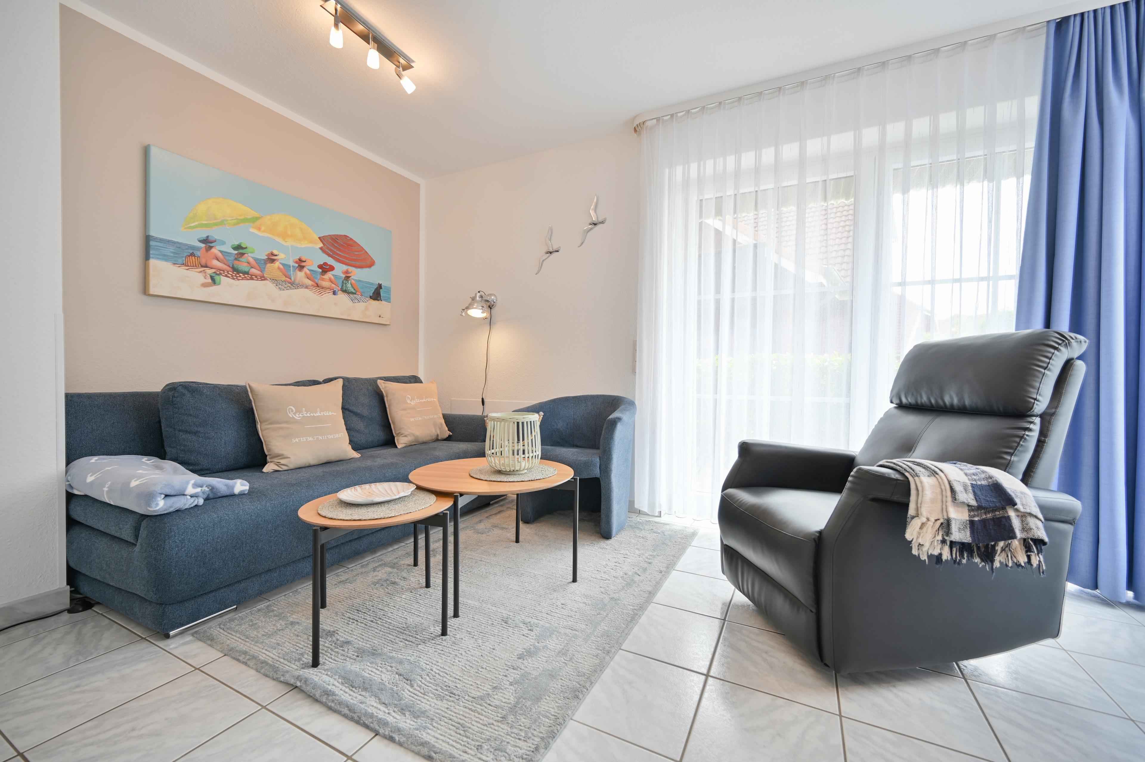 Die Fewo verfügt über einen Wohnschlafraum mit neuem Schlafsofa (150 x 200 cm mit extra Auflage), Relaxsessel und Leselampe, Couchtisch, Internetradio mit CD sowie Satelliten -Smart-TV.