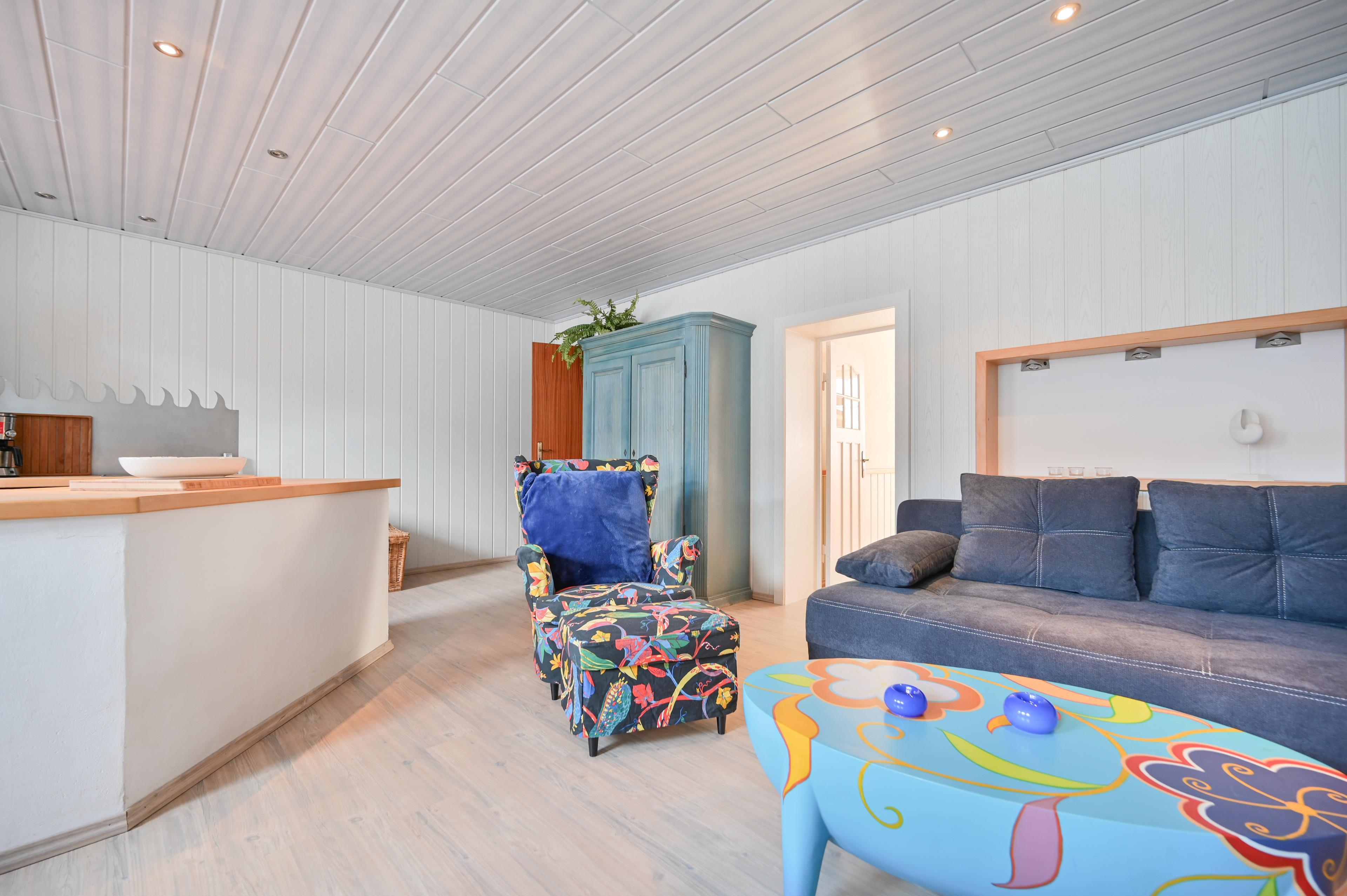 Der blaue Schrank und eine Truhe im Wohnbereich sind mit Reinigungs- und Ersatzmaterial für die Gäste verschlossen.