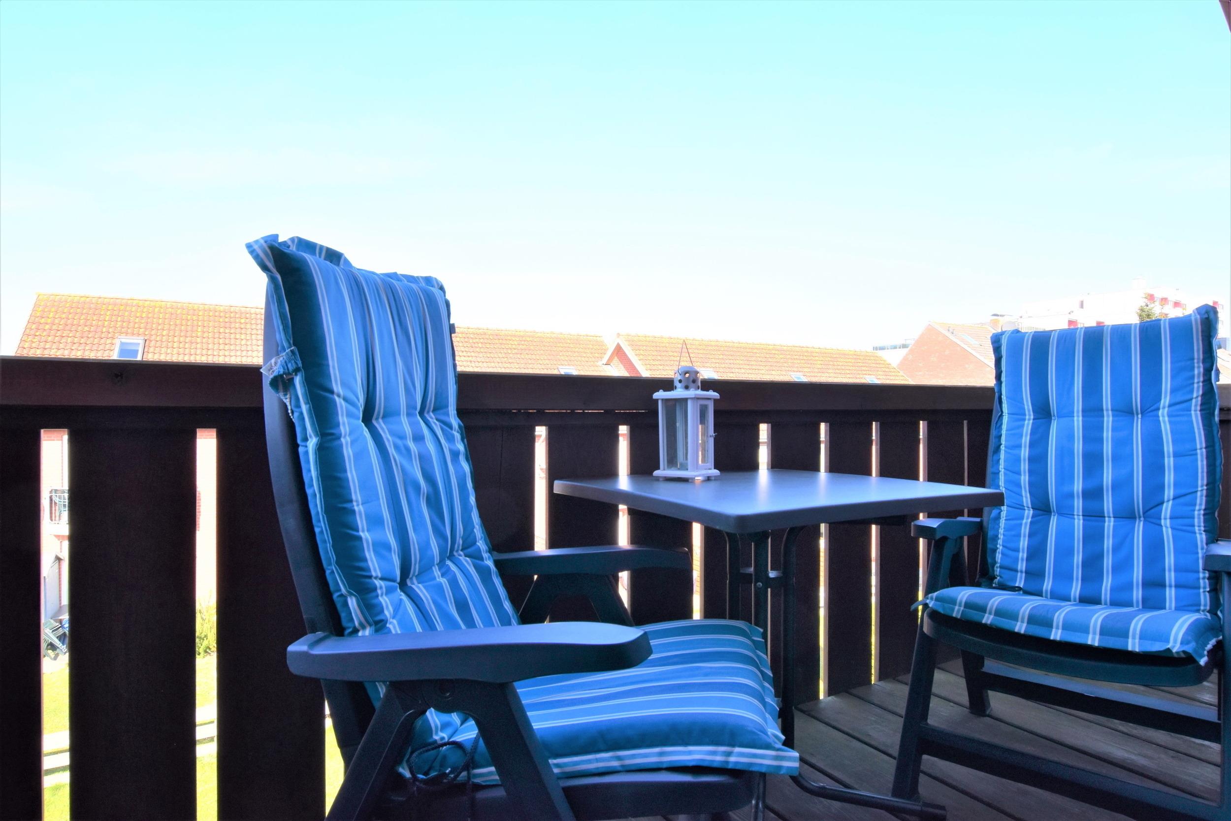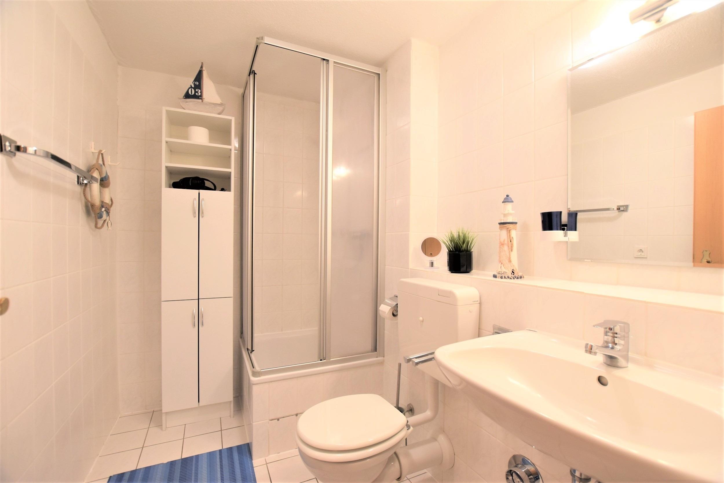 Der Dielenbereich ist ausgestattet mit einer Garderobe. Zudem verfügt die gemütliche Ferienwohnung über ein Bad mit Dusche und WC sowie einen möblierten Balkon.