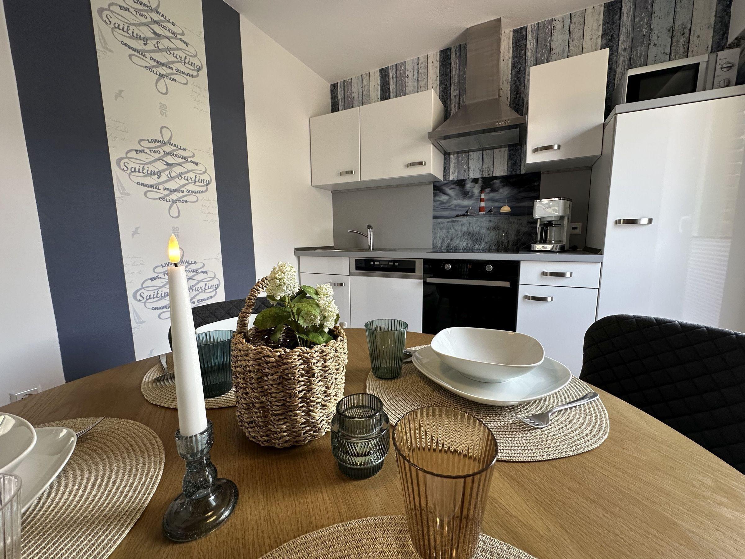 Im unteren Bereich des Hauses befindet sich eine offene Küchenzeile, mit Essbereich, dort finden Sie alles, was man im Urlaub benötigt. Diese ist mit USB-Steckdosen und einem Einbauradio zusätzlich ausgestattet.
