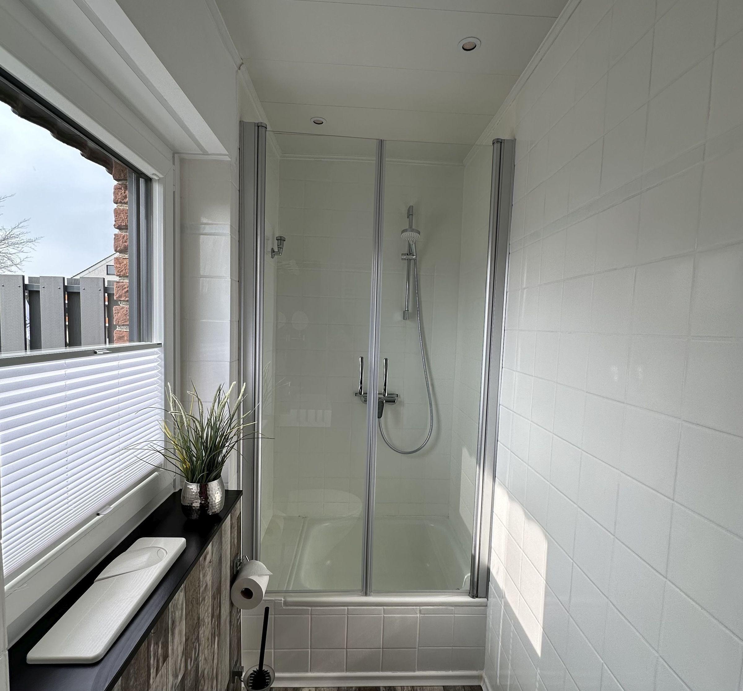 Ein kleines, aber feines Badezimmer mit Dusche, WC, Waschtisch, Wandhandtuchheizkörper, einem geräumigen Schrank für Kosmetika und Fußbodenheizung.