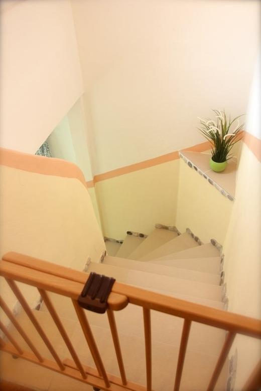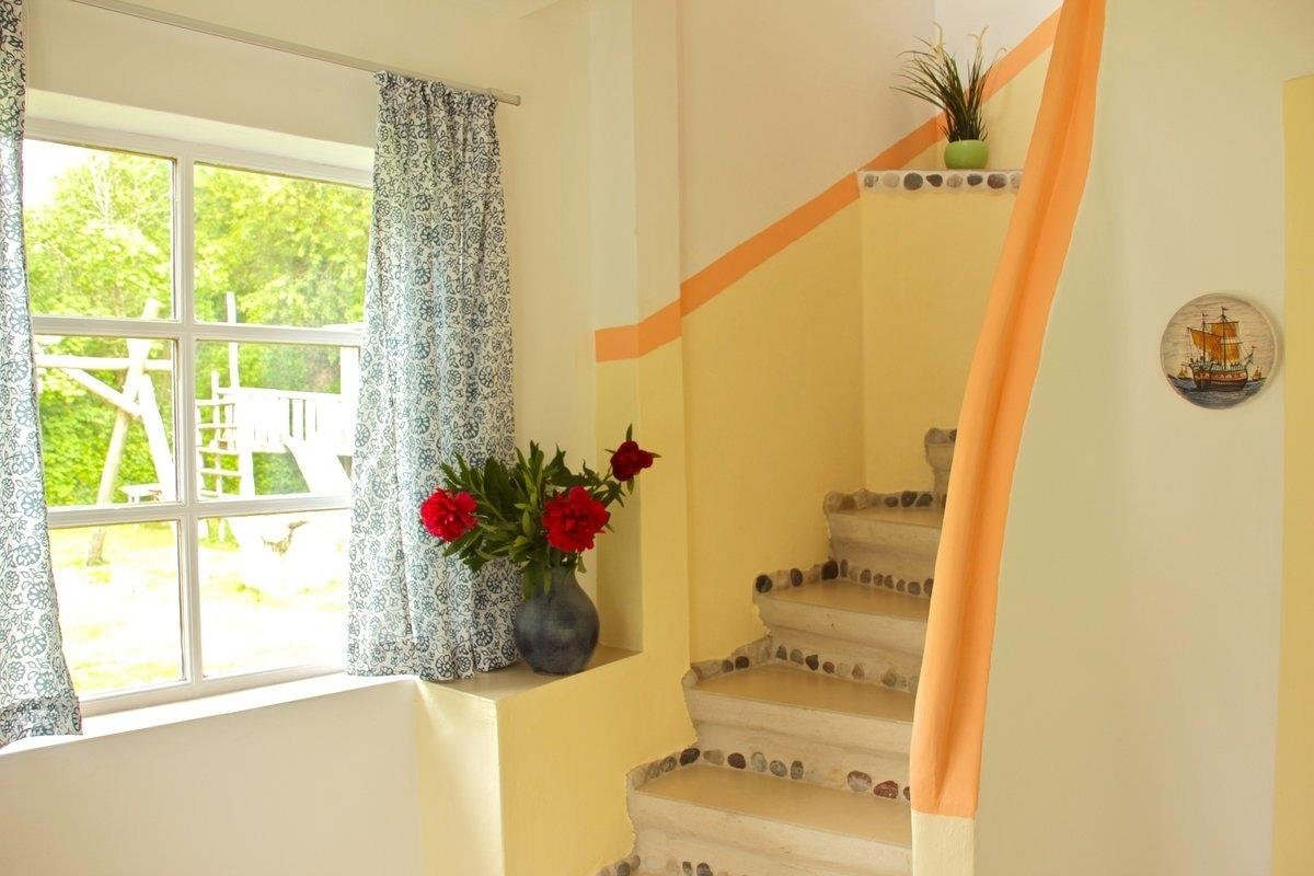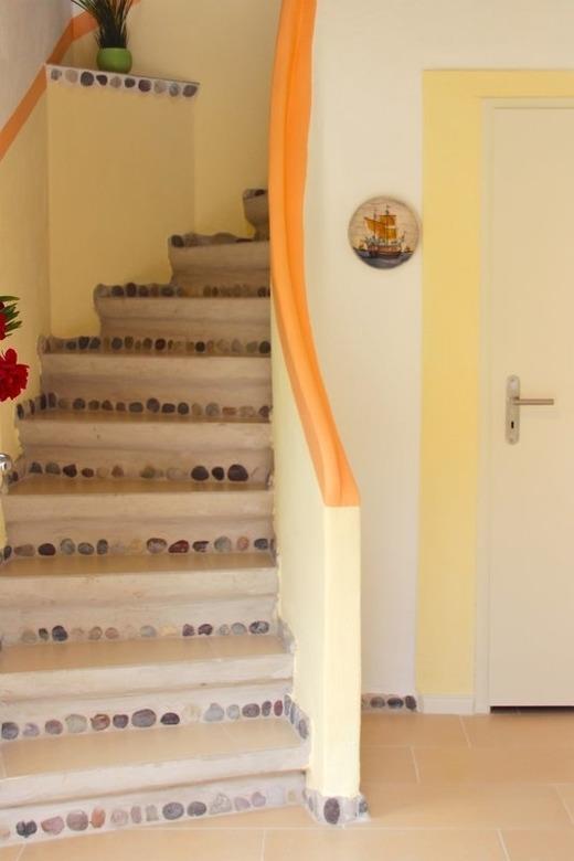 Diese reihenhausartige Wohnung mit insgesamt drei Schlafzimmern (2 Erwachsene und 3 Kinder) geht über zwei Etagen. Im Erdgeschoss findet sich ein offener Wohn- und Essbereich, eine kleine Küche mit Spülmaschine, das Bad mit Strandsteinapplikationen und ein Kinderzimmer mit einem Bett. Oben ist das Elternschlafzimmer und ein weiteres Kinderzimmer mit zwei Betten. Vor dem Haus ist eine große Terrasse mit Abendsonne.