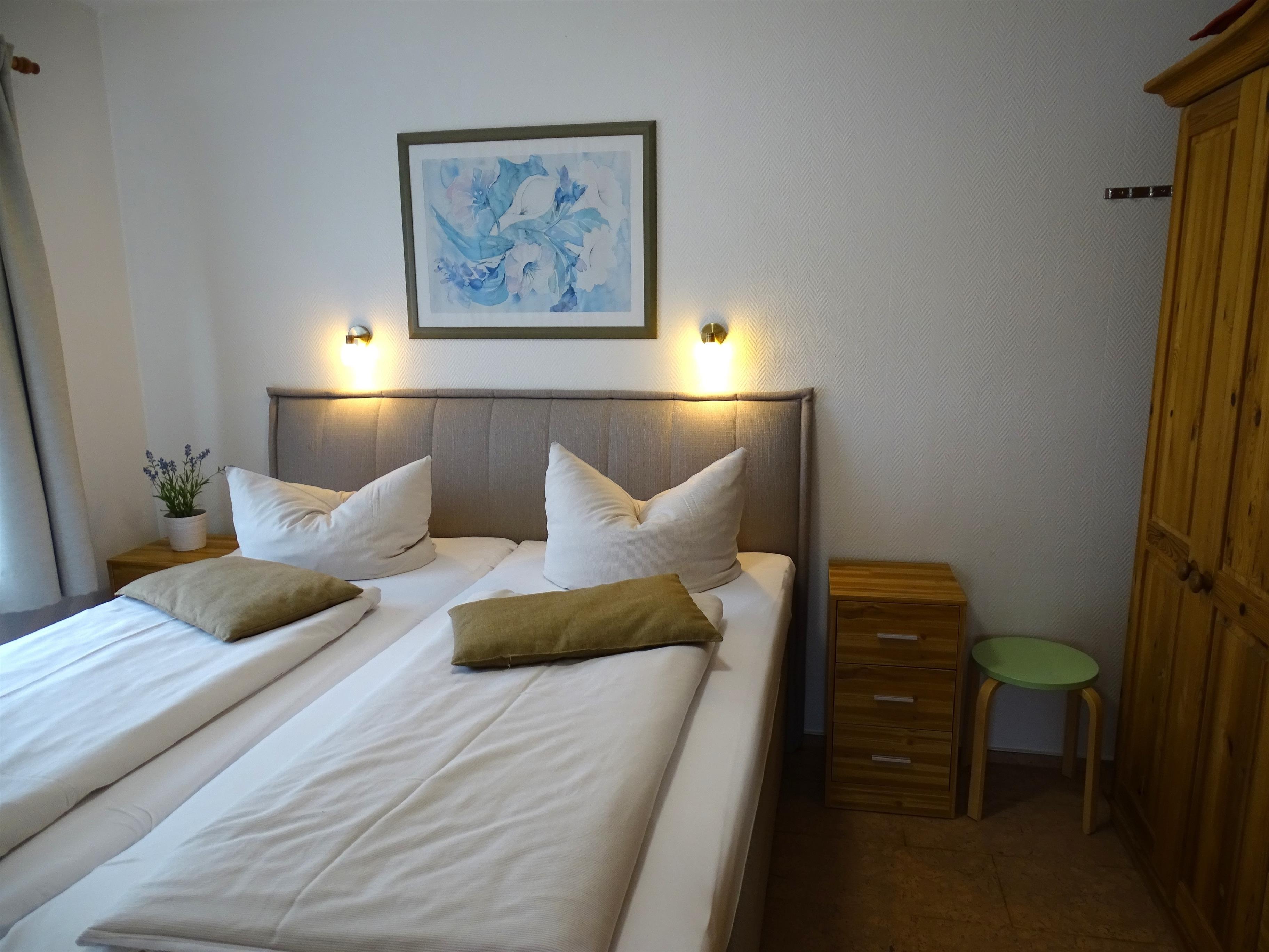 Aufteilung: Flur, Duschbad, Schlafzimmer mit 2 Einzelbetten, Schlafzimmer mit Boxspringdoppelbett, Wohnzimmer mit Zugang zur kleinen Küche mit Cerankochfeld, Backofen, Mikrowelle, Geschirrspüler, Wasserkocher, Kaffeemaschine. Weiter gibt es eine geschützte Terrasse.