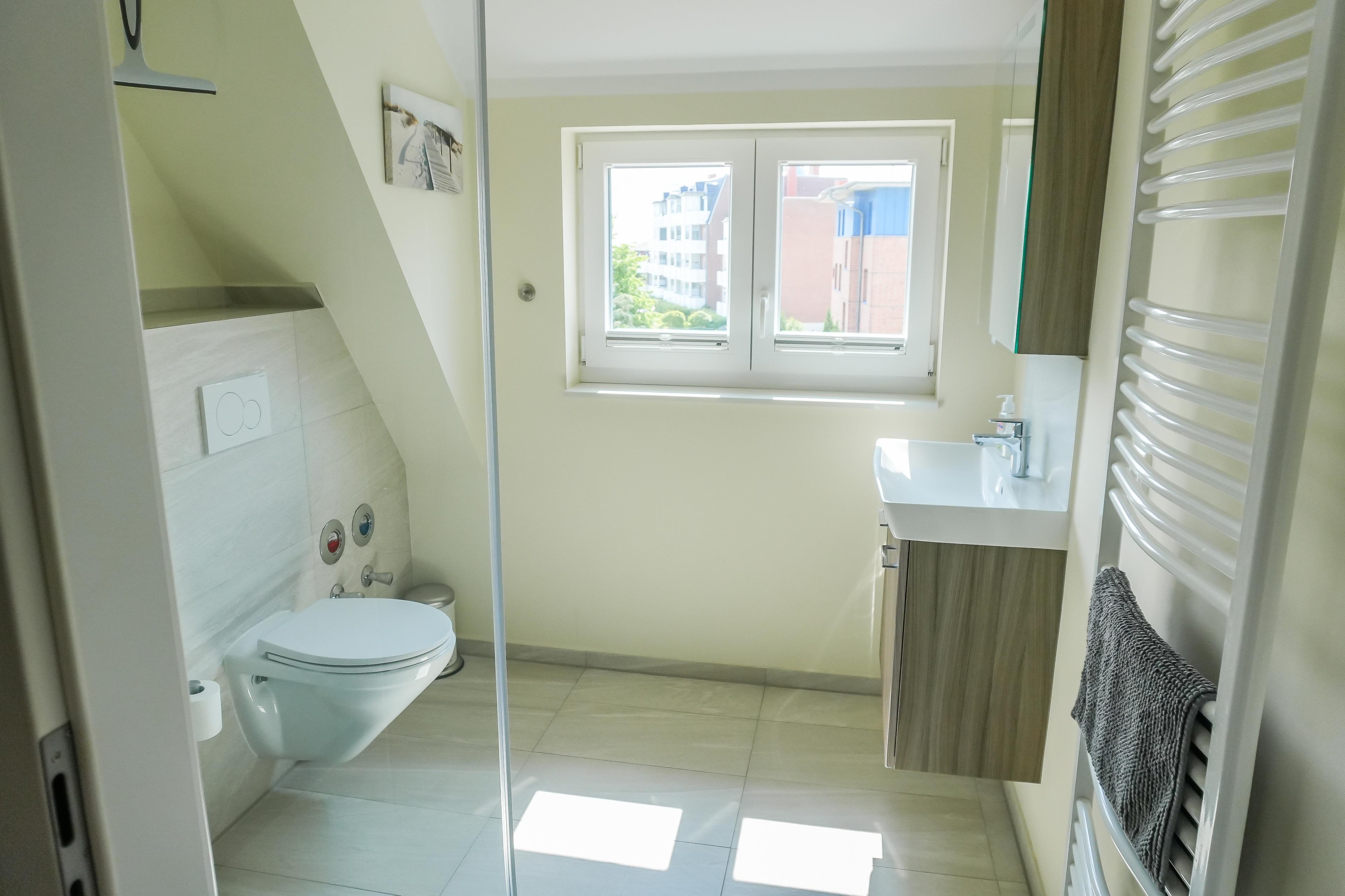 Das zweite Schlafzimmer (mit Meerblick) befindet sich im Dachgeschoss und ist mit 2 Einzelbetten (80x200) ausgestattet. Die Betten sind individuell verschiebbar . Schlafzimmerfensterverdunklung durch Plissees, vor dem großen Dachgeschossfenster steht eine kleine Sitzgruppe und diese lädt dazu ein, einen längeren Blick auf die Ostsee zu werfen.. (das 2 . Schlafzimmer ist innerhalb der Wohnung zu erreichen ). Im Bad befindet sich eine ebenerdige Dusche.