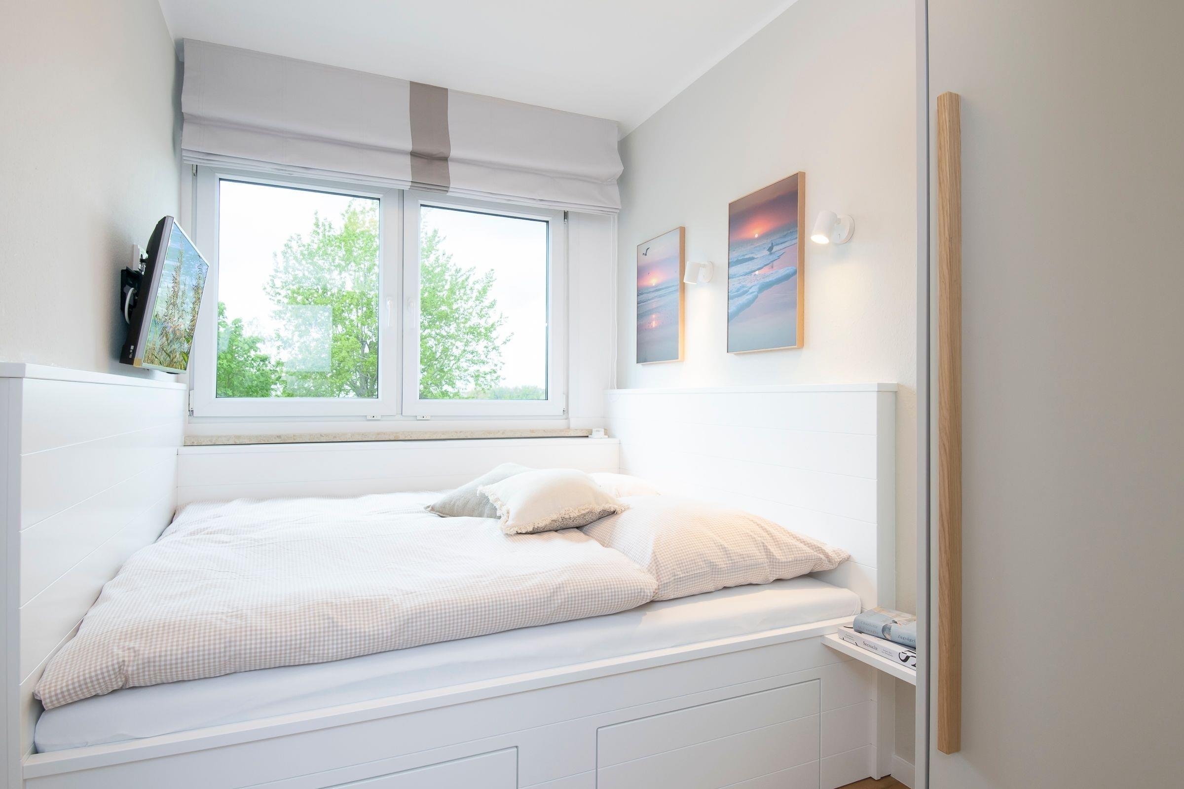 Schlafzimmer: 1 französisches Doppelbett (140x200 cm), TV, Verdunkelung (Rollos)