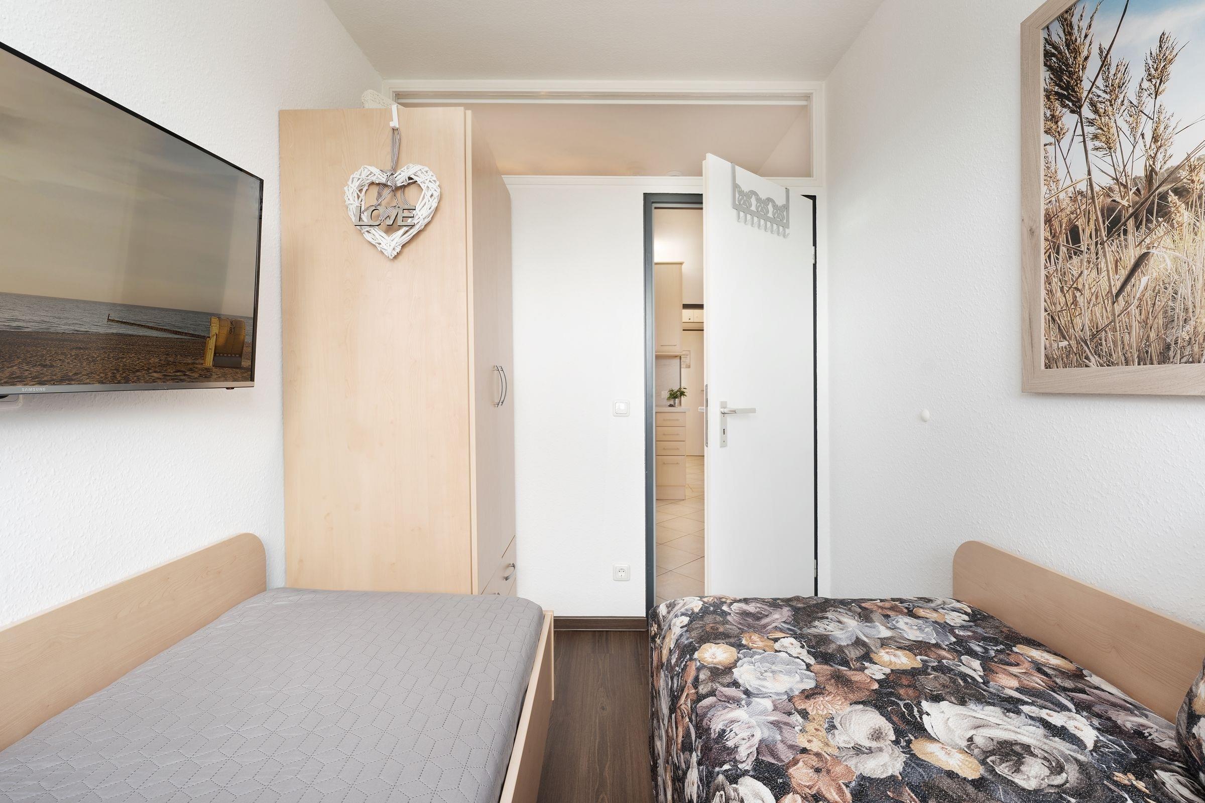 Schlafzimmer: 2 Einzelbetten (2x 80x200 cm), Kleiderschrank, Verdunkelung (Plissees)