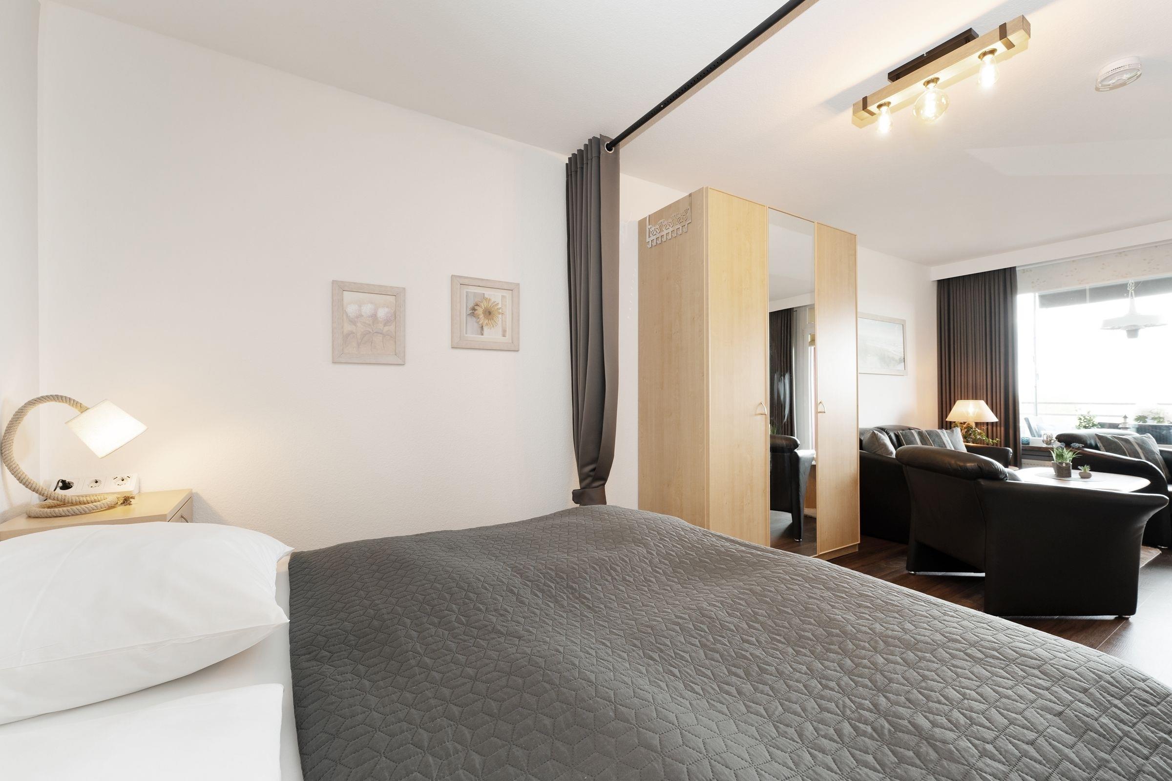 Wohn/ Schlafraum: 1 Doppelbett (2x 90x200 cm), TV, Kleiderschrank, Verdunkelung (Plissees)