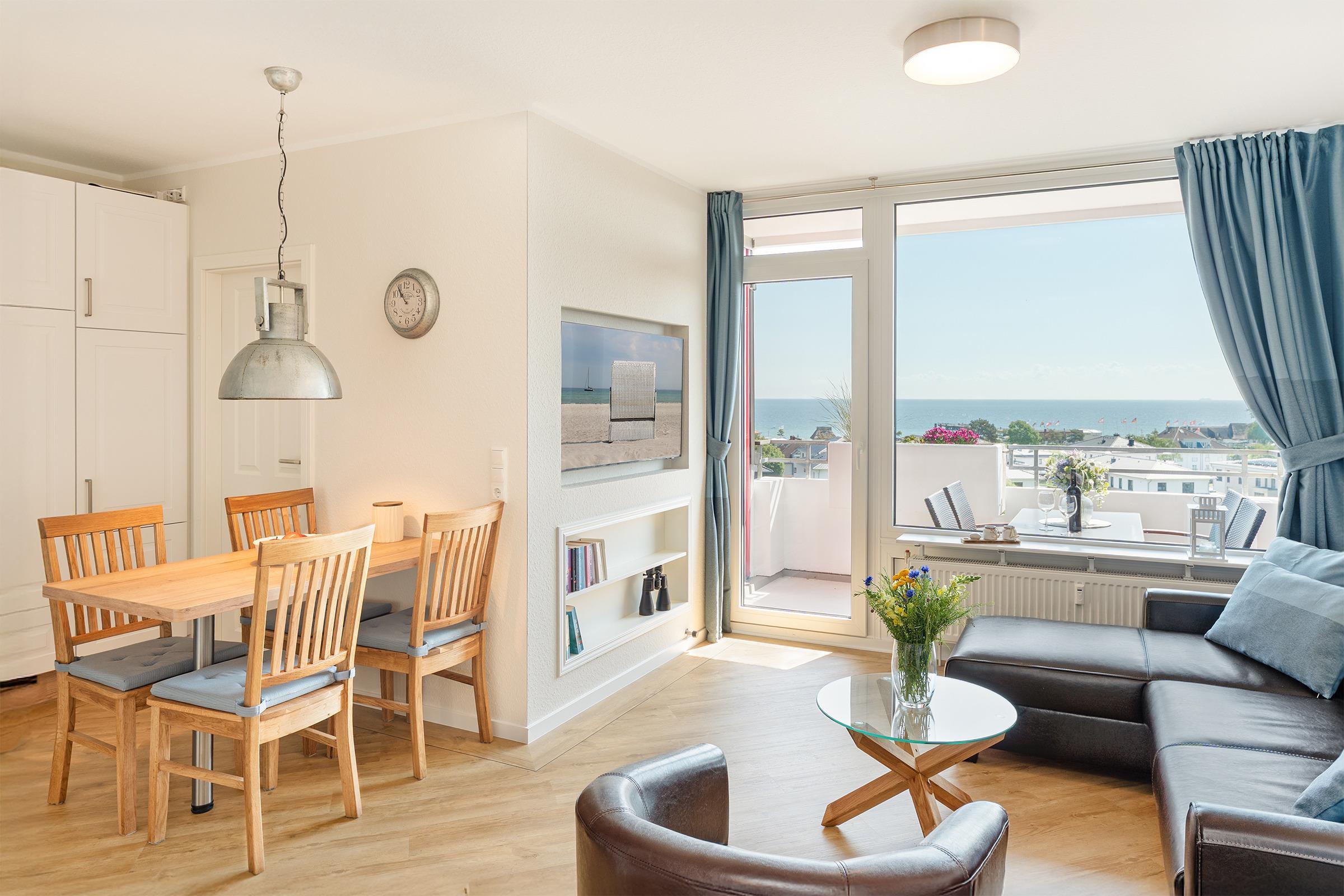 Die Ferienwohnung umfasst eine Wohnfläche von ca. 47m² , ist für bis zu 4 Personen geeignet und verfügt über einen großen Balkon. Der kombinierte Wohn-/Schlafbereich besticht durch geschmackvolles Ambiente. Das Elternbett (2x 90x200 cm) hat eine bequeme Komforthöhe. Das separate Schlafzimmer mit zusätzlichem Smart-TV bietet einen weiteren komfortablen Schlafplatz für bis zu 2 Personen im Kojenbett (je 80x200 cm). Auch von hier genießen Sie einen herrlichen Blick aufs Meer. Die große offene Küche ist sehr gut ausgestattet, ein Geschirrspüler erleichtert den Urlaubsalltag. Im Badezimmer setzt sich das moderne Design fort. Im Wohnzimmer verfügt der große Smart TV über viele Programme in HD-Qualität. Kostenloses, schnelles WLAN ist selbstverständlich.