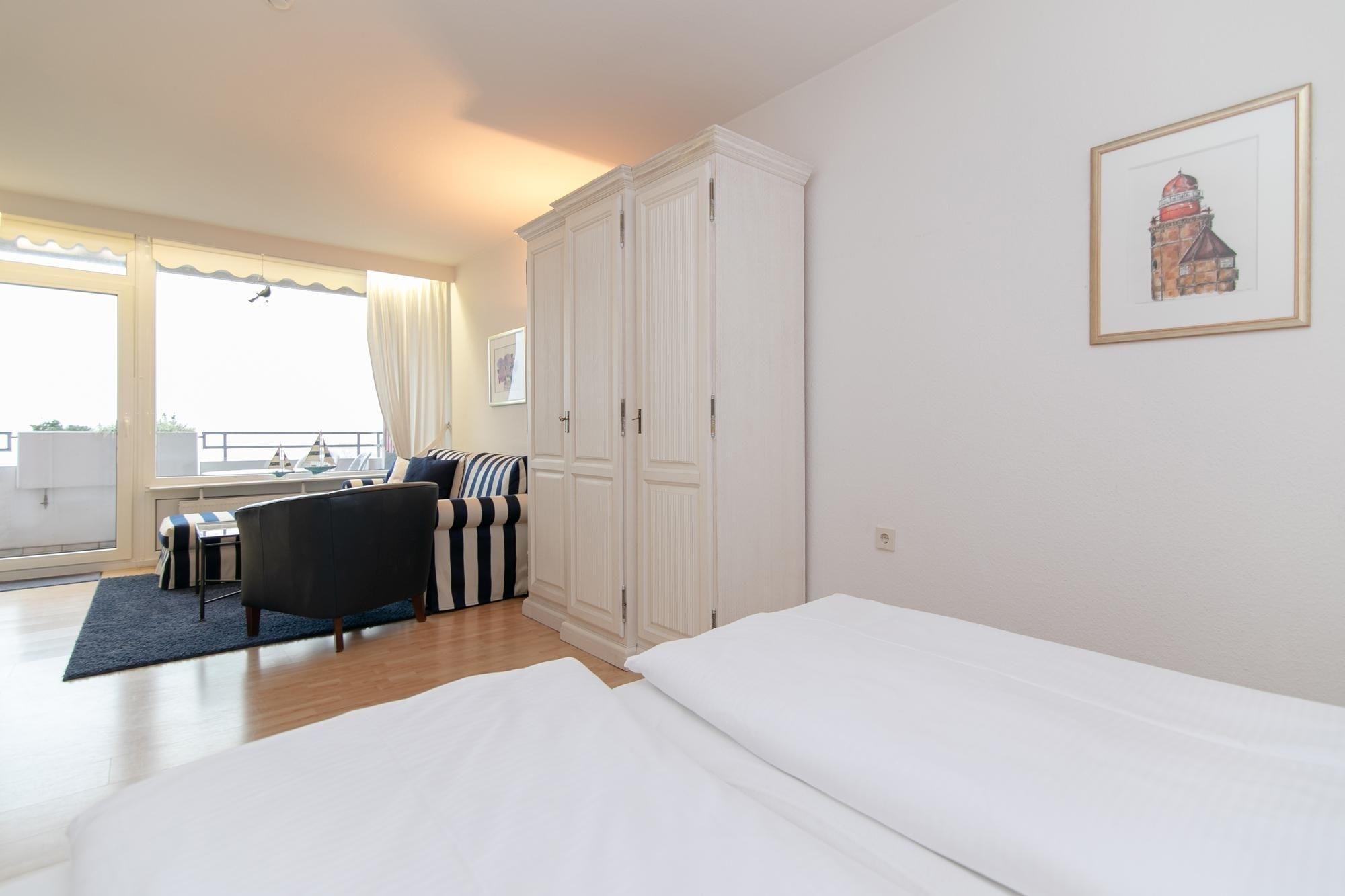 Diese Wohnung setzt Maßstäbe in Bezug auf Ausstattung, Farben und Einrichtung. Der kombinierte Wohn-/Schlafraum ist in maritimem blau und weiss gehalten, von hier aus haben Sie einen fantastischen Blick über die Dächer von Dahme auf die Ostsee.