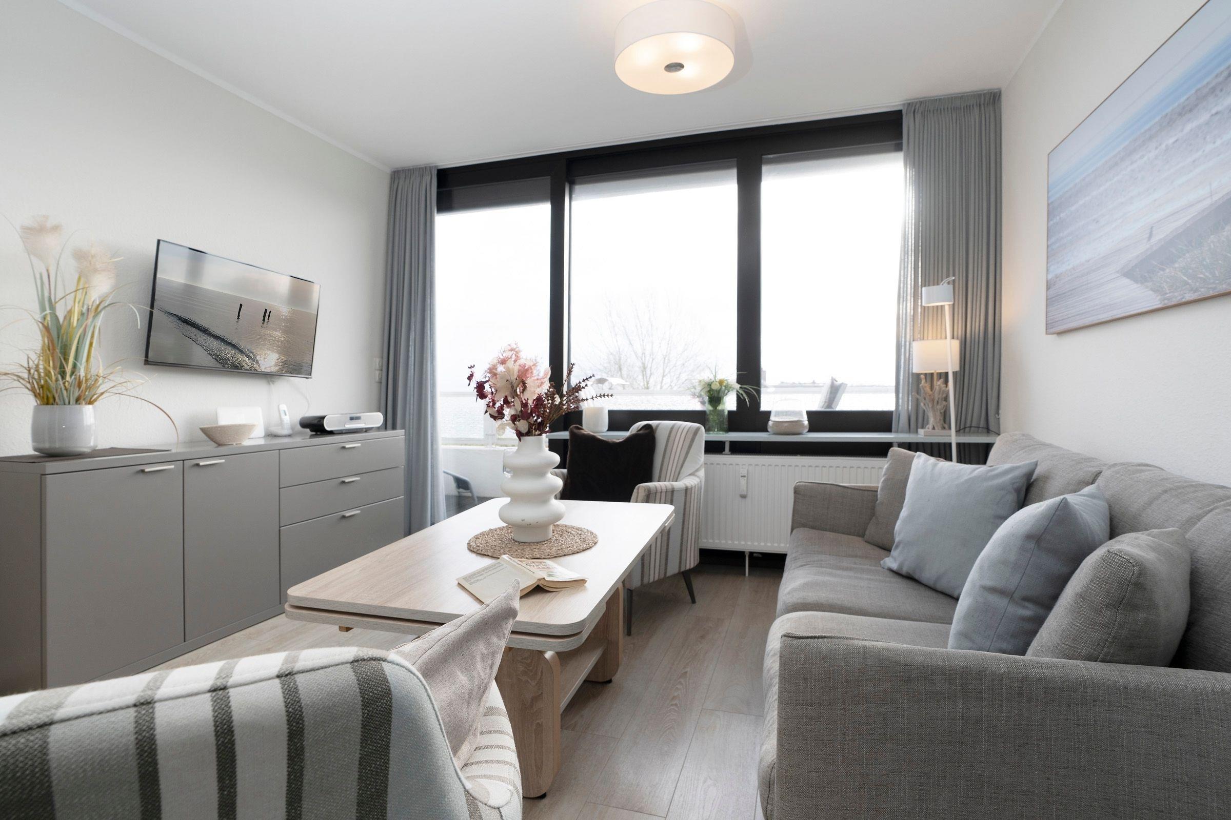 Bequem mit dem Fahrstuhl erreichen Sie diese stylisch und gemütlich modern eingerichtet Wohnung. Der lichtdurchflutete Wohn-/ Schlafraum ist optimal aufgeteilt: In einem Bereich befinden sich zum Entspannen ein bequemes Sofa, zwei Sessel und ein TV-Gerät. Hier können Sie auch den möblierten Balkon betreten und die gute Seeluft genießen. Saisonal bedingt können Sie sogar in der Ferne die Ostsee sehen. In dem hinteren Bereich des Raumes steht ein Boxspringbett (180x200 cm), das für geruhsame Nächte sorgt. Zwei weitere Schlafmöglichkeiten bietet das Kinderzimmer, das mit zwei hintereinander stehenden Betten (je 90x200 cm) ausgestattet ist. In der separaten Küche können Sie nach Herzenslust Ihre Lieblingsspeisen zubereiten. Eine Spülmaschine erledigt daraufhin den Abwasch. Das innenliegende, komfortable Badezimmer lässt Sie erfrischt und munter in den neuen Urlaubstag starten.