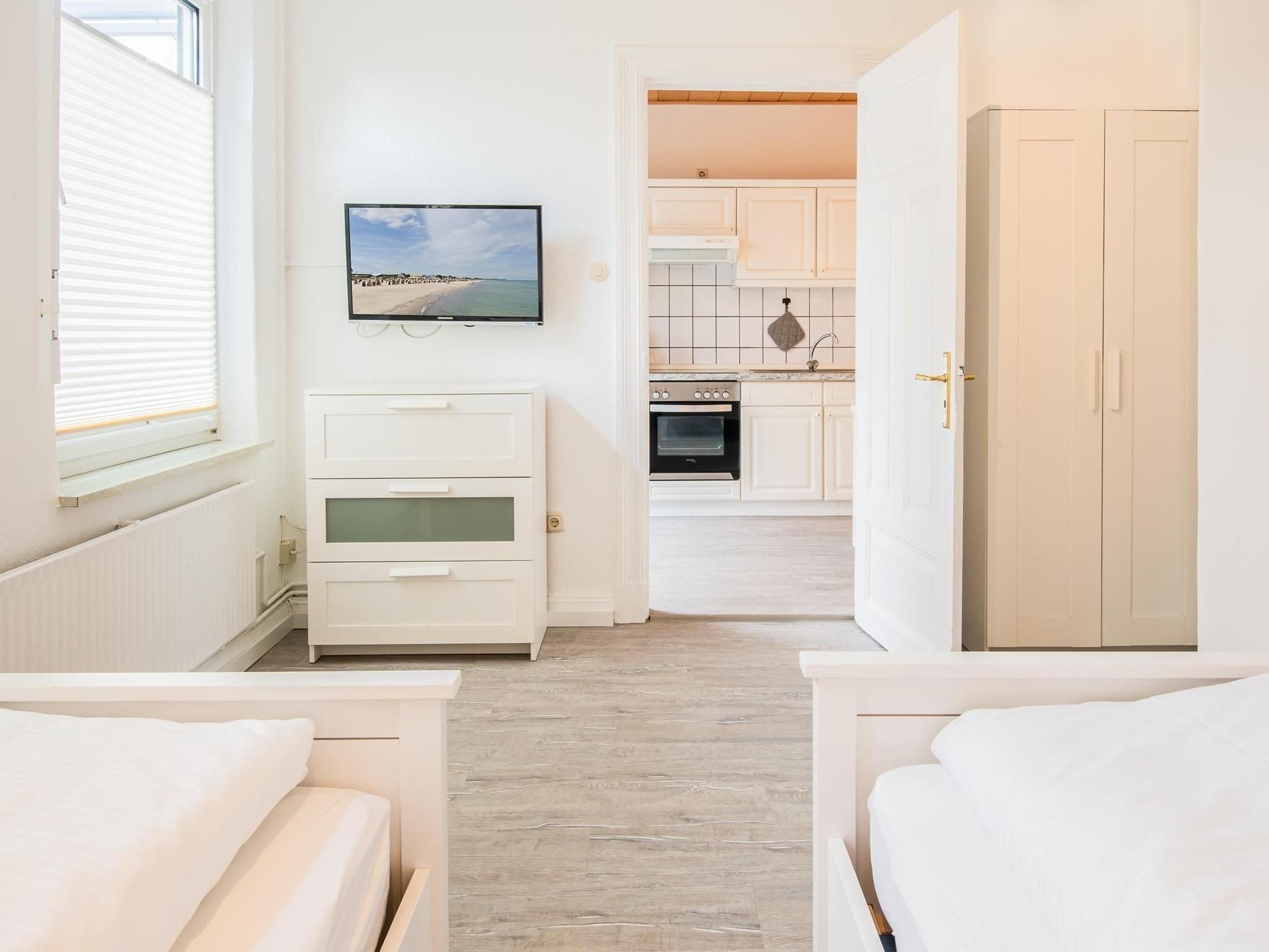 Schlafzimmer: 2 Einzelbetten (je 90x200 cm), TV, Kleiderschrank, Verdunkelung (Plissees)