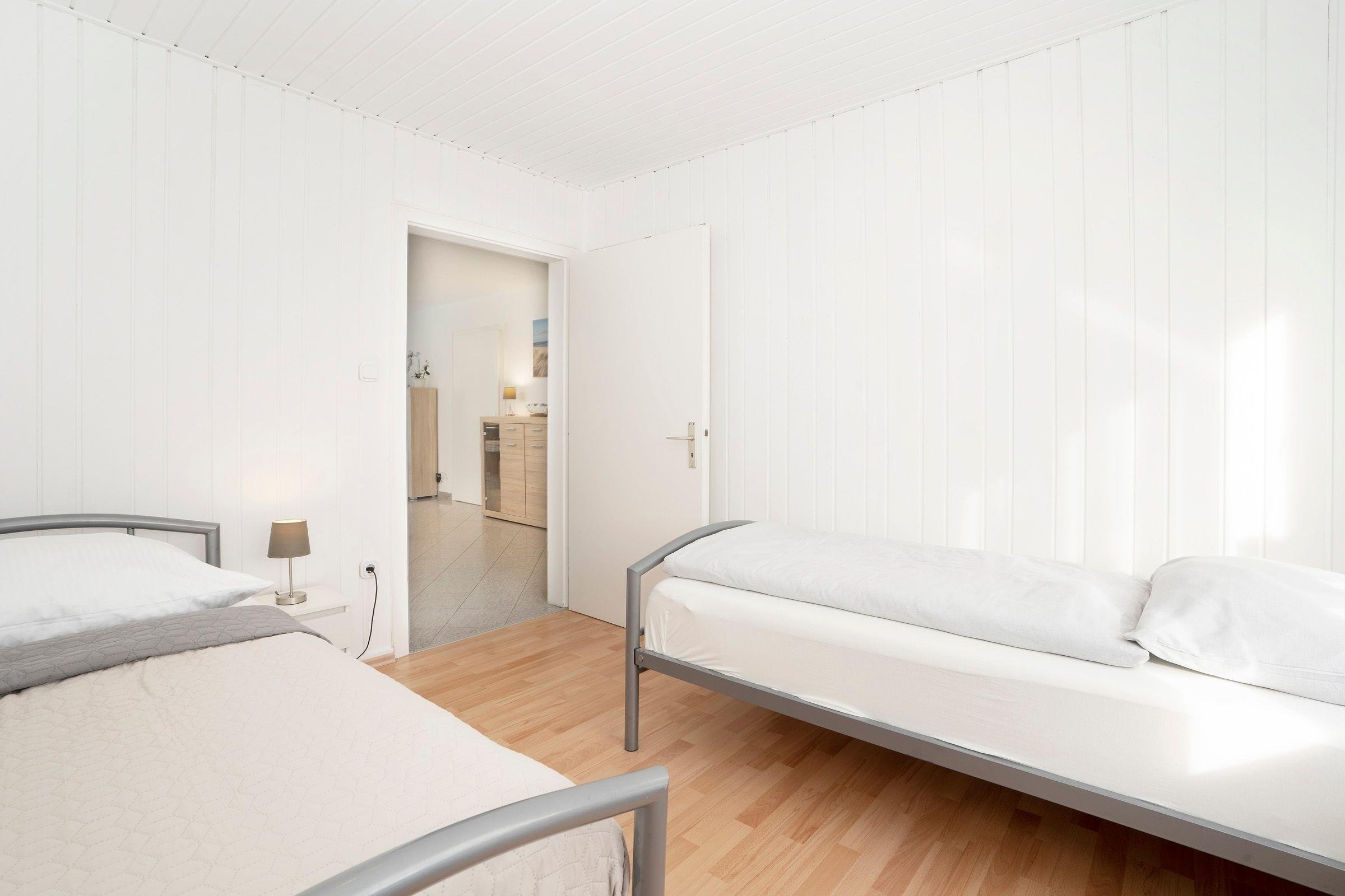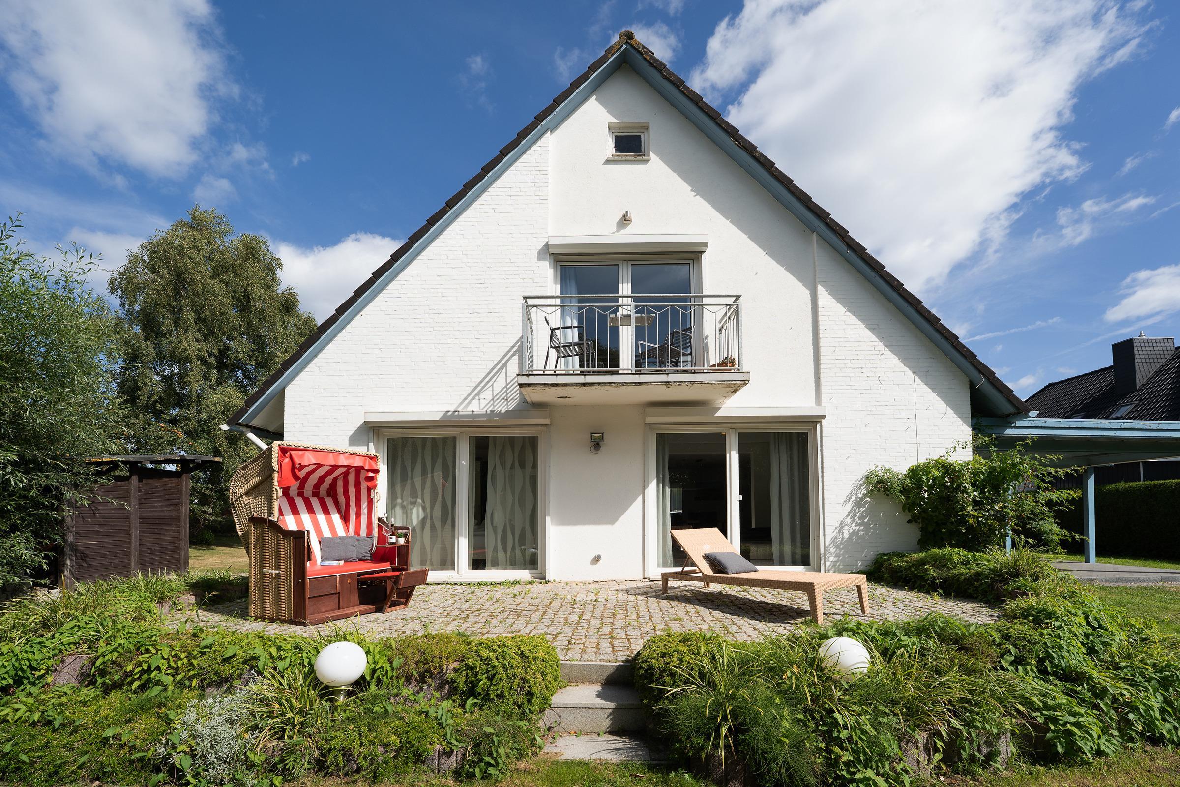 Der lichtdurchflutete Wohnraum ist offen gestaltet - ein Essplatz mit 4 wertigen Stühlen, sowie eine zusätzliche Bank, laden zu geselligen Runden ein und auf der lauschigen Sofalandschaft mit großem Flachbild-TV kann man es sich nach langen Strandtagen gemütlich machen. Von hier aus haben Sie direkten Zugang zum Garten und zwei eigenen Terrassen - eine große überdachte Terrasse und eine weitere mit einem Strandkorb in dem Sie die herrliche Abendsonne genießen können. Das Elternschlafzimmer ist mit komfortablem Doppelbett (2x 80x200 cm), Sideboard und 3-türigem Kleiderschrank ausgestattet, hier gibt es also reichlich Stauraum für Ihre Urlaubskleidung. Das zweite Schlafzimmer ist mit 2 Einzelbetten (je 90x200 cm), Nachttischen und Leseleuchten eingerichtet, zusätzlich hat ein Kinderbett in diesem Zimmer Platz. Von diesem Schlafzimmer aus hat man Zugang zum großen Badezimmer mit Badewanne und Dusche. Beide Schlafzimmer lassen sich durch Außenrollläden abdunkeln. Die Ferienwohnung verfügt zudem über ein weiteres Badezimmer mit Dusche, WC und Wasch-Trockner. Die separate, gut ausgestattete, Küche verfügt über Annehmlichkeiten wie eine Senseo-Kaffeemaschine, eine Kühl-Gefrierkombination und eine Spülmaschine. Von der Küche führt ebenfalls eine Tür direkt in den Garten.