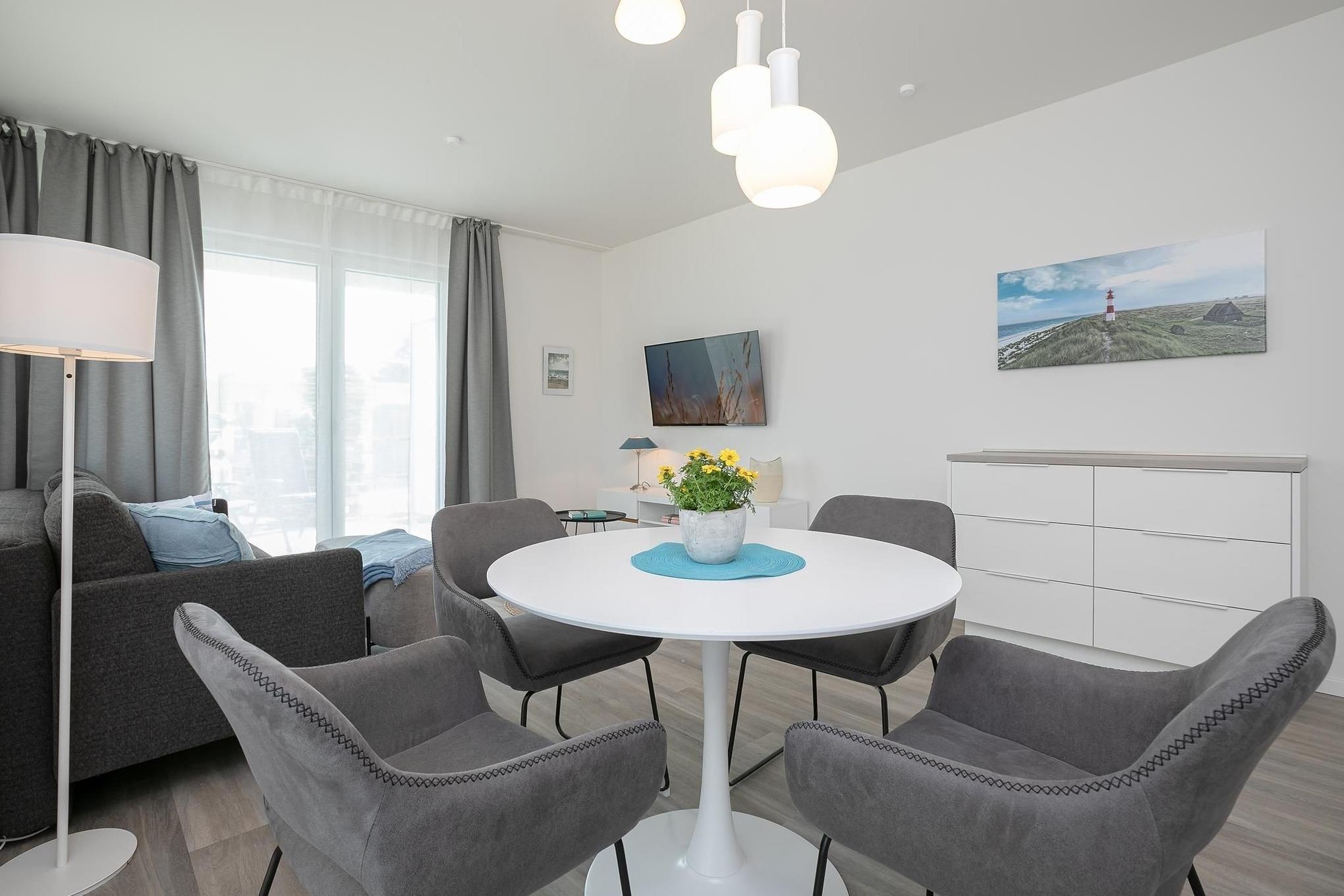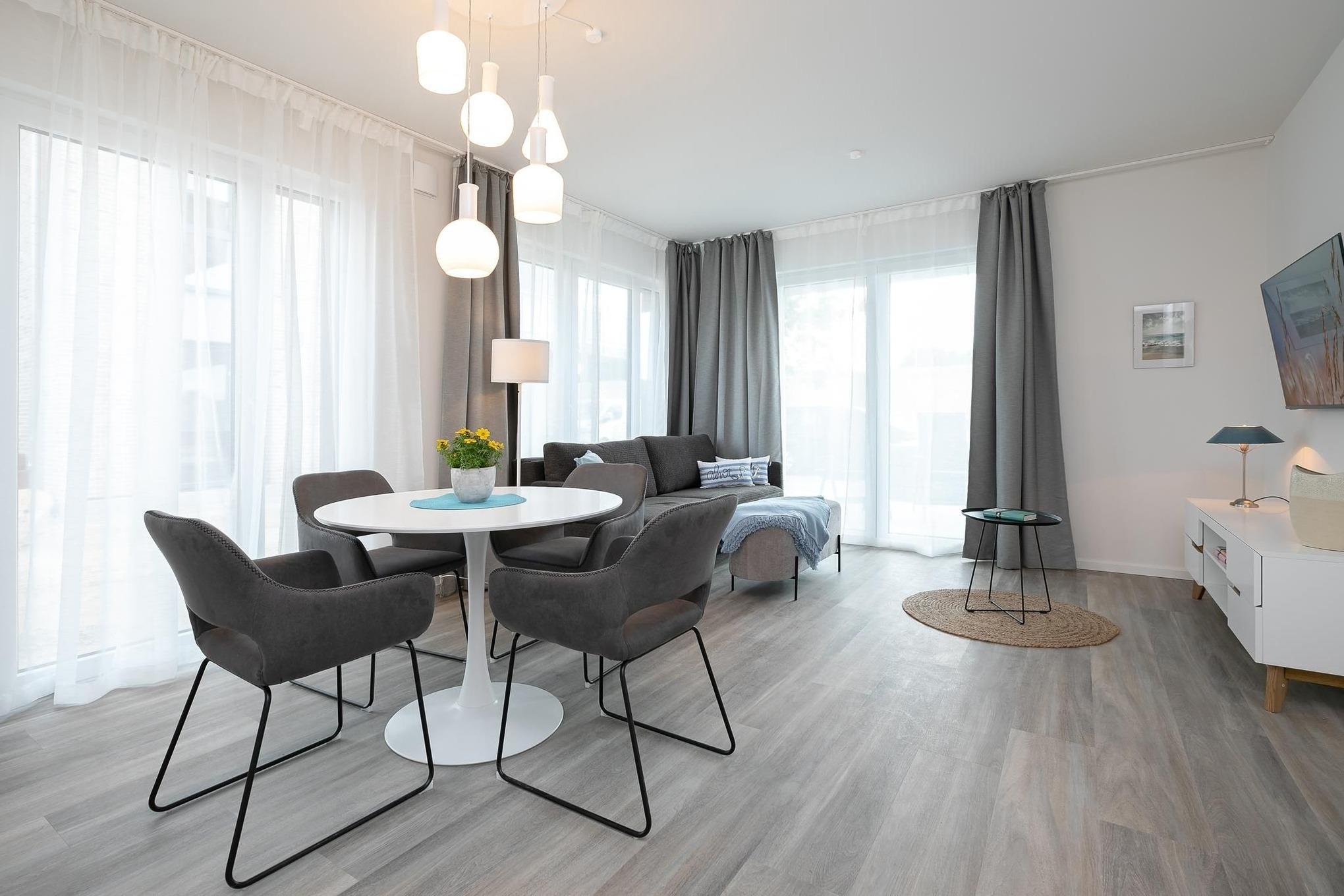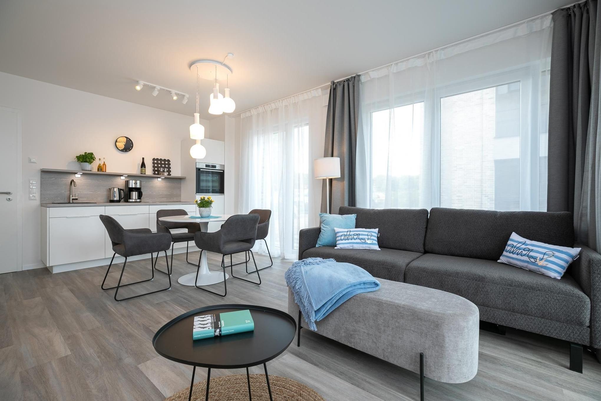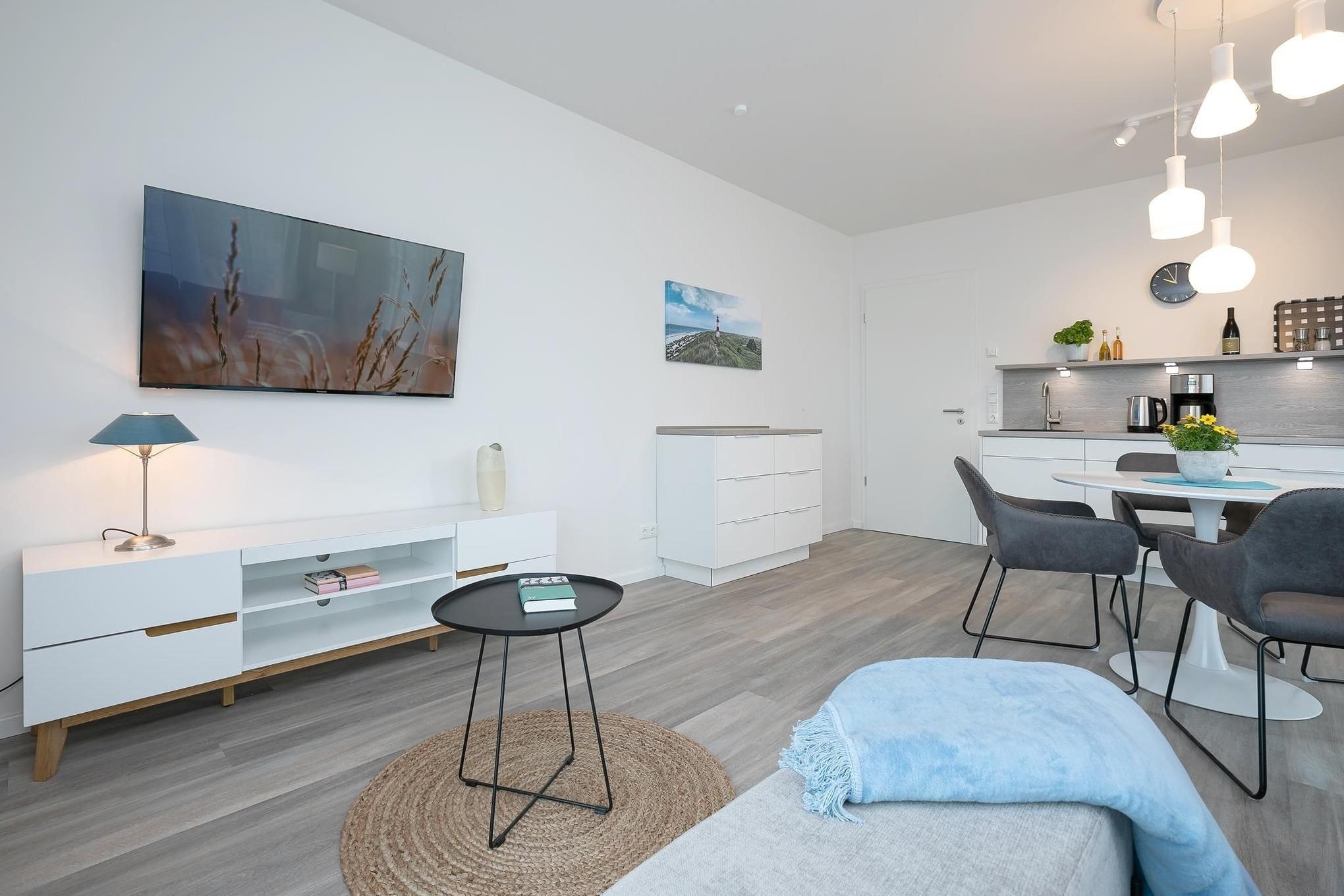 Treten Sie ein in den offen gestalteten Wohnraum mit integrierter, moderner Küchenzeile, Esstisch für 4 Personen, gemütlicher Schlafcouch (160x200 cm) und TV. Das moderne Interieur erstreckt sich stilsicher durch die gesamte Wohnung. Vom lichtdurchfluteten Wohnzimmer gelangen Sie in alle Räume und zur möblierten Terrasse. Vergessen Sie den Alltag bei einem ausgiebigen Frühstück mit heißem Kaffee während Sie die ersten Sonnenstrahlen genießen. Erholsame Nächte bietet das komfortable Boxspring-Doppelbett (160x200 cm, durchgehender Topper) im separaten Schlafzimmer mit TV. Ihre Urlaubsbekleidung findet in dem sehr geräumigen Kleiderschrank reichlich Platz für den gesamten Aufenthalt. Das helle und elegante Tageslichtbad besticht mit bodentiefer Dusche und Handtuchheizung.