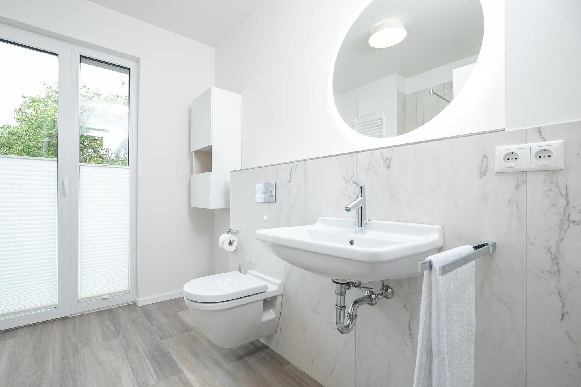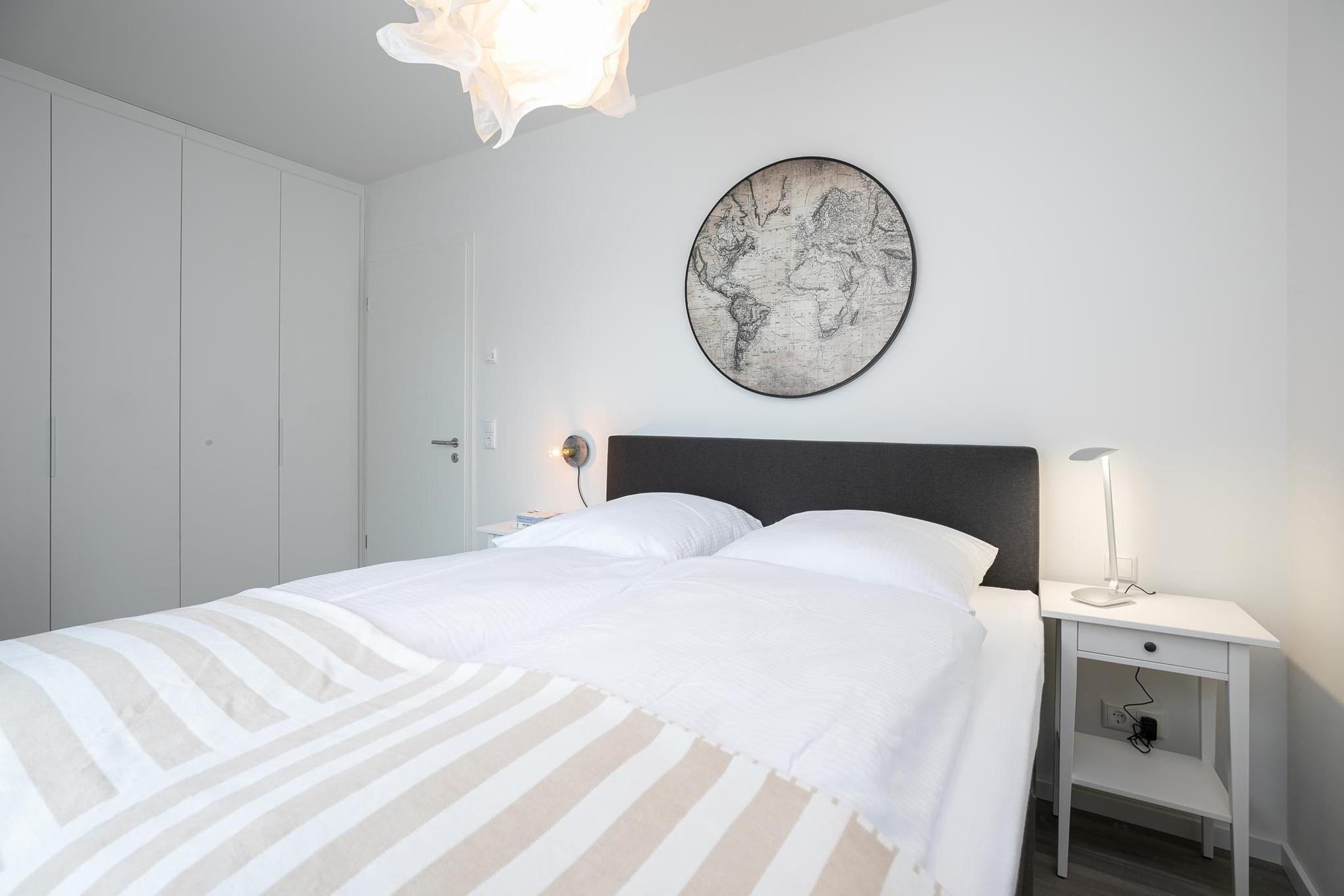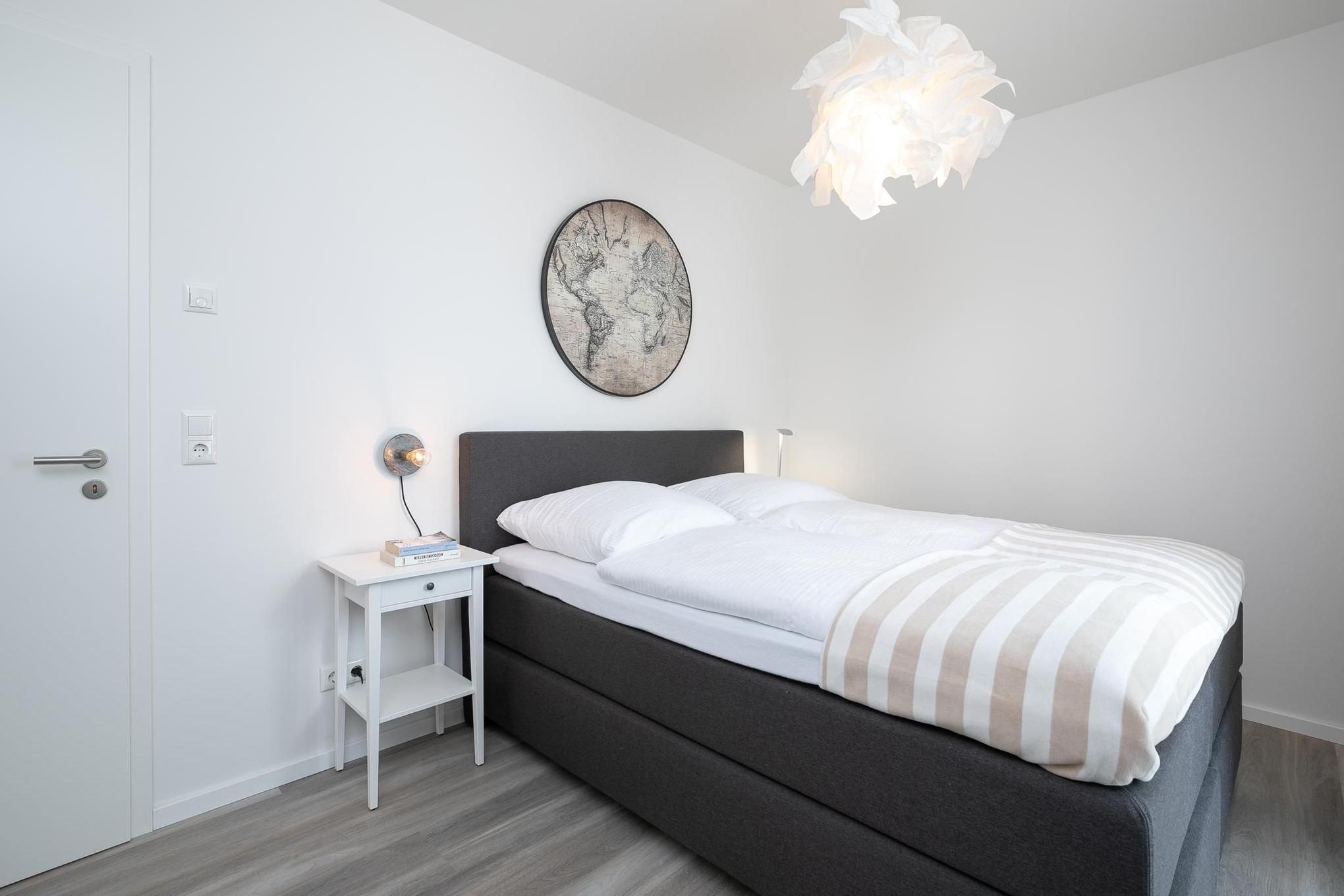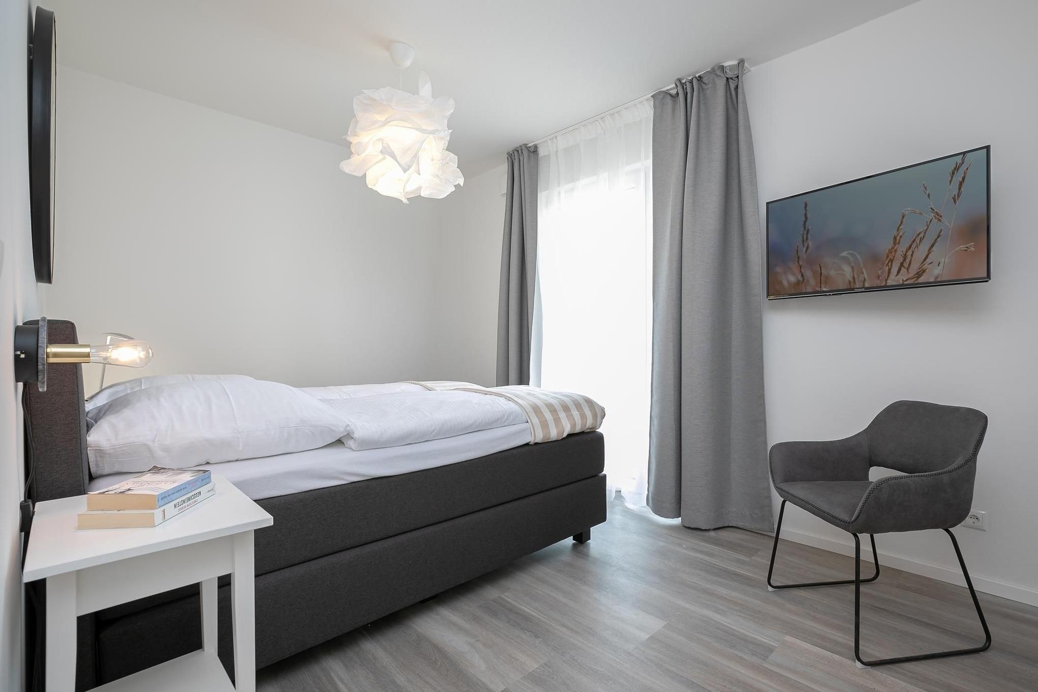 Treten Sie ein in den offen gestalteten Wohnraum mit integrierter, moderner Küchenzeile, Esstisch für 4 Personen, gemütlicher Schlafcouch (160x200 cm) und TV. Das moderne Interieur erstreckt sich stilsicher durch die gesamte Wohnung. Vom lichtdurchfluteten Wohnzimmer gelangen Sie in alle Räume und zur möblierten Terrasse. Vergessen Sie den Alltag bei einem ausgiebigen Frühstück mit heißem Kaffee während Sie die ersten Sonnenstrahlen genießen. Erholsame Nächte bietet das komfortable Boxspring-Doppelbett (160x200 cm, durchgehender Topper) im separaten Schlafzimmer mit TV. Ihre Urlaubsbekleidung findet in dem sehr geräumigen Kleiderschrank reichlich Platz für den gesamten Aufenthalt. Das helle und elegante Tageslichtbad besticht mit bodentiefer Dusche und Handtuchheizung.