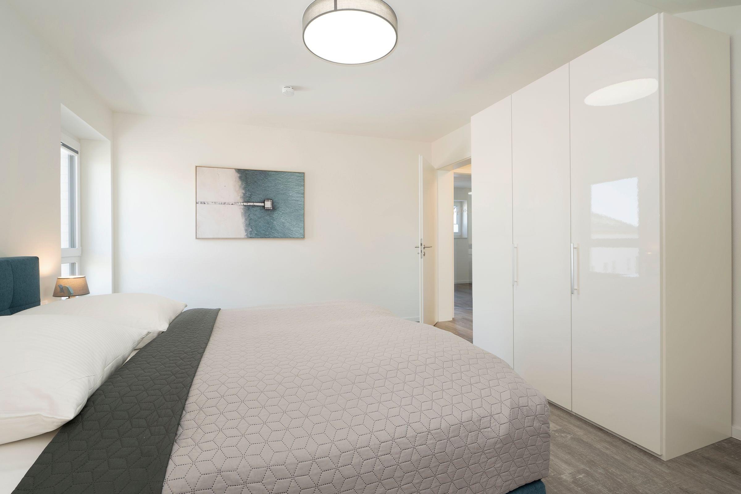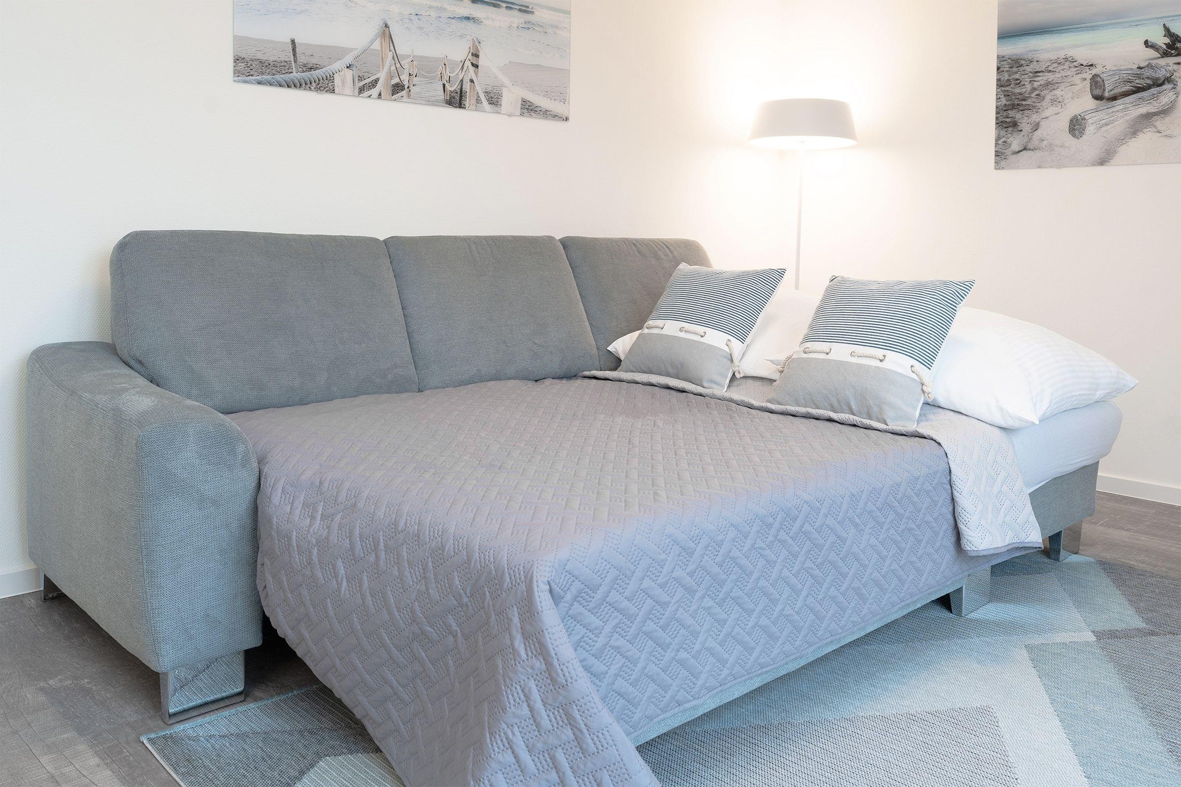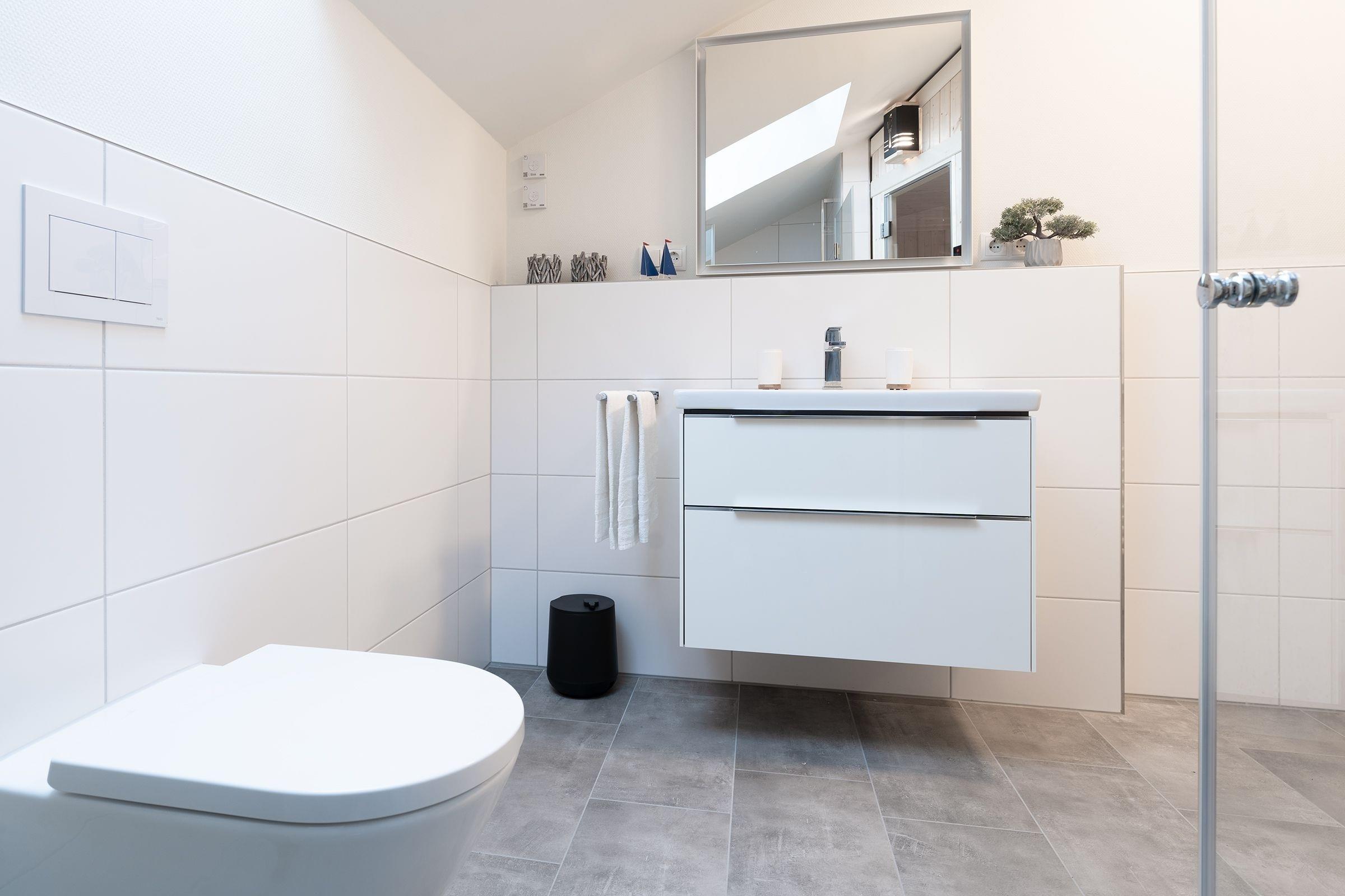 Nach langen Strandspaziergängen und einem Saunagang entspannt es sich ganz hervorragend in dem komfortablen Boxspringbett (ca. 180x200cm). 2 weitere Gäste können es sich hier auf einem weiteren Schlafsofa bequem machen (ca. 140 x 200 cm). Auch das Tageslichtbad wird Sie mit seinem klaren Design und großzügiger, ebenerdiger Dusche mit charmantem Oberlicht überzeugen.